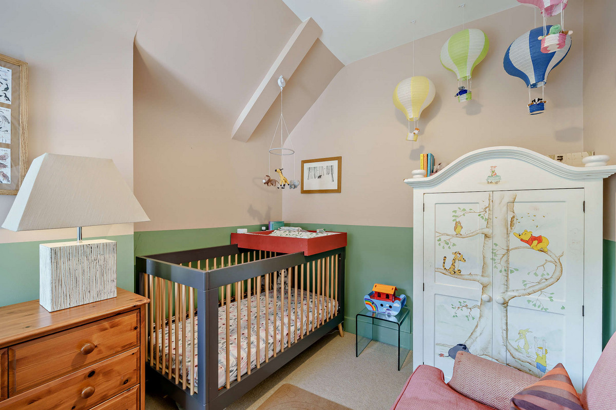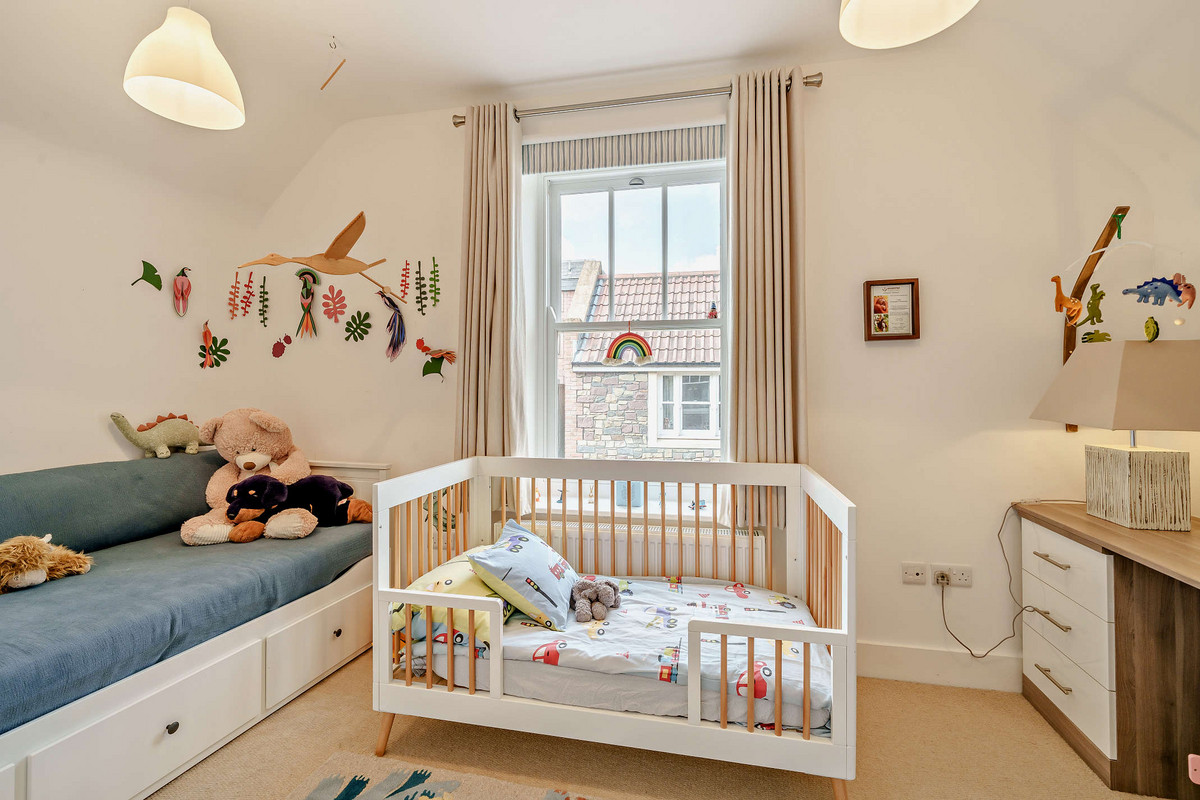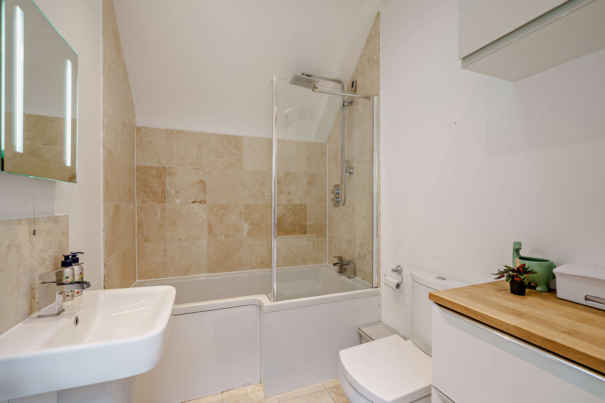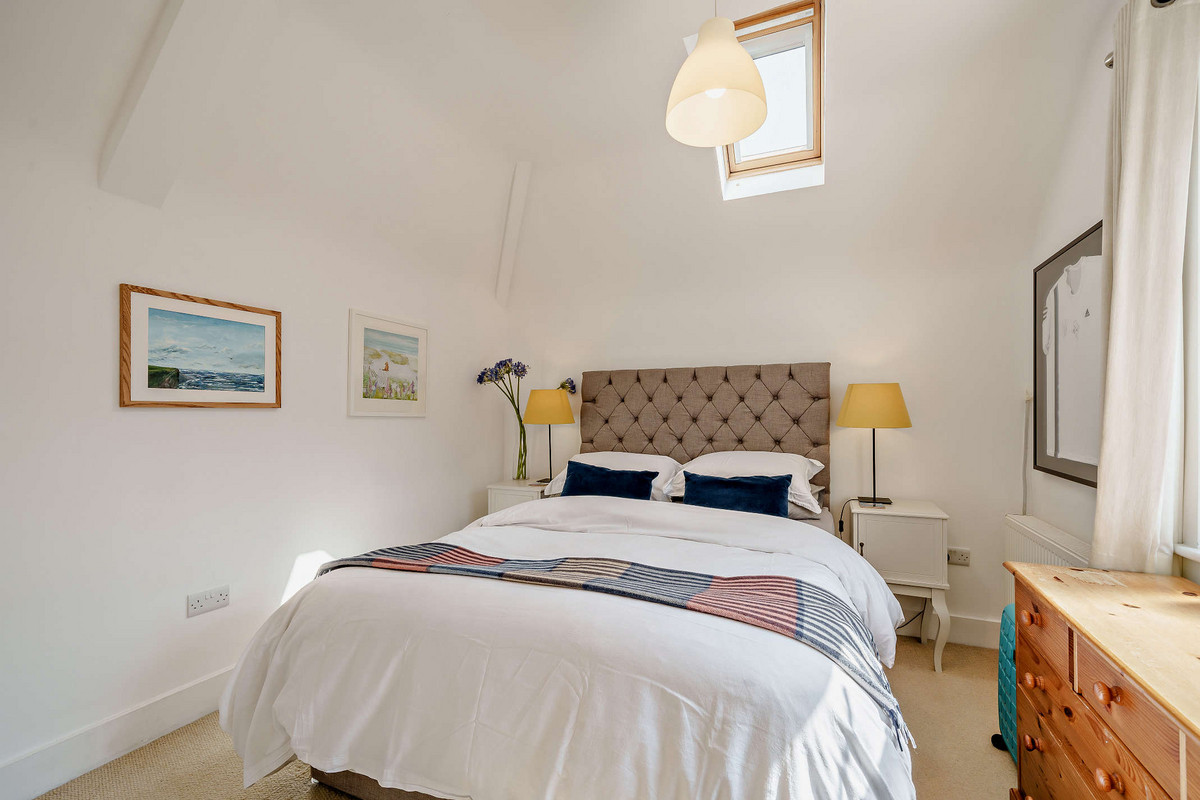 Upstairs continues the sense of space and light, with vaulted ceilings and twin Velux windows illuminating the landing. The generous primary bedroom includes a stylish en-suite shower room, while the second double bedroom offers a large built-in wardrobe, desk, and a sash window with views over the quiet mews. A third bedroom - currently used as a nursery/study - overlooks the courtyard below.