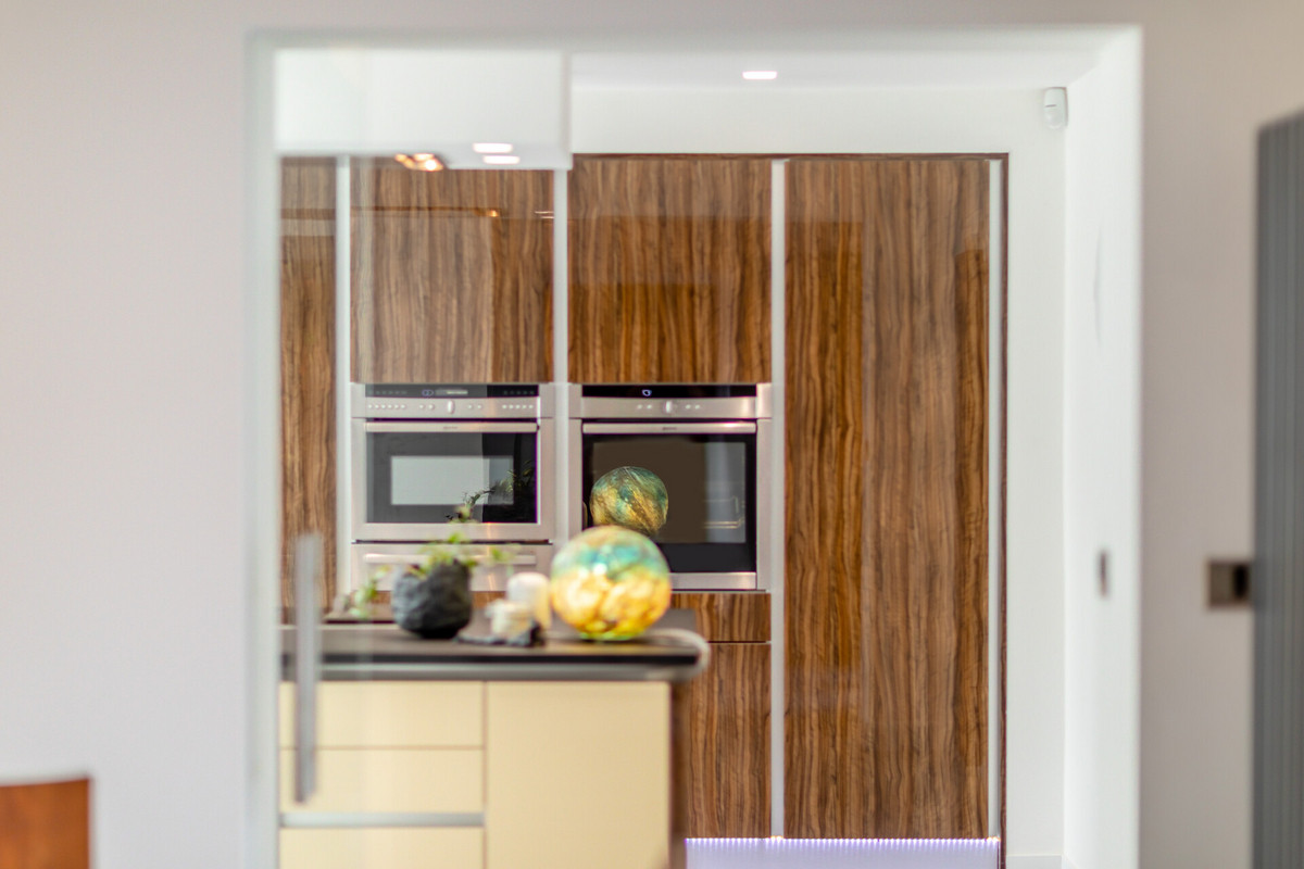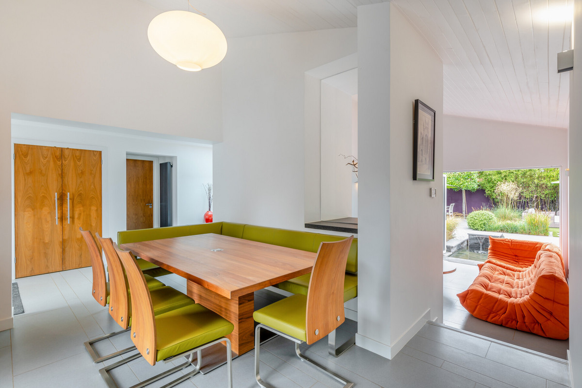 A wide reception hall draws you into the heart of the home, where clean architectural lines and natural light create a calming flow throughout. The semi-open plan sitting and dining room, anchored by a feature fireplace, forms a superb central living space. Adjoining this, the bespoke kitchen and breakfast room, illuminated by skylights and garden views, provides both everyday practicality and a stylish environment for hosting. A separate utility room is set just off the kitchen, with direct access outdoors to one of the garages.