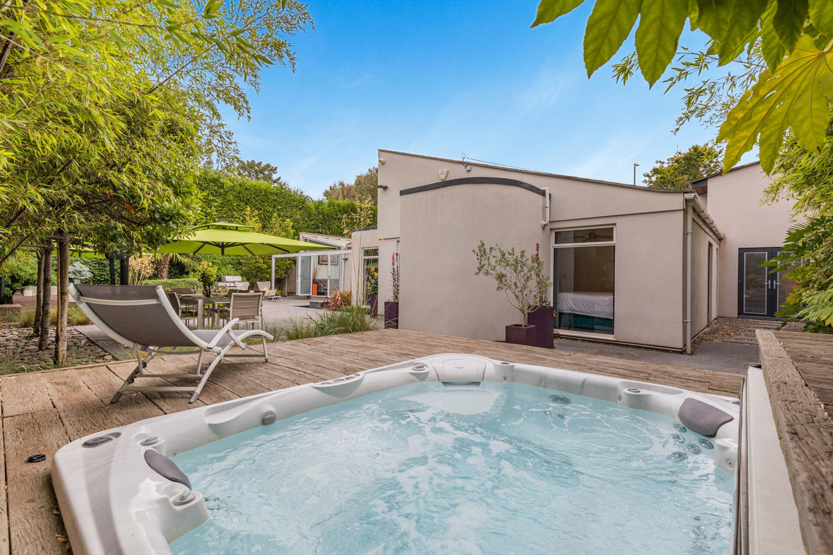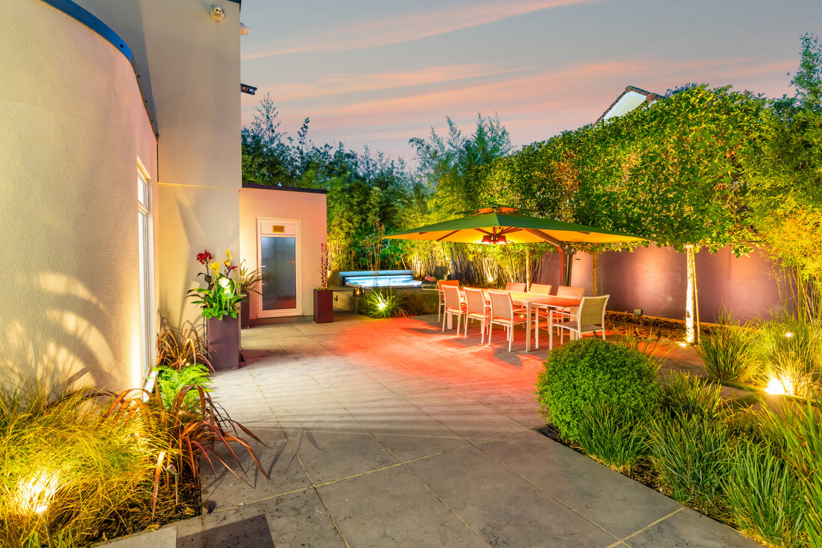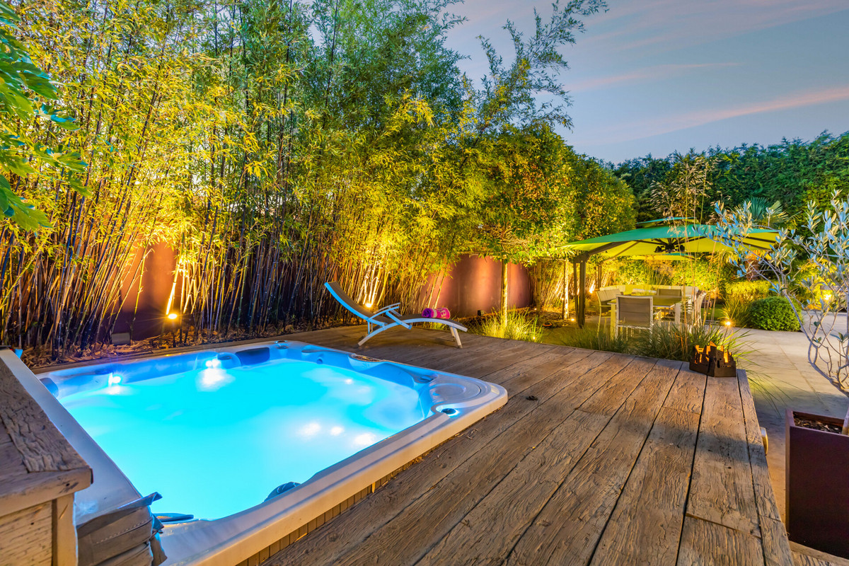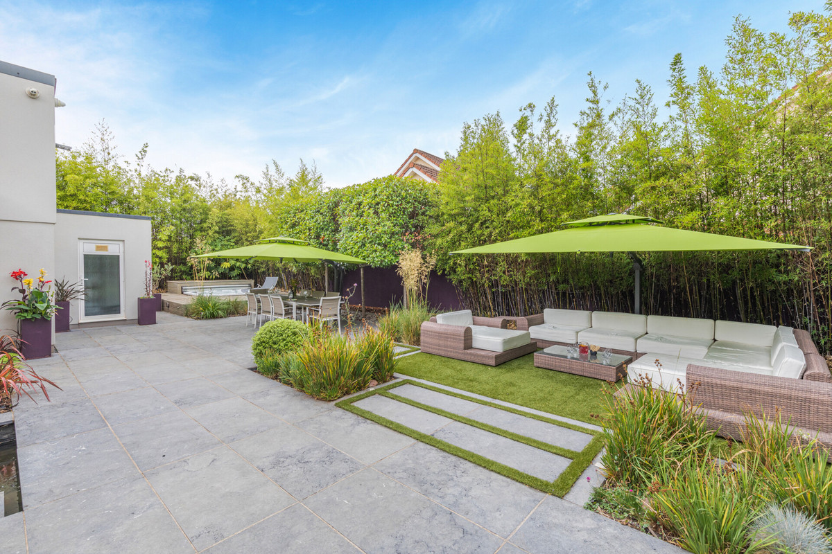 Outside, Chataigne truly comes alive. Designed as an extension of the home’s Mediterranean soul, the gardens are a private sanctuary, with lush planting, architectural lighting, and multiple seating and dining areas. From the outdoor lounge beneath a statement parasol, to the dining terrace perfect for entertaining, and the sunken hot tub set against bamboo planting, every space has been crafted for relaxation and enjoyment. By day, the gardens are sun-drenched and serene; by night, they transform into an atmospheric retreat with vibrant uplighting and a holiday-like ambience.