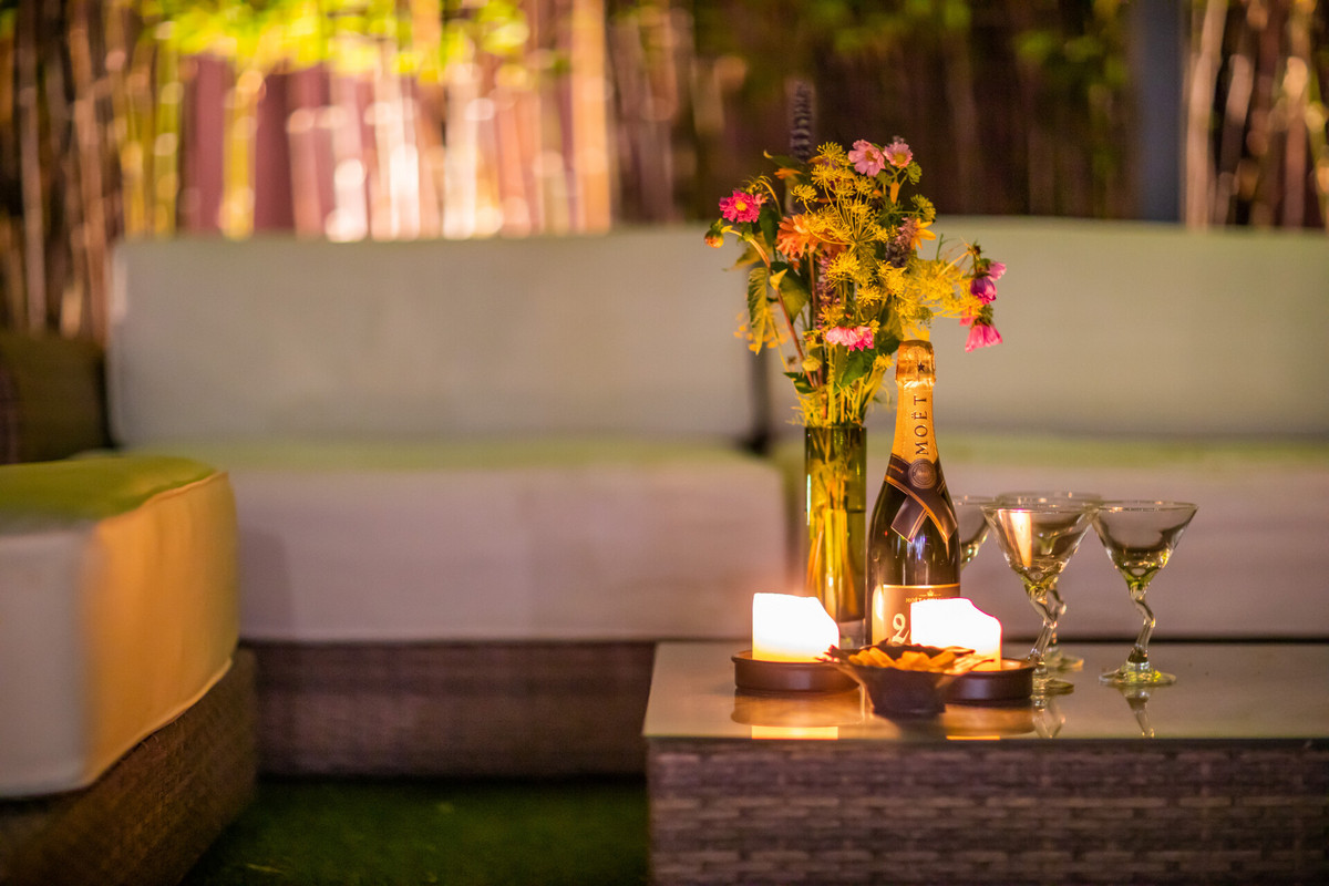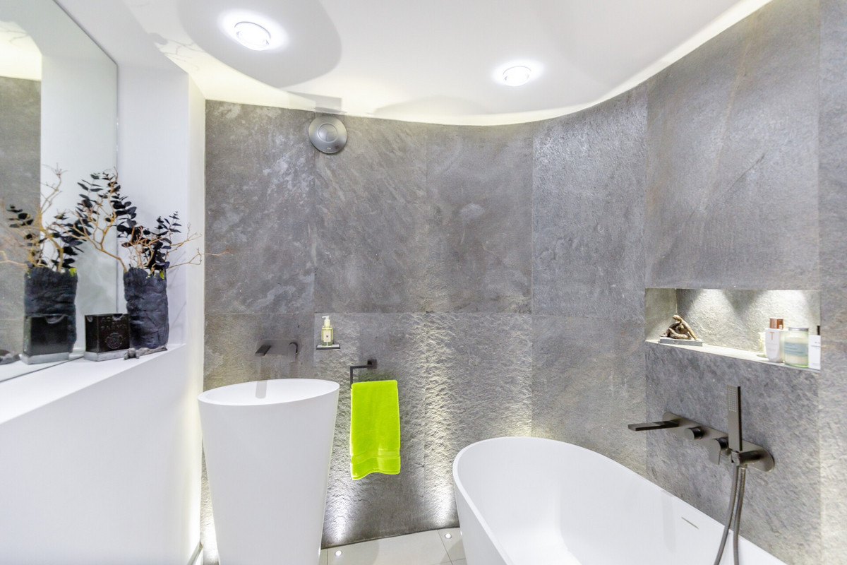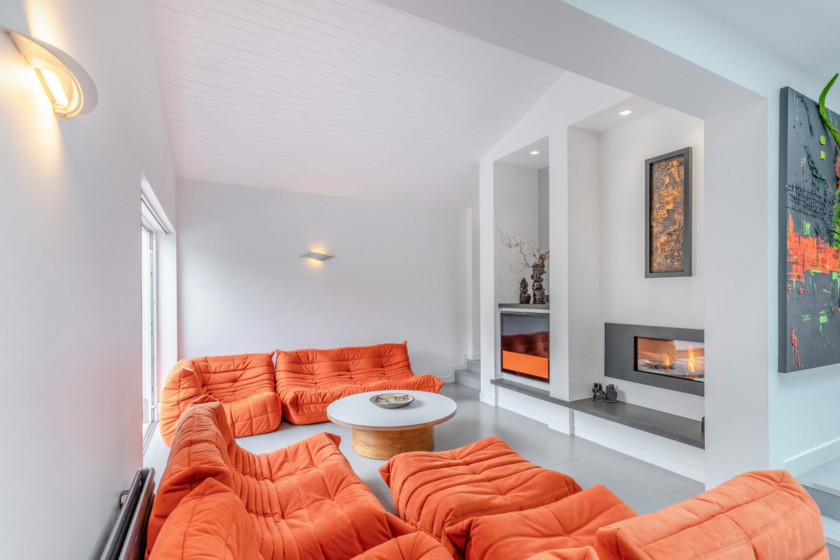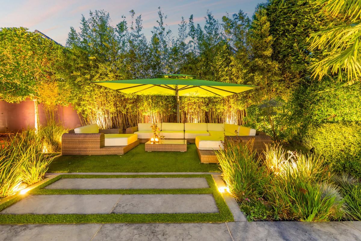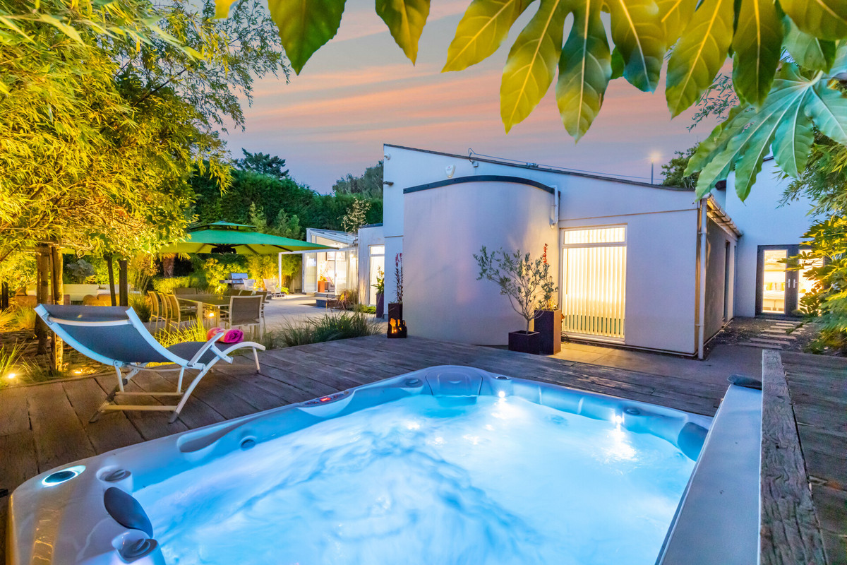 Outside, Chataigne truly comes alive. Designed as an extension of the home’s Mediterranean soul, the gardens are a private sanctuary, with lush planting, architectural lighting, and multiple seating and dining areas. From the outdoor lounge beneath a statement parasol, to the dining terrace perfect for entertaining, and the sunken hot tub set against bamboo planting, every space has been crafted for relaxation and enjoyment. By day, the gardens are sun-drenched and serene; by night, they transform into an atmospheric retreat with vibrant uplighting and a holiday-like ambience.
