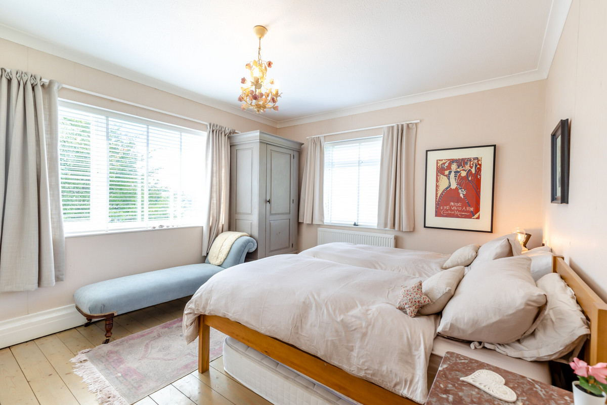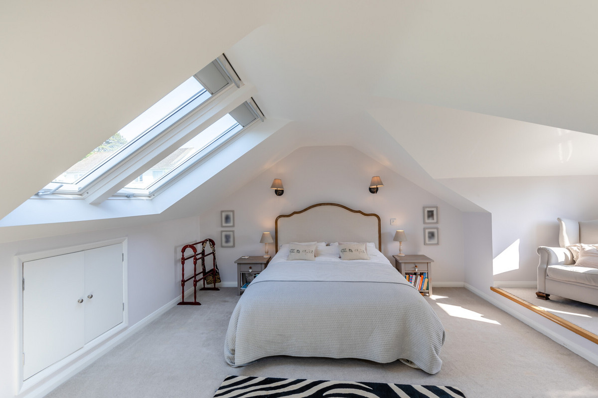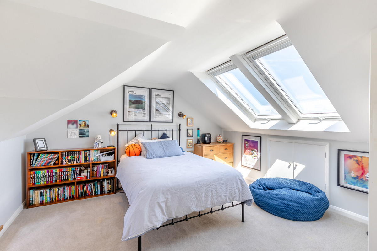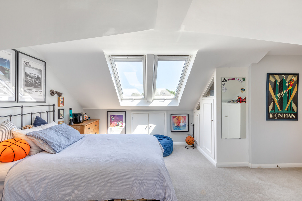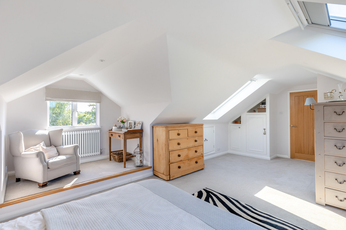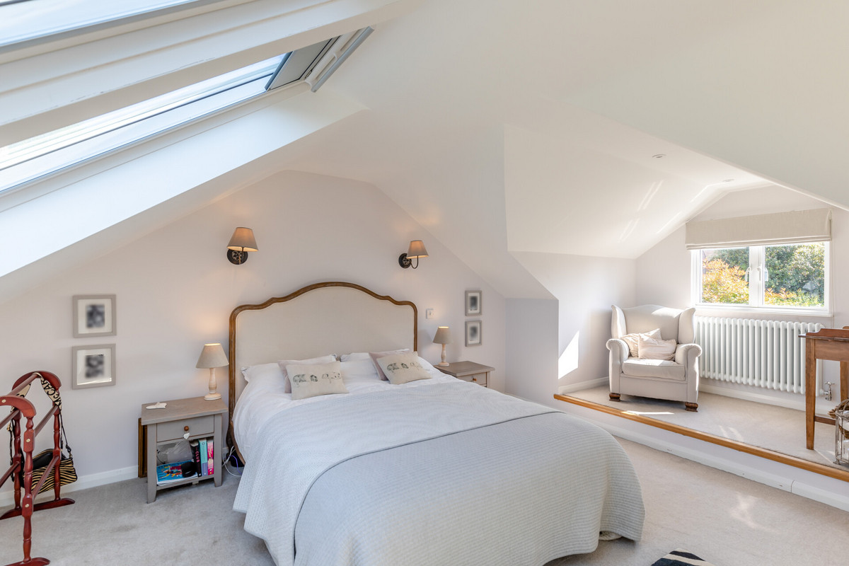 Upstairs, the serene principal bedroom is a standout, with striking ceiling detail, Velux windows, and a large Dorma window with beautiful elevated views in each directions. Two further bedrooms are light-filled and comfortable, served by a contemporary family bathroom.