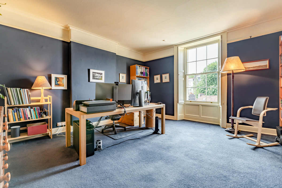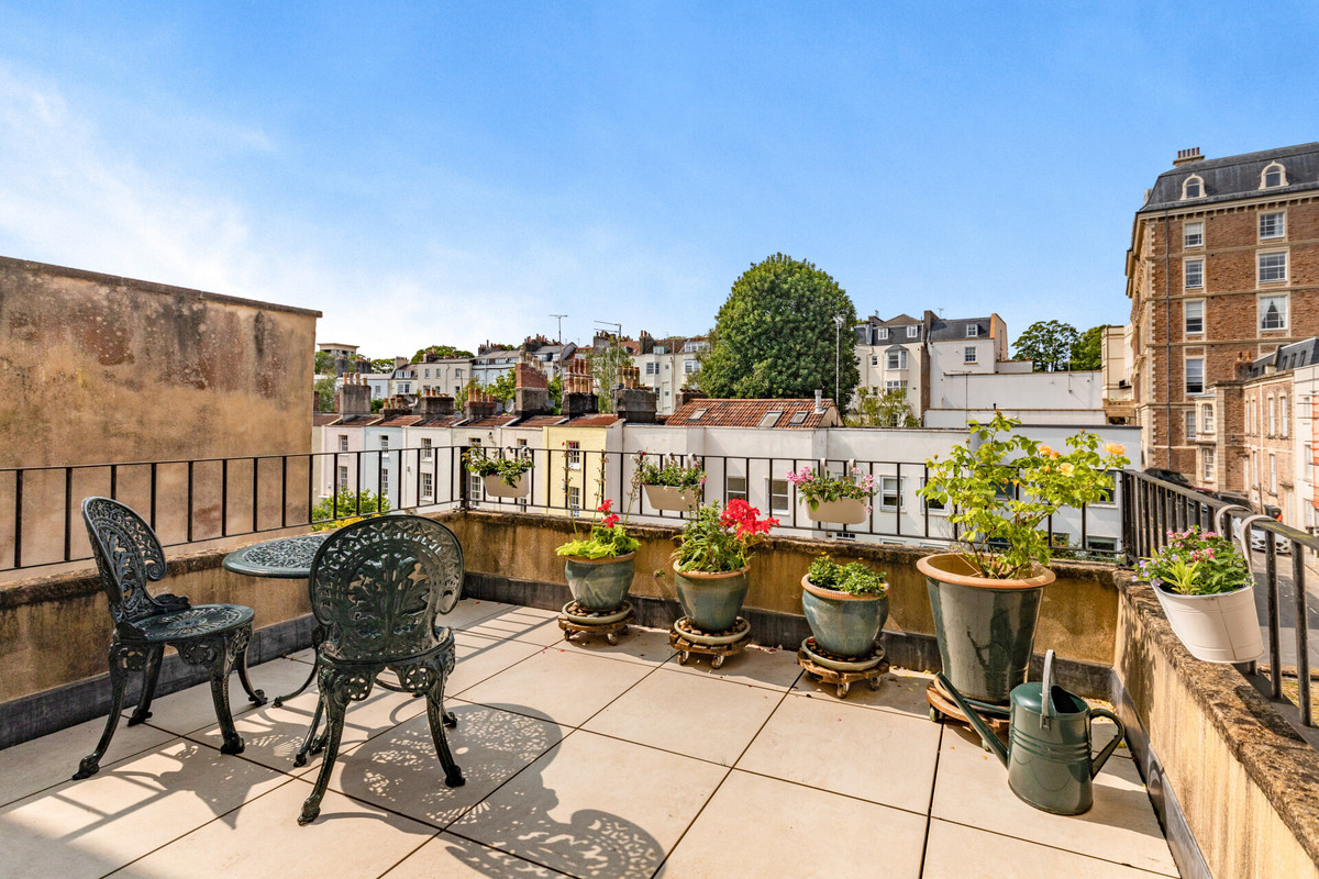The principal suite occupies the second floor—a calm and inviting bedroom with a luxurious en suite bathroom and views over The Mall Gardens. A spacious guest bedroom and access to a private rear balcony offers a perfect vantage point with glimpses of the Clifton Suspension Bridge. The top floor provides three additional bedrooms and another elegant family bathroom—ideal for family living or visiting guests.