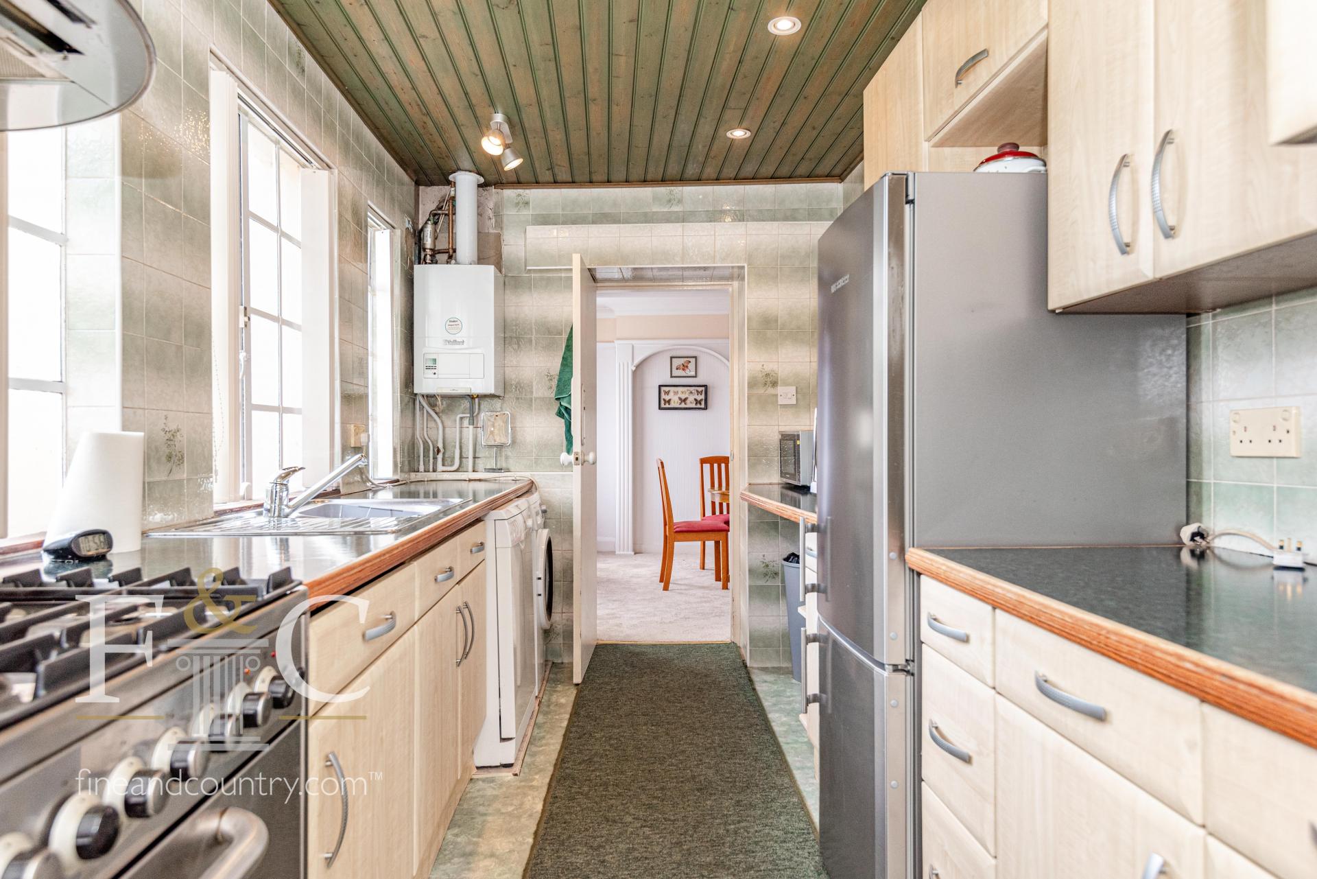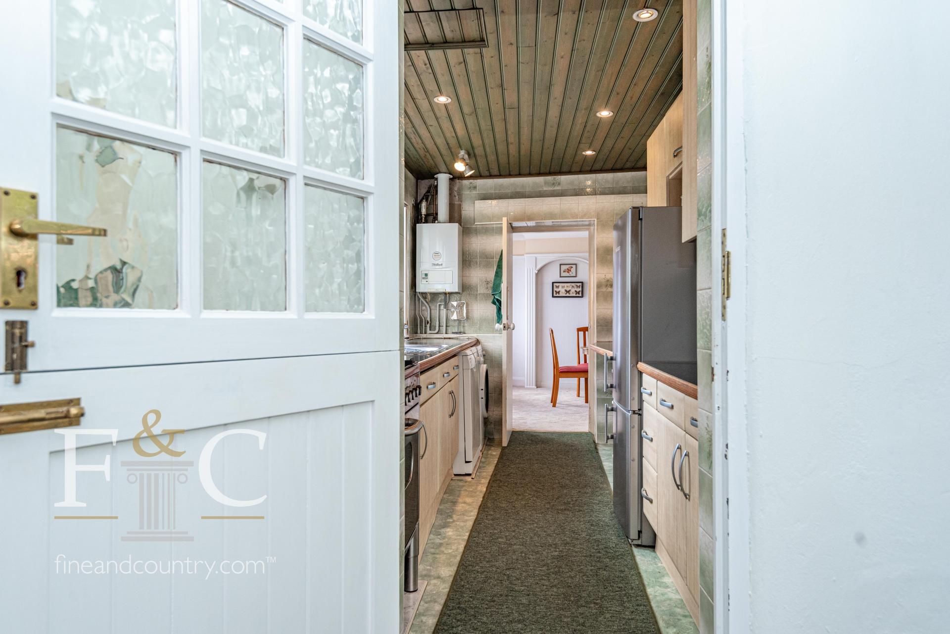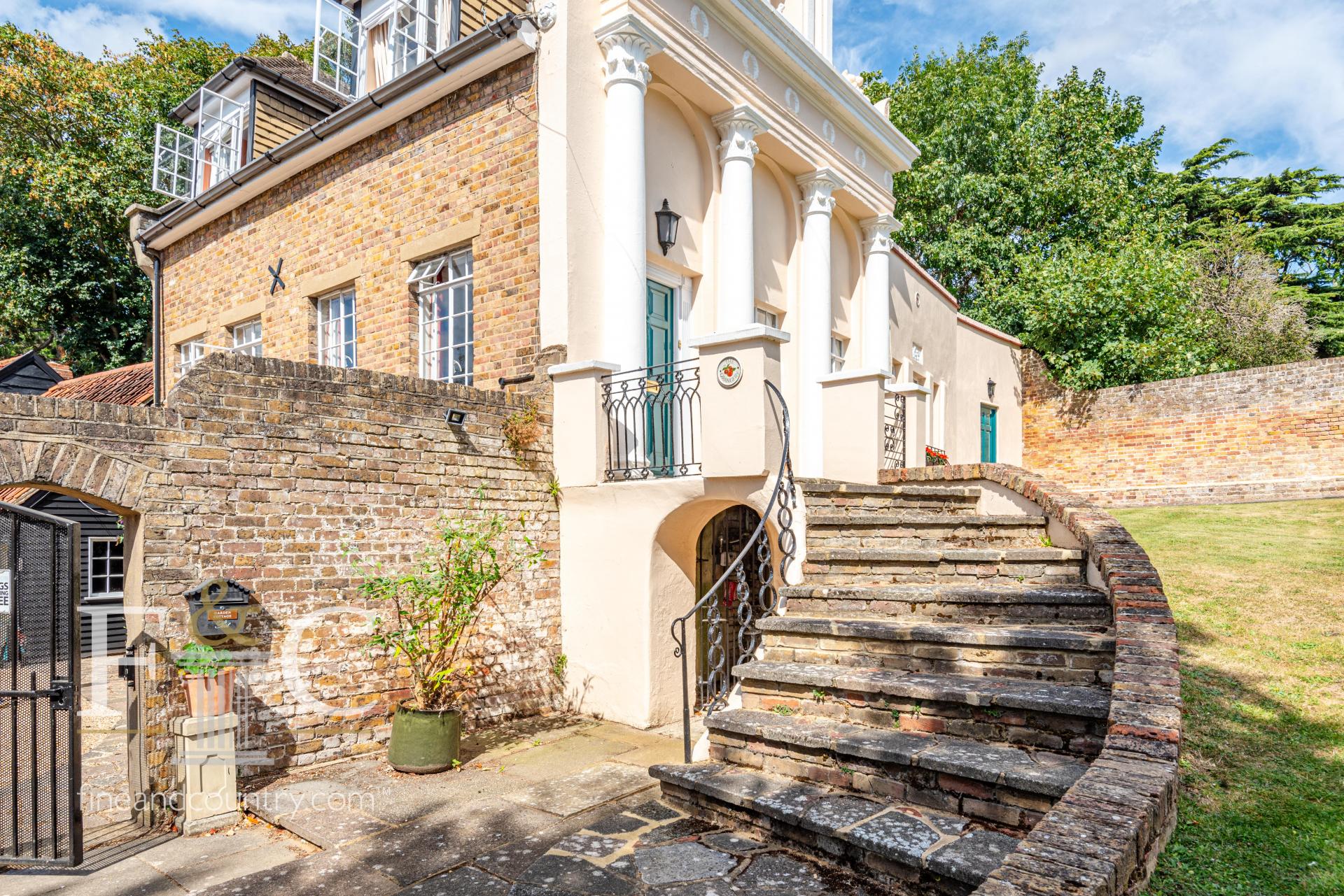An external, turning staircase leads up to a front door flanked by pillars. The large front door opens into an entrance hall with low-lying windows that have a front-facing aspect. A staircase progresses up to the first floor and an archway leads into the dining room. The dining room offers flexible usage and in turn grants access to the living room and kitchen, respectively. The living room has a wealth of light with windows at either end of the room and the principal aspect, out over the enclosed driveway, being south facing. The kitchen offers wall and base mounted units along either side that lead down to the courtyard vestibule. The vestibule has a door out to the front of the plot and a set of double doors that open into an internalized courtyard. Up on the first floor, two double bedrooms stem off of a central landing. Both bedrooms are serviced by a bathroom with separate bathing and showering facilities. In addition to the bathroom, there is a stand-alone W/C located across the hallway.