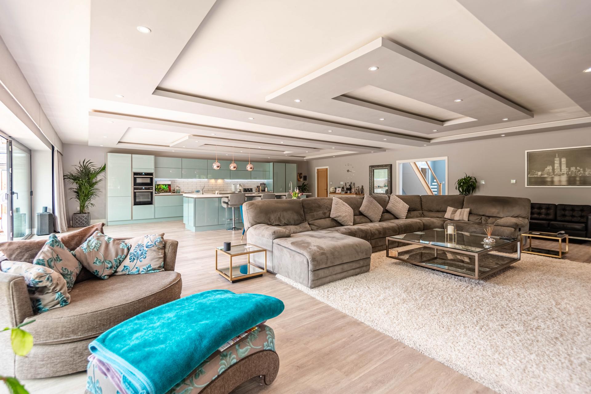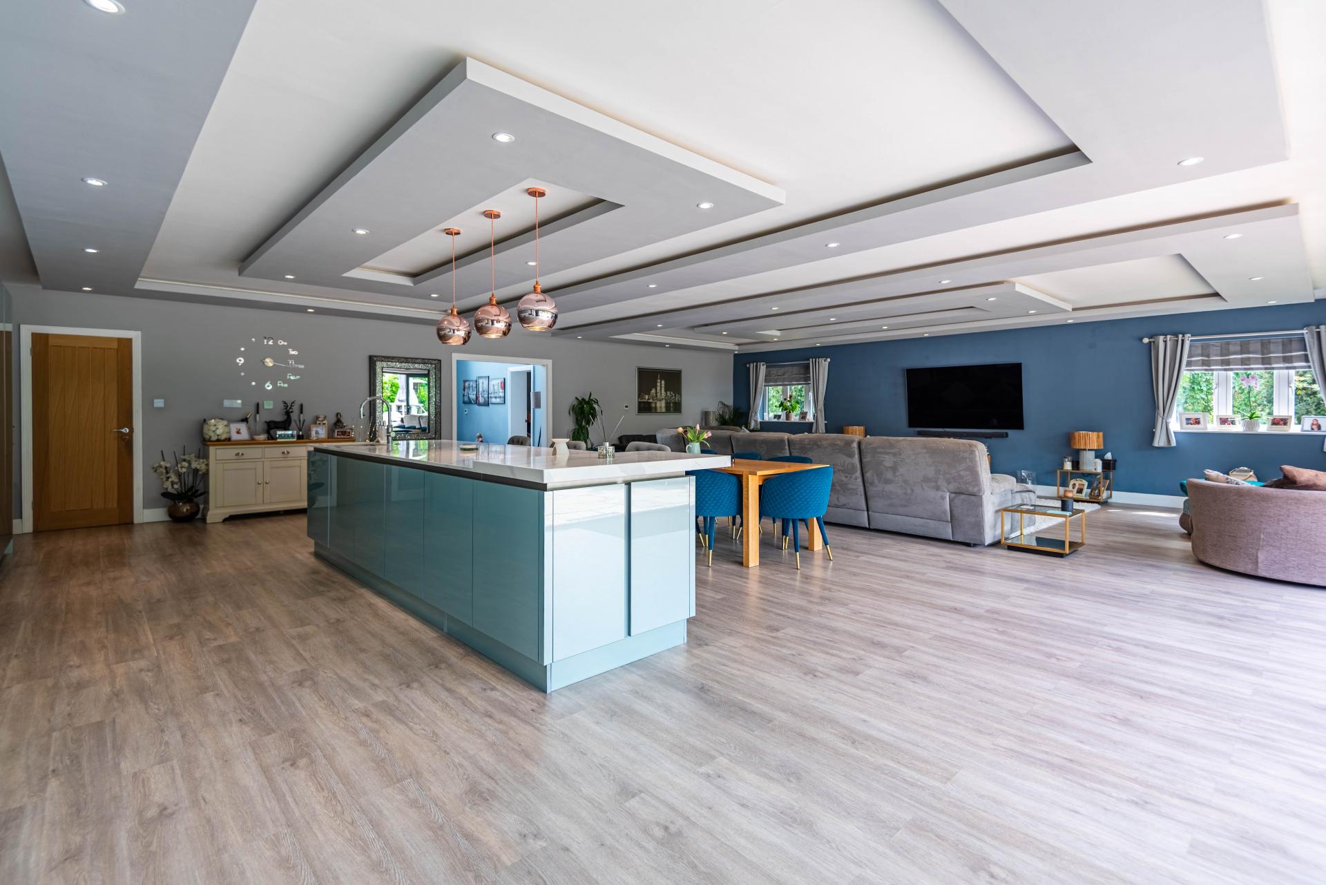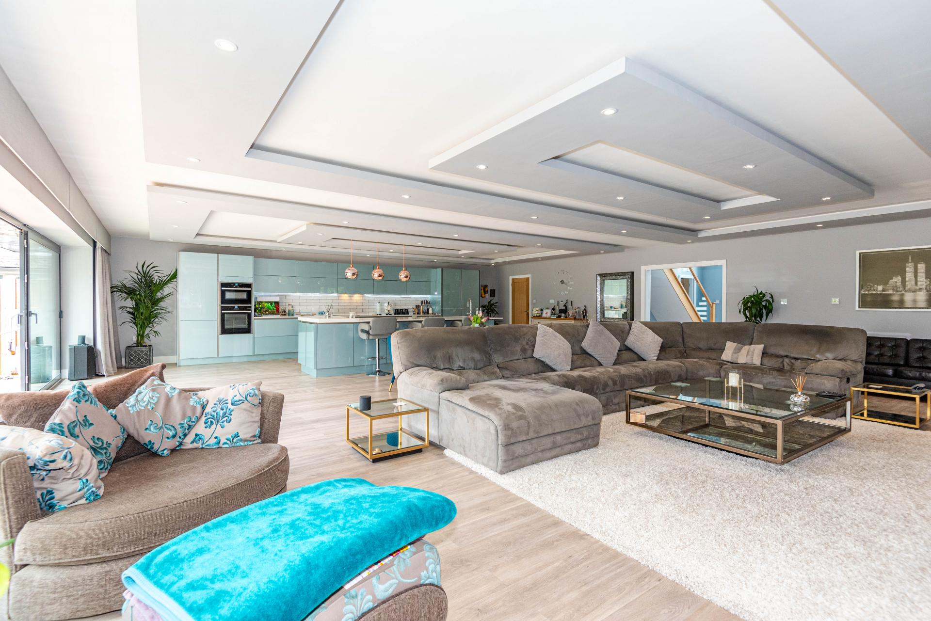 The heart of the home is a spectacular 36'6 x 30'6 open plan kitchen, sitting, and dining room, designed for entertaining guests and hosting memorable gatherings. The large easy glide patio doors allow you to spill over onto the extensive patio which steps down onto the extensive lawn.