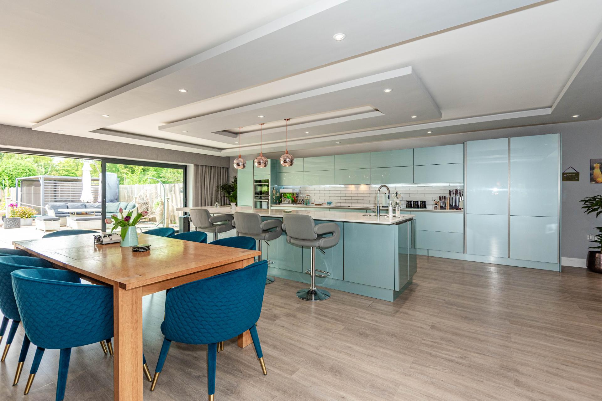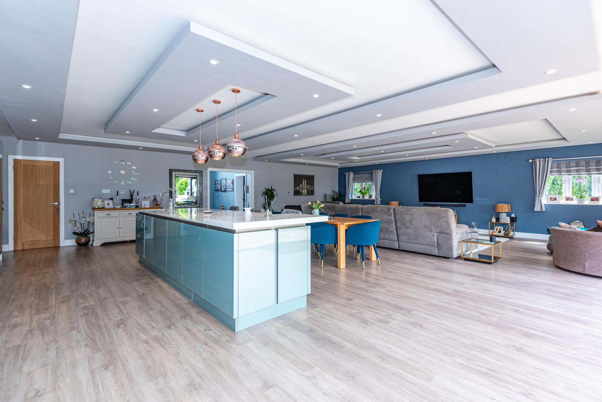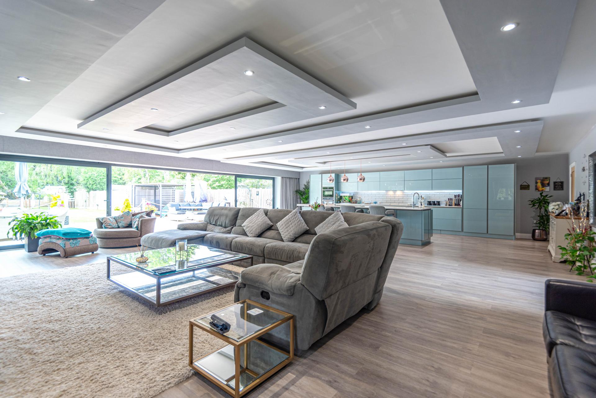 The heart of the home is a spectacular 36'6 x 30'6 open plan kitchen, sitting, and dining room, designed for entertaining guests and hosting memorable gatherings. The large easy glide patio doors allow you to spill over onto the extensive patio which steps down onto the extensive lawn.
