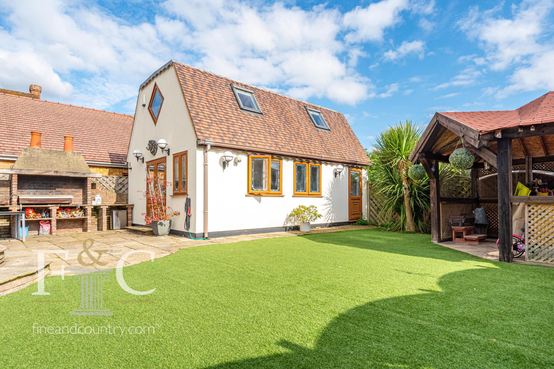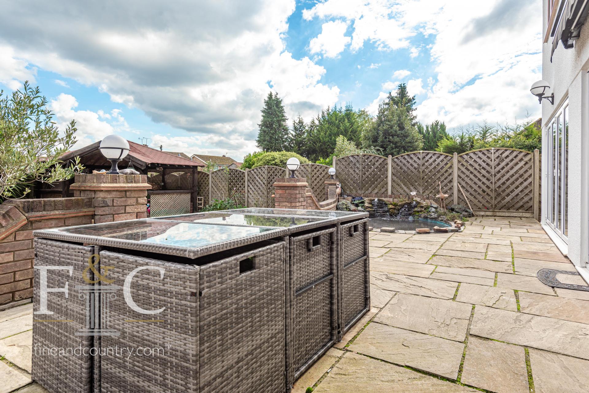 The rear garden has an extensive patio area with a brick built barbecue/ kitchen to one side of the garden and a covered eating area that provides for alfresco dining .