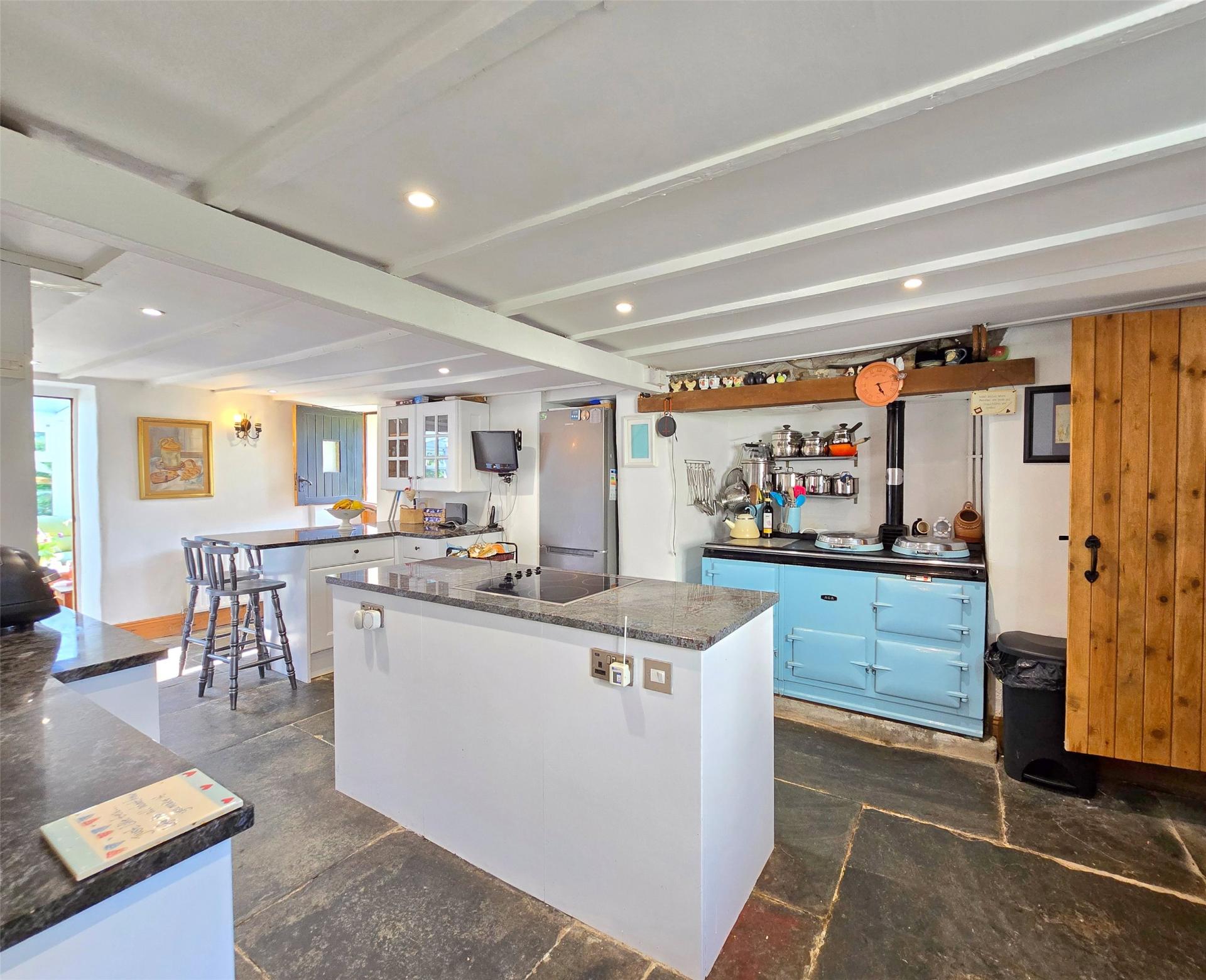 An office with a connecting door to the conservatory, and a sunroom enjoying a pleasant southerly aspect with glazed doors to the patio, add to the versatility of the living spaces. The kitchen/breakfast room is fully fitted with pine-fronted drawers and cupboards, granite work surfaces, and an oil-fired Aga range. A central island with a built-in electric oven and ceramic hob, alongside a breakfast bar and flagstone slate flooring, makes this kitchen a functional and inviting space. The hobbies/dining room, accessed from the kitchen, features double doors to private gardens.