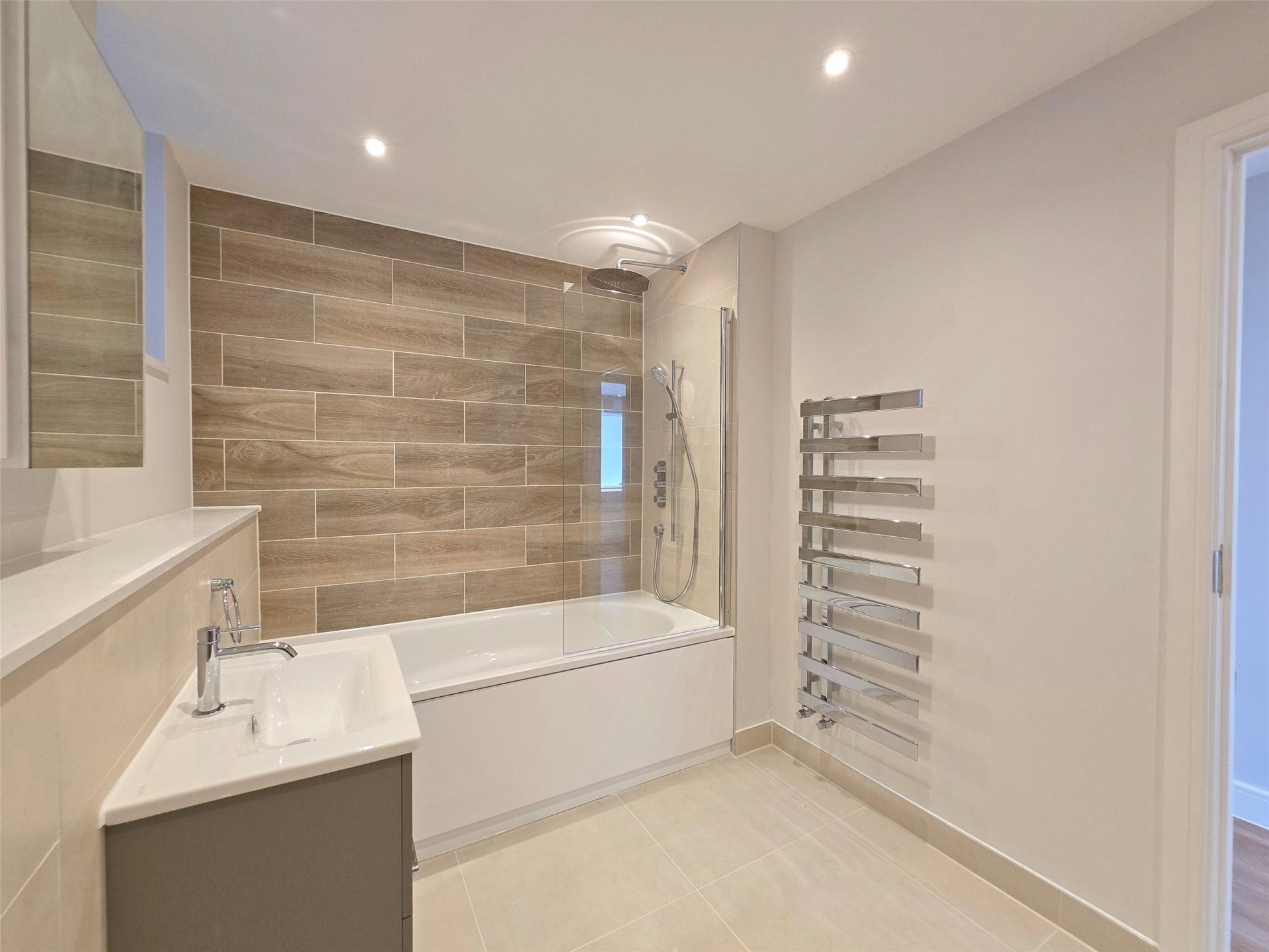 Opaque double glazed window to the side elevation. Inset lighting, attractive part tiled walls with feature tiled wall and tiled flooring with underfloor heating. Panel enclosed bath with glass shower screen, mains fed shower with large soak head and separate hand attachment, wall hung vanity unit, wall hung toilet bowl with concealed cistern and a chrome wall mounted heated towel rail.
