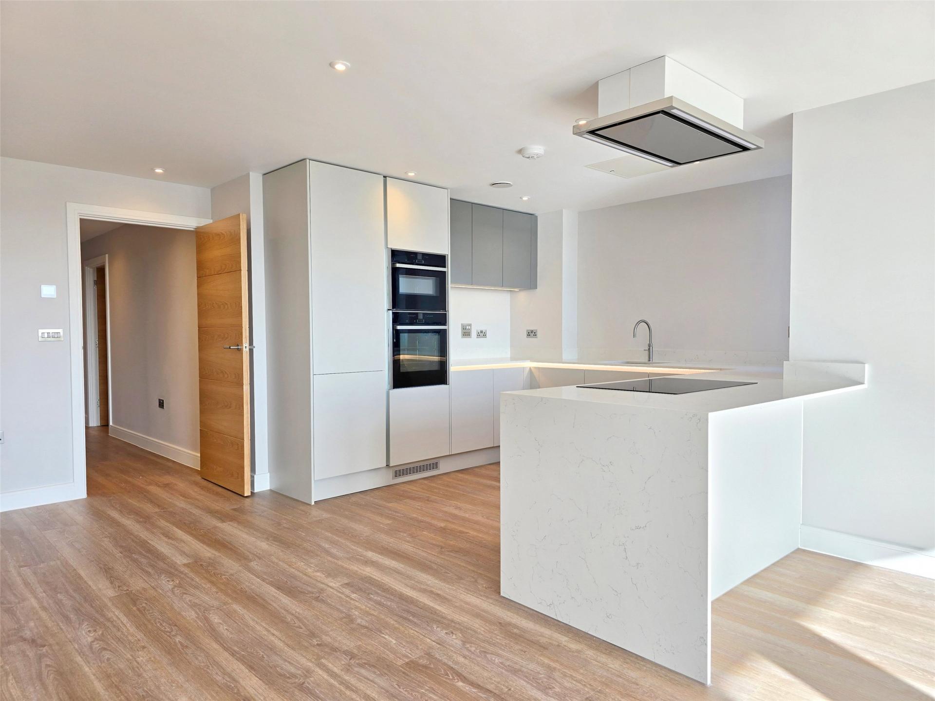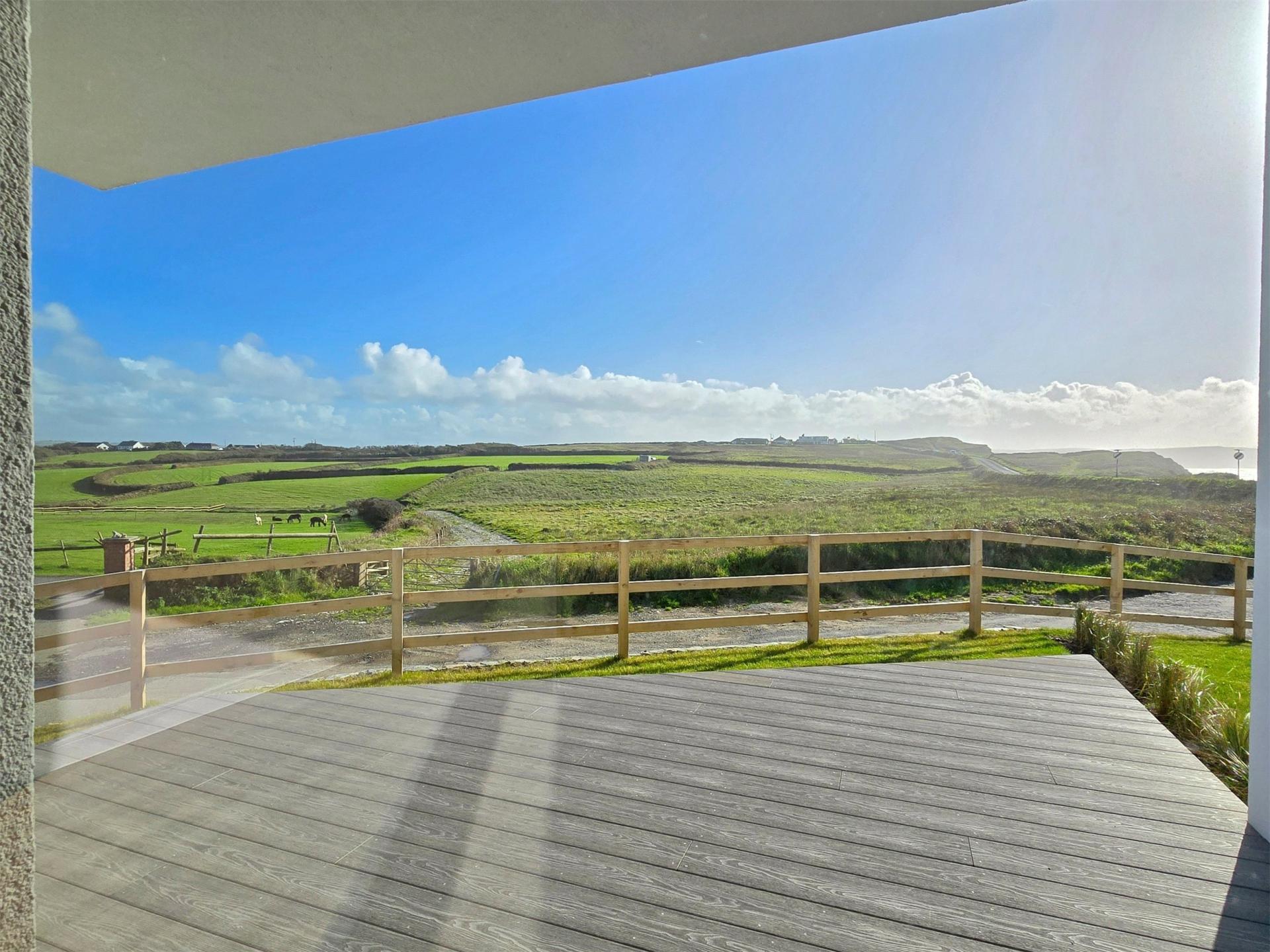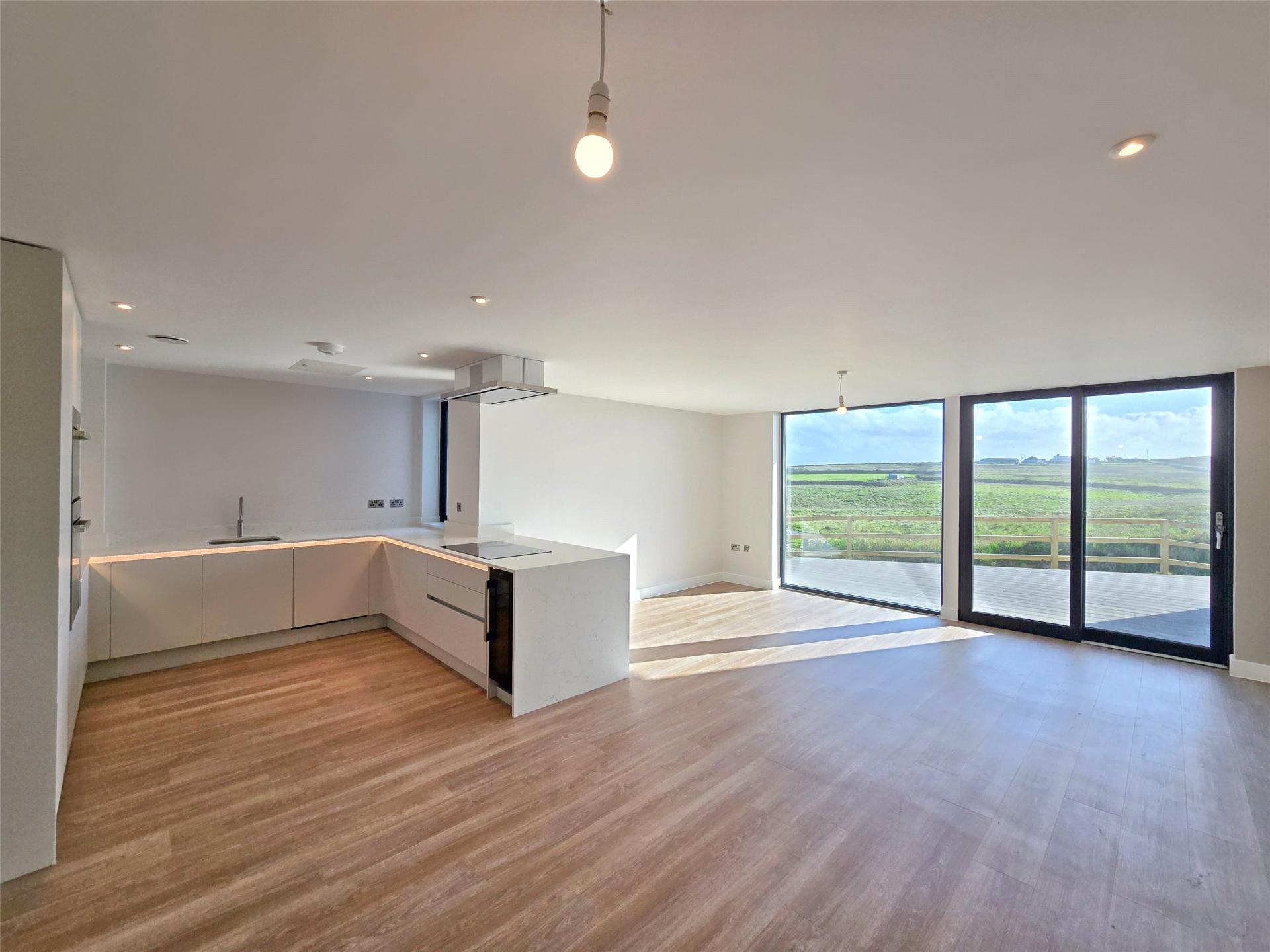 Spanning an impressive 94 m², the apartment showcases a high-specification finish with a contemporary open-plan kitchen, living and dining space. Large double-glazed sliding doors lead to a private composite decked patio and garden, offering uninterrupted views of the stunning Atlantic coastline. The sleek kitchen is a true highlight, featuring integrated Neff appliances, a wine cooler, Quooker hot water tap, and stone worktops, perfect for both entertaining and everyday living.