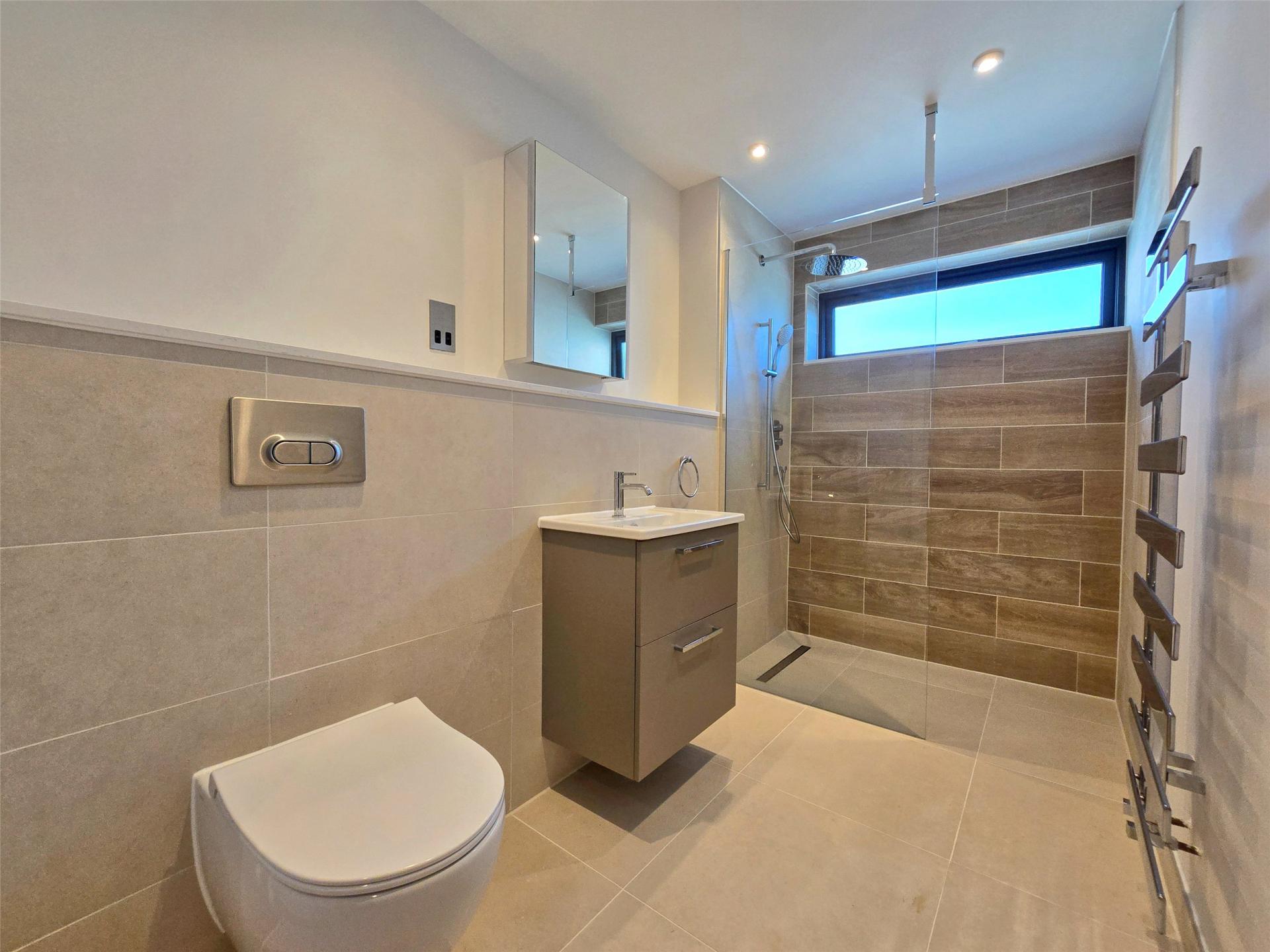 Opaque double glazed window to the side elevation. Inset lighting, attractive part tiled walls with feature tiled wall and tiled flooring with underfloor heating. Fixed glass shower screen, mains fed shower with large soak head and separate hand attachment, wall hung vanity unit, wall hung toilet bowl with concealed cistern and a chrome wall mounted heated towel rail.