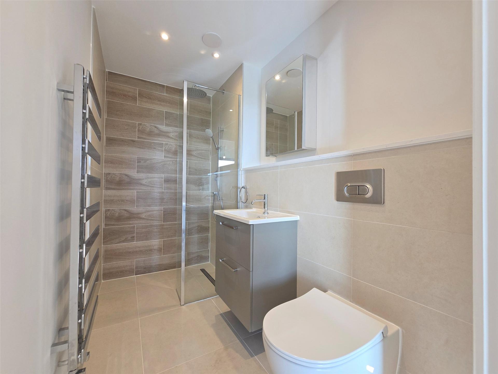 Inset lighting, attractive part tiled walls with feature tiled wall and tiled flooring with underfloor heating. Fixed glass shower screen, mains fed shower with large soak head and separate hand attachment, wall hung vanity unit, wall hung toilet bowl with concealed cistern and a chrome wall mounted heated towel rail.