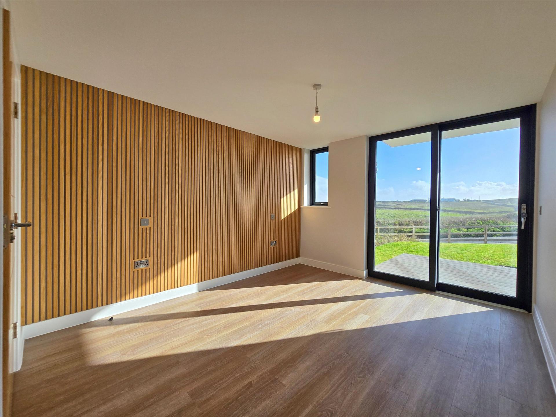 The heart of the home is the impressive open-plan living area, where floor-to-ceiling glazing frames panoramic views of the Atlantic Ocean and the rugged Cornish coastline, extending as far as Trevose Head. This light-filled space flows seamlessly into a private garden with decking, offering the perfect spot for outdoor dining or simply soaking in the views.