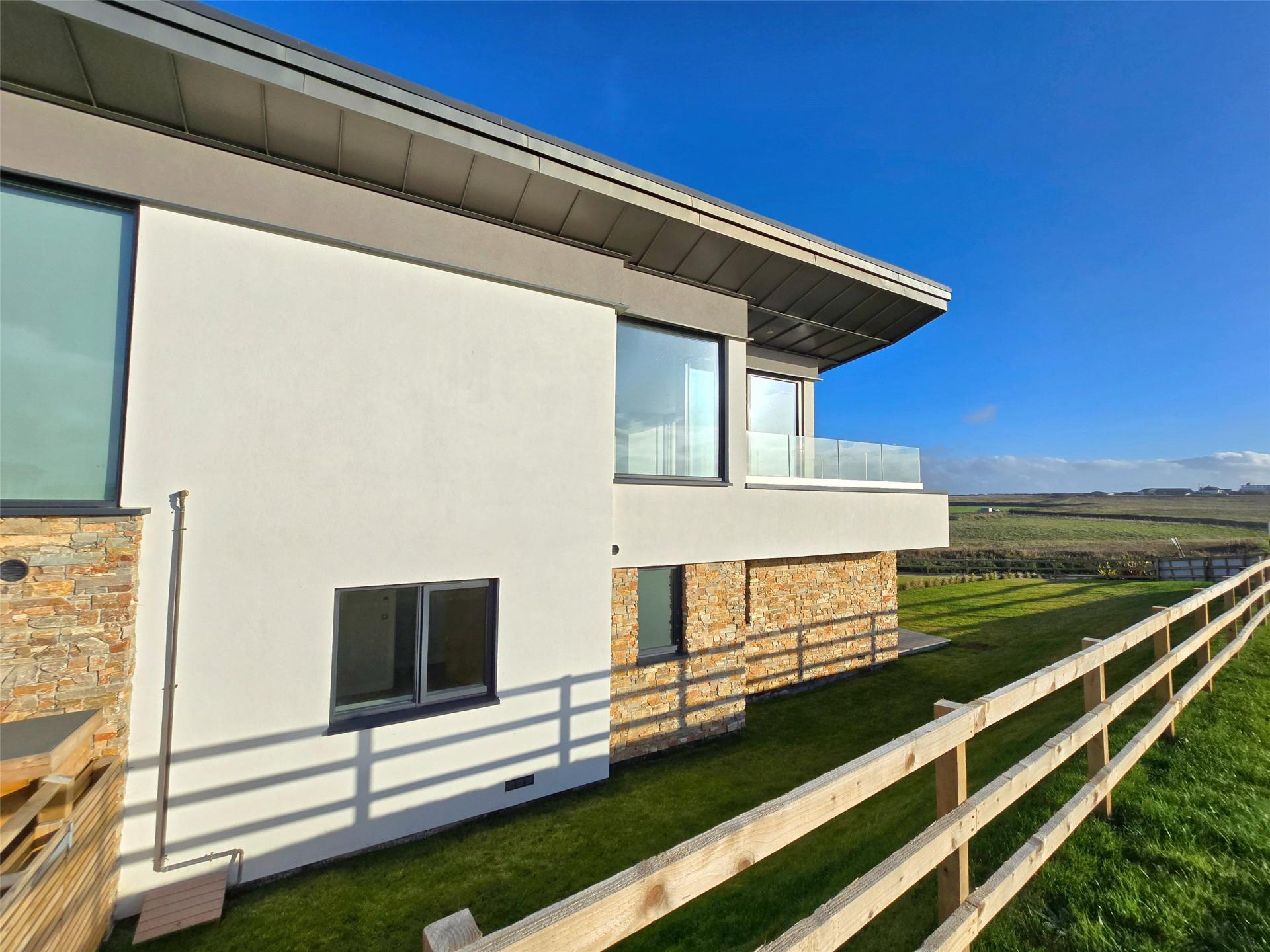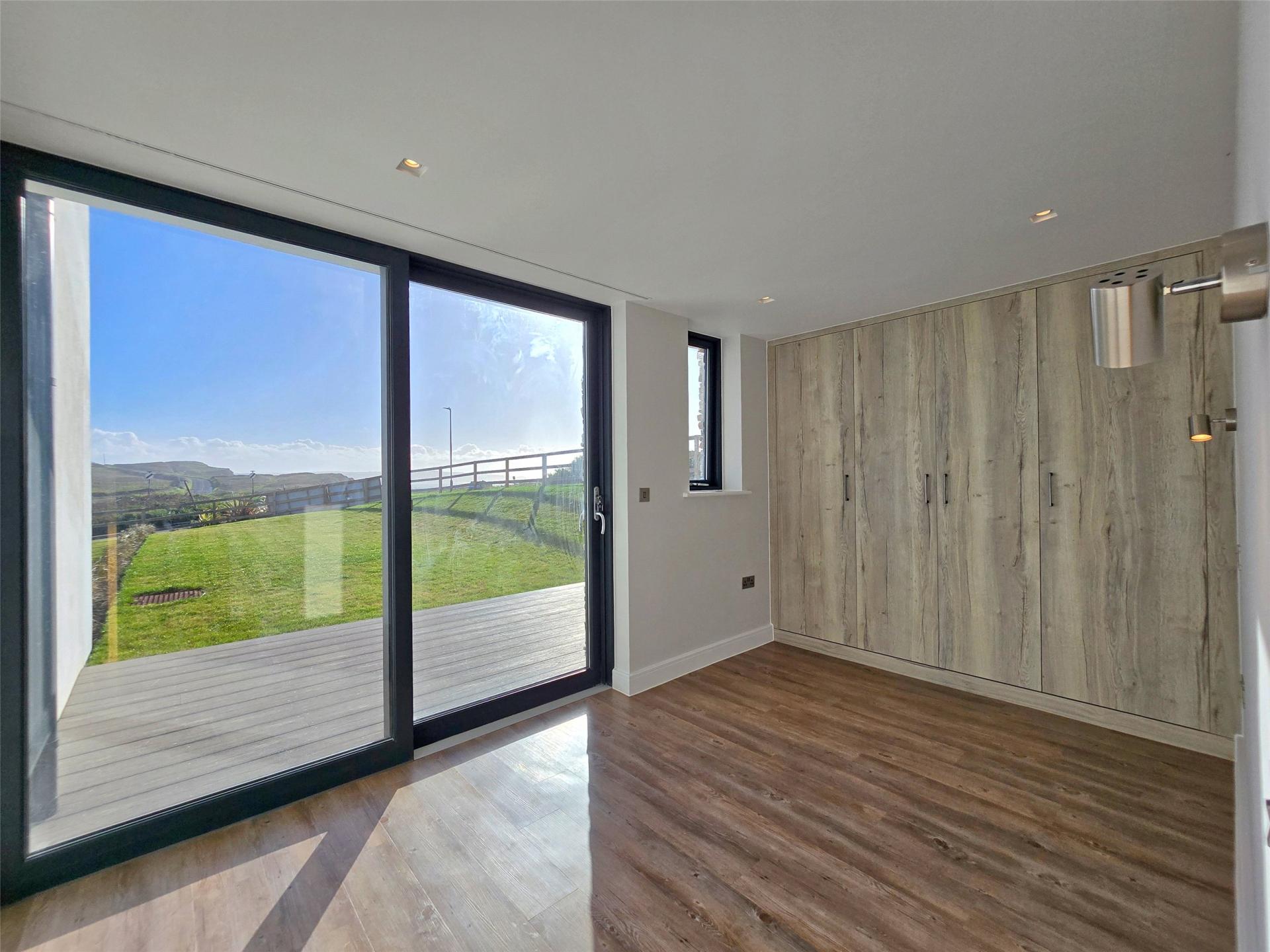Sliding doors and window to the front elevation leading out onto the composite decked patio, lawn gardens and offering superb coastal views. Inset lighting, feature wall lights, satin chrome switches and sockets, built in wardrobes and LVT flooring with underfloor heating.