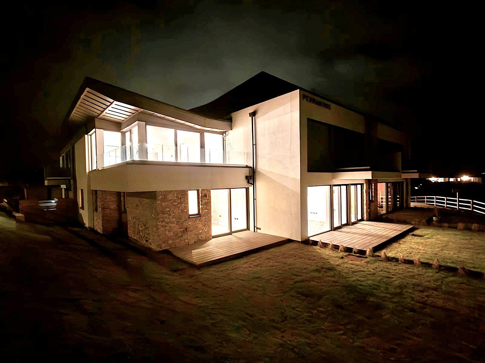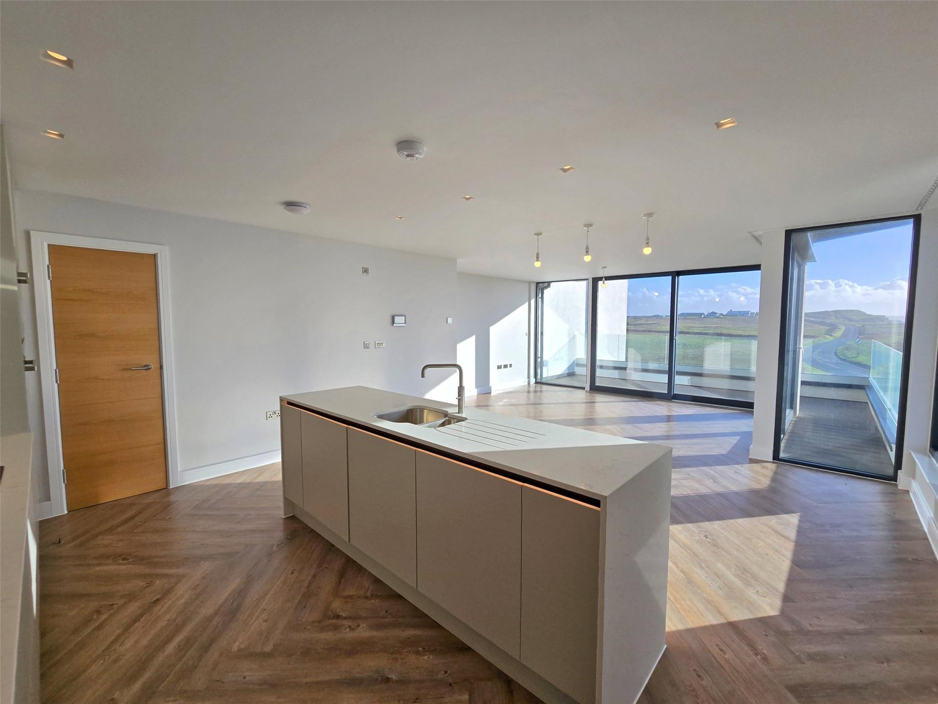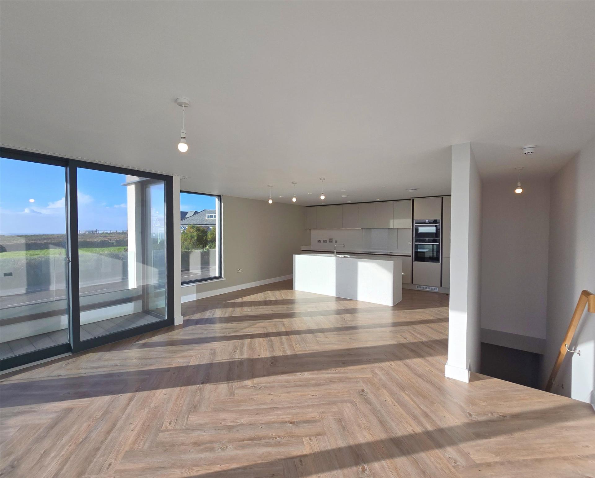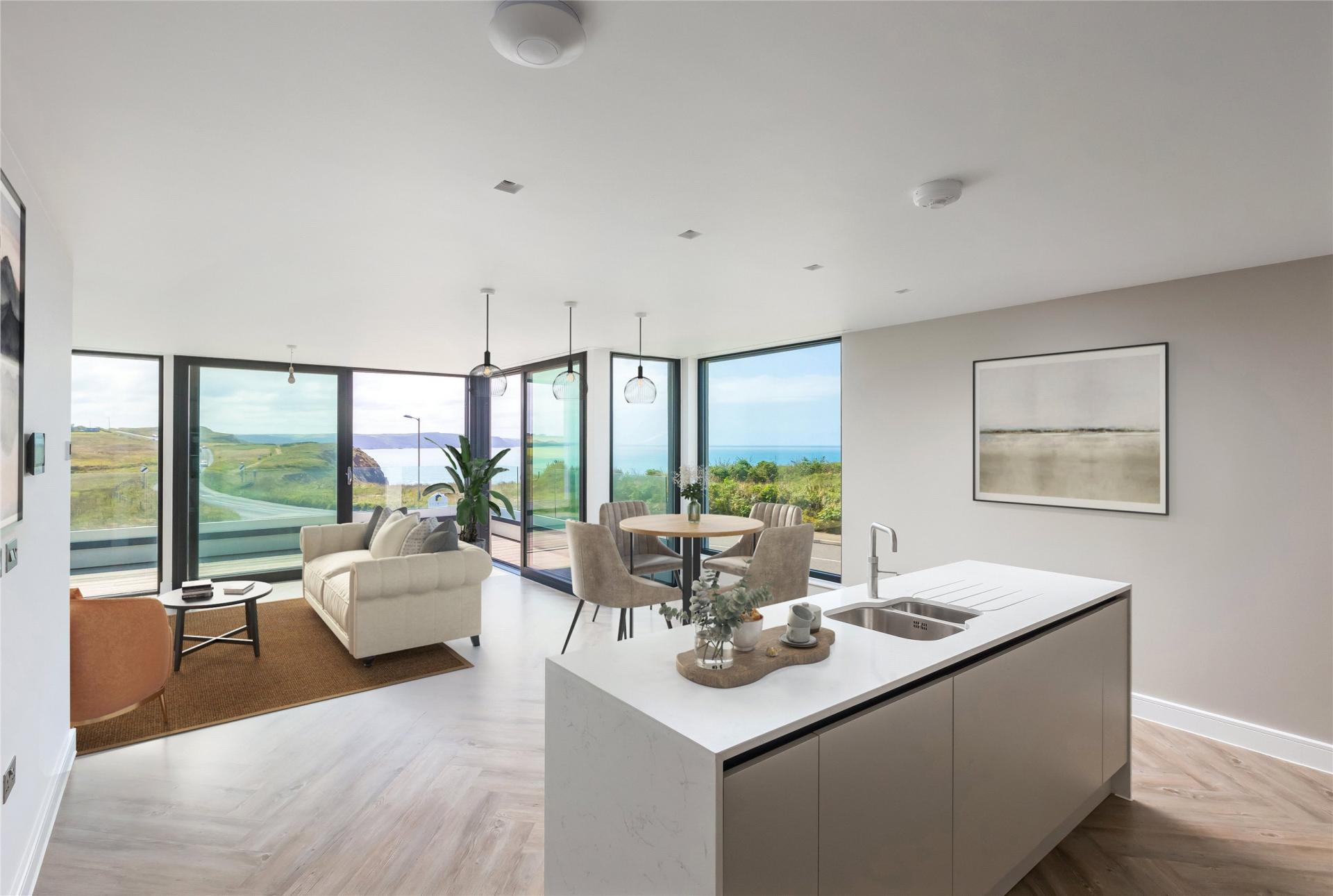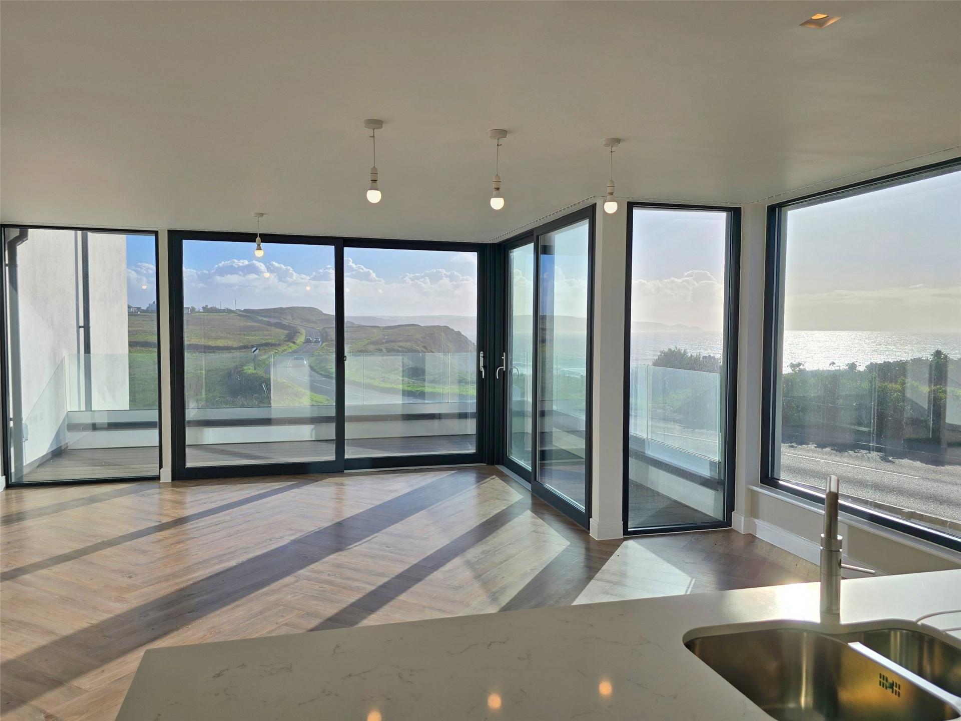 Ascending to the first floor, you are welcomed into an expansive open-plan kitchen, dining, and living space, bathed in natural light thanks to large corner glazed elevations. This impressive living area opens out onto a sun balcony with panoramic views stretching along the rugged coastline, making it the perfect space for entertaining or simply unwinding while taking in the stunning surroundings. The kitchen itself is thoughtfully designed with premium finishes, including natural stone worktops, Neff integrated appliances, and a Quooker tap.