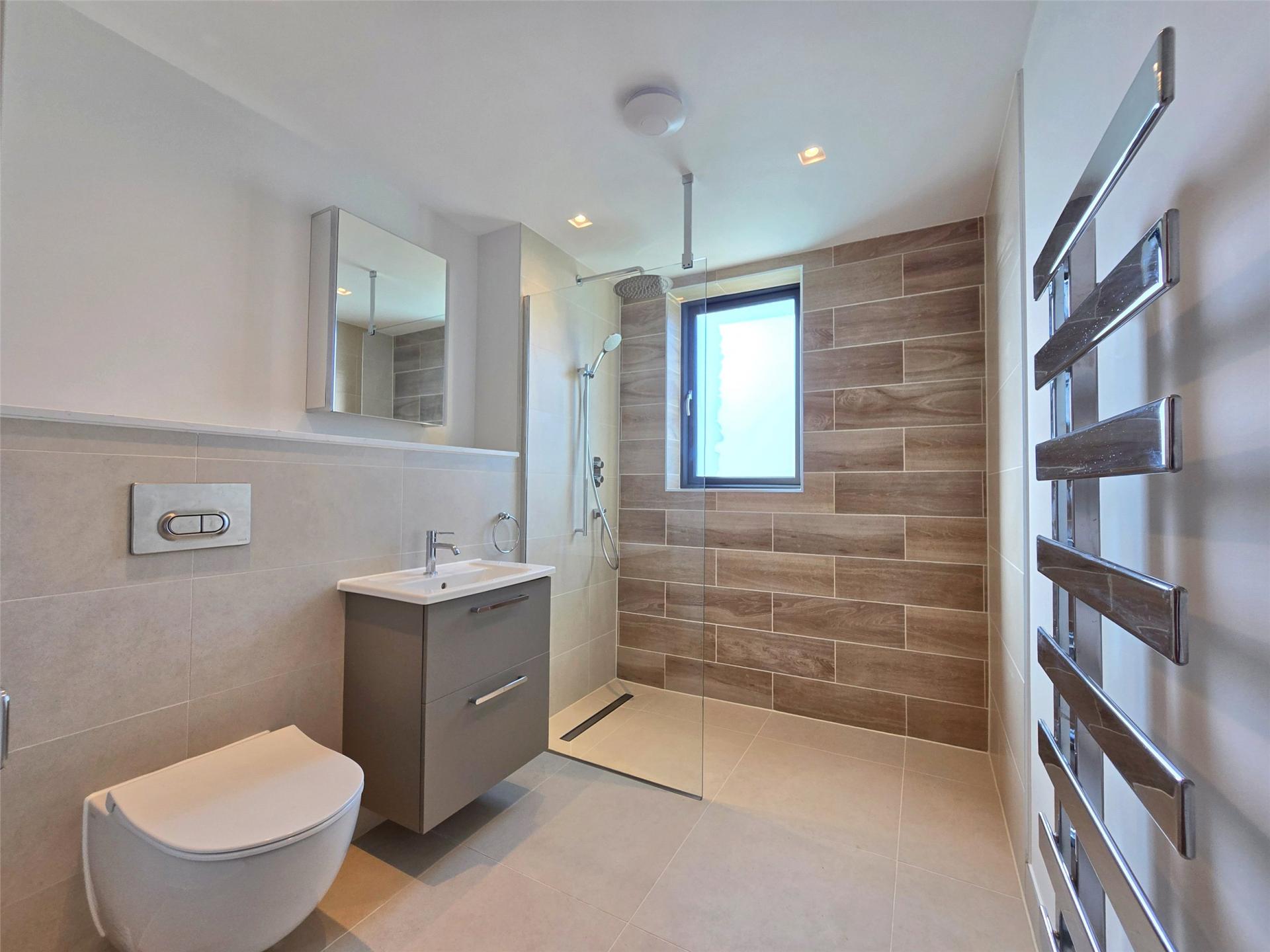 Attractive part tiled walls with feature tiled wall, tiled flooring with underfloor heating. Fixed glass shower screen, mains fed shower with large soak head and separate hand attachment, wall hung vanity unit, wall hung toilet bowl with concealed cistern and a chrome wall mounted heated towel rail.