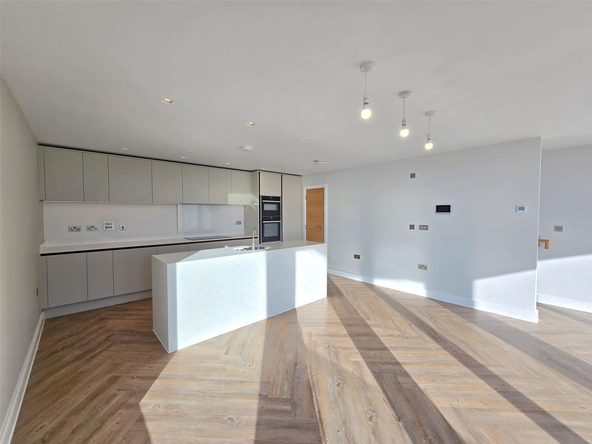 A bright and spacious multi zone room with inset lighting and feature pendant lighting. Large double glazed sliding doors leading out onto the balcony and large feature double glazed window offering stunning sea and coastal views. LVT flooring with underfloor heating and satin chrome switches and sockets. Door to cupboard housing the Baxi gas fired boiler and underfloor heating manifolds.The kitchen is finished with a range of matching wall and base units with stone worksurface with matching upstand. Undermounted sink with Quooker tap, Integrated Neff appliances comprise induction hob with extractor, electric cooker with slide and hide door, fridge freezer, dishwasher and washing machine.