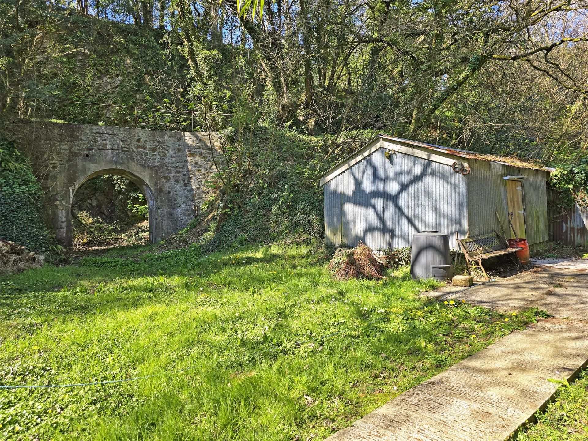 Externally, a gated entrance leads to ample gravelled parking, and the property is approached via a concrete bridge that crosses the stream. A range of useful outbuildings includes a large wood store/shed and an impressive 30m x 4m greenhouse, offering scope for horticultural pursuits. A disused aqueduct stands as a reminder of the property’s historic role.