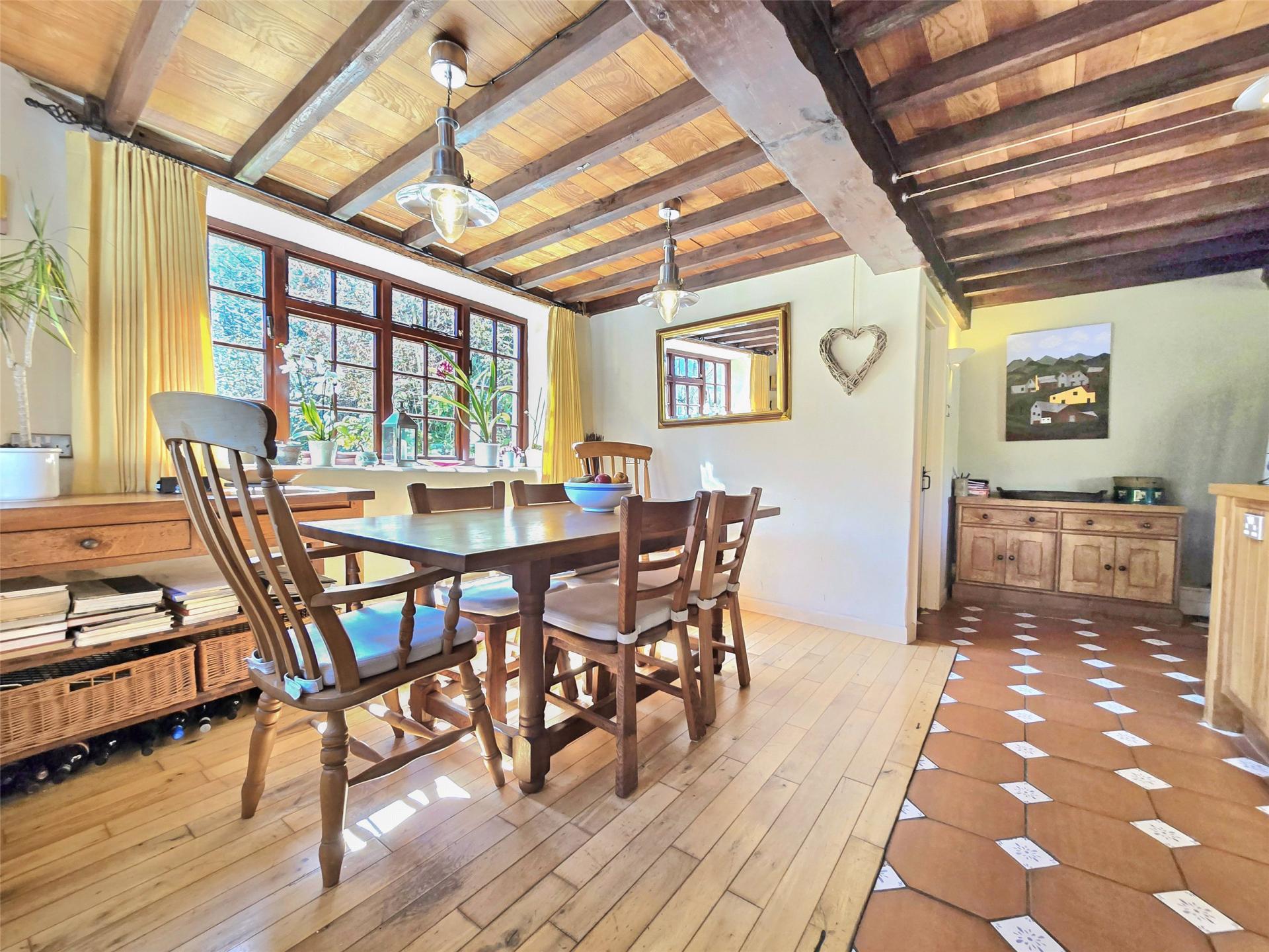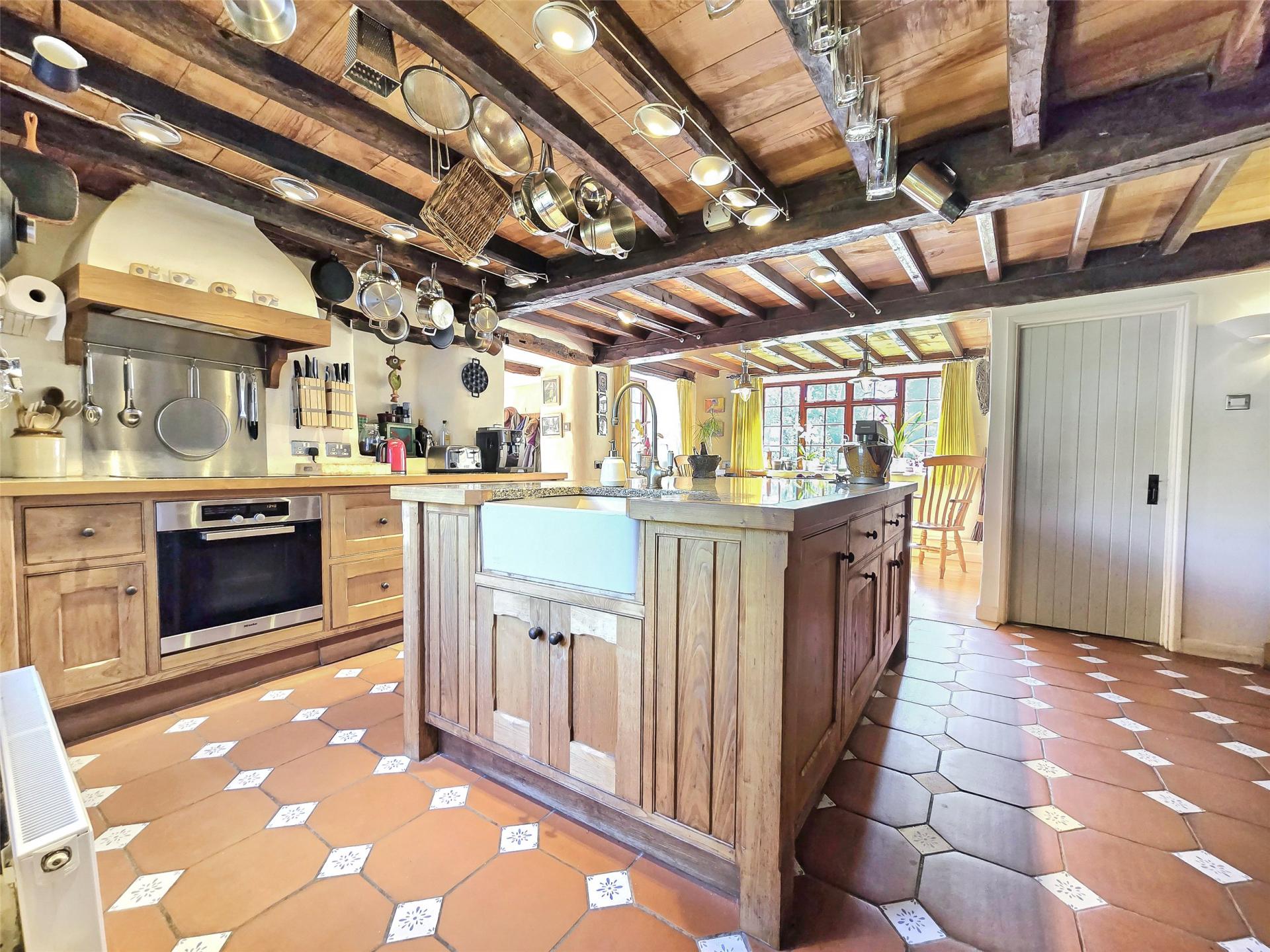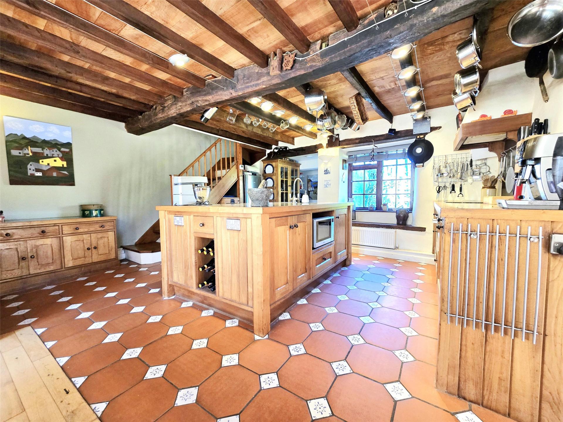 Upon entry, the property immediately impresses with its generously proportioned farmhouse kitchen and dining area. A delightful window frames views of the garden and floods the space with natural light, while the well-appointed kitchen features a range of wall and base units, an integral electric oven, induction hob, dishwasher, and a central island incorporating the sink—ideal for both family living and entertaining.