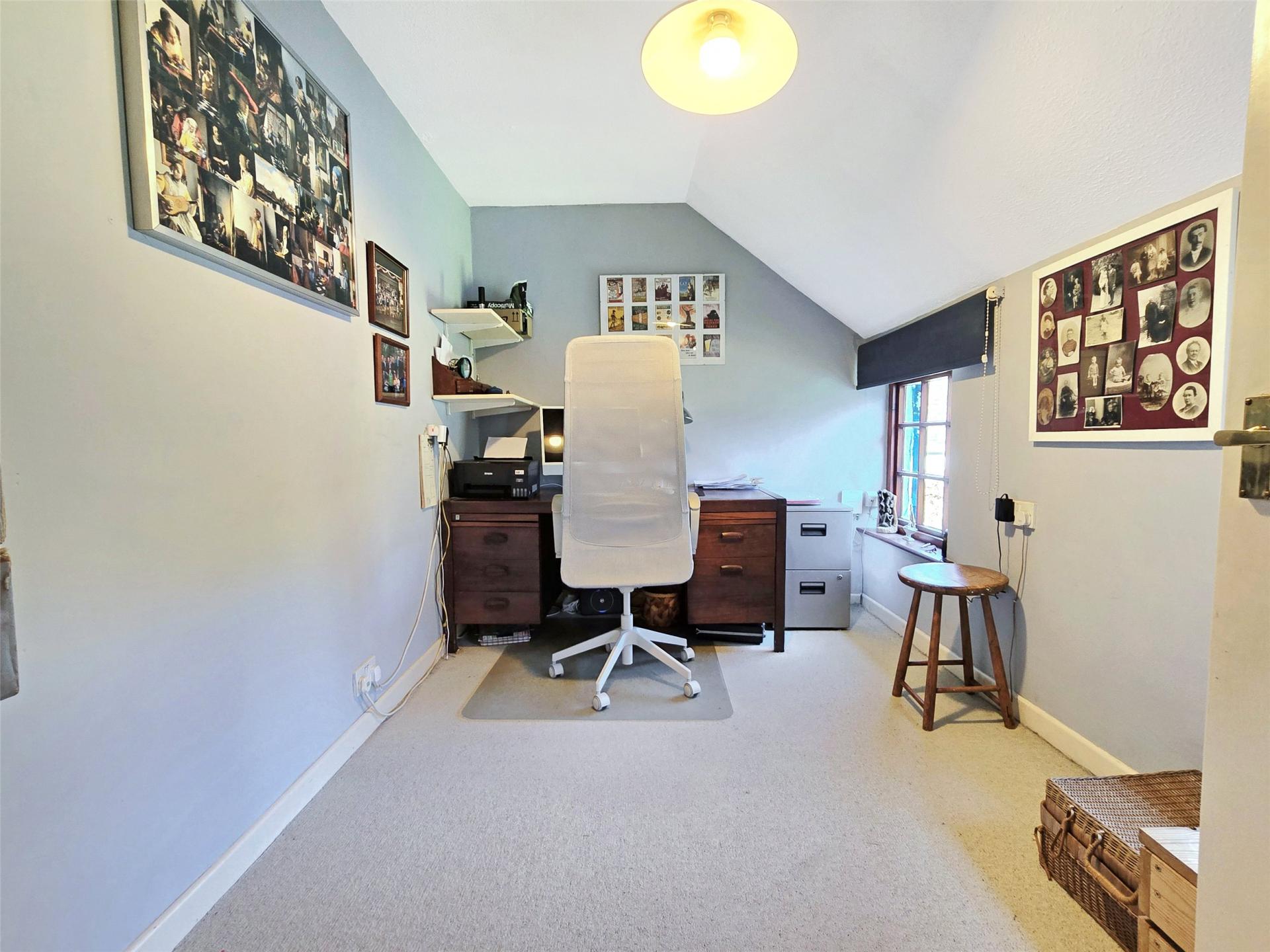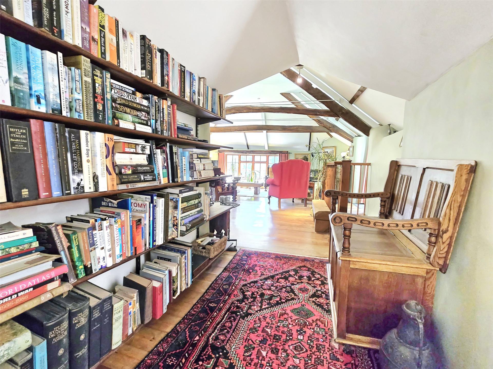 Ascending to the first floor, you are welcomed into a breathtaking, vaulted living space. This magnificent room boasts multi-aspect windows, original exposed beams, wood flooring, and a multi-fuel burning stove—an inviting retreat in all seasons. Two additional double bedrooms complete the first-floor accommodation.