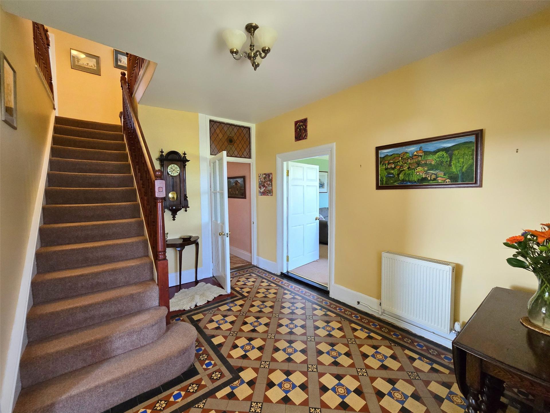 The original entrance door, protected by a pillared storm porch with a slate floor, has an English rose and thistle glass inset which opens up to a welcoming entrance hallway with Victorian tiled floor.