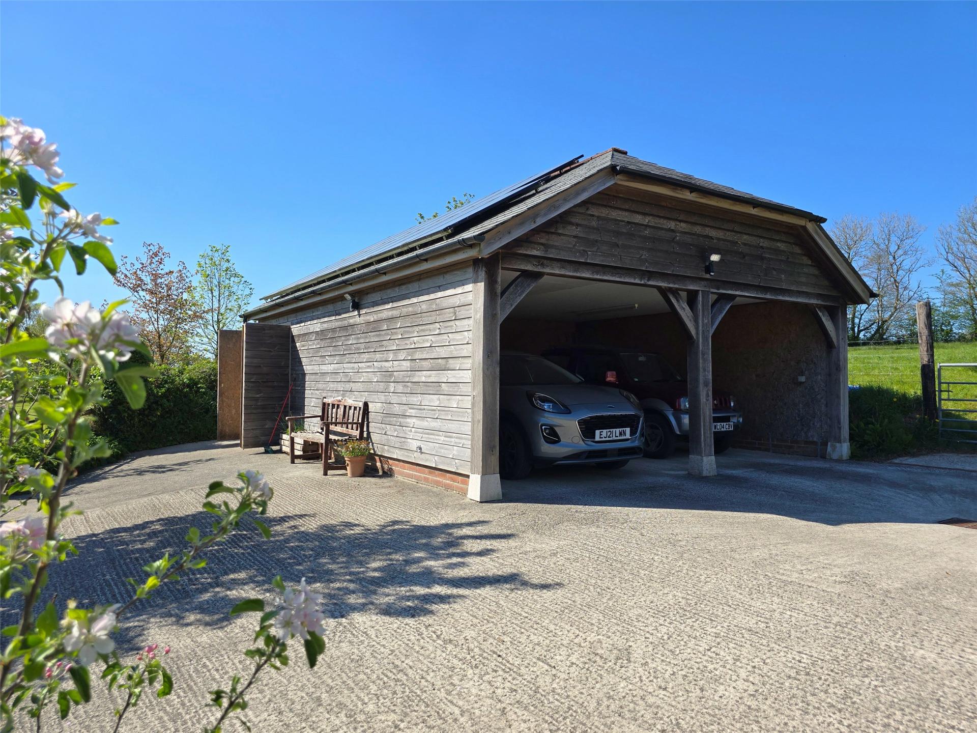 There is a substantial concrete driveway providing enough parking for numerous types of vehicles, which leads to an open fronted, oak framed double garage with an attached workshop to the rear.