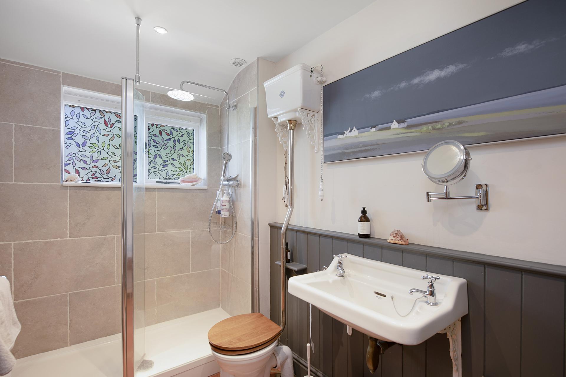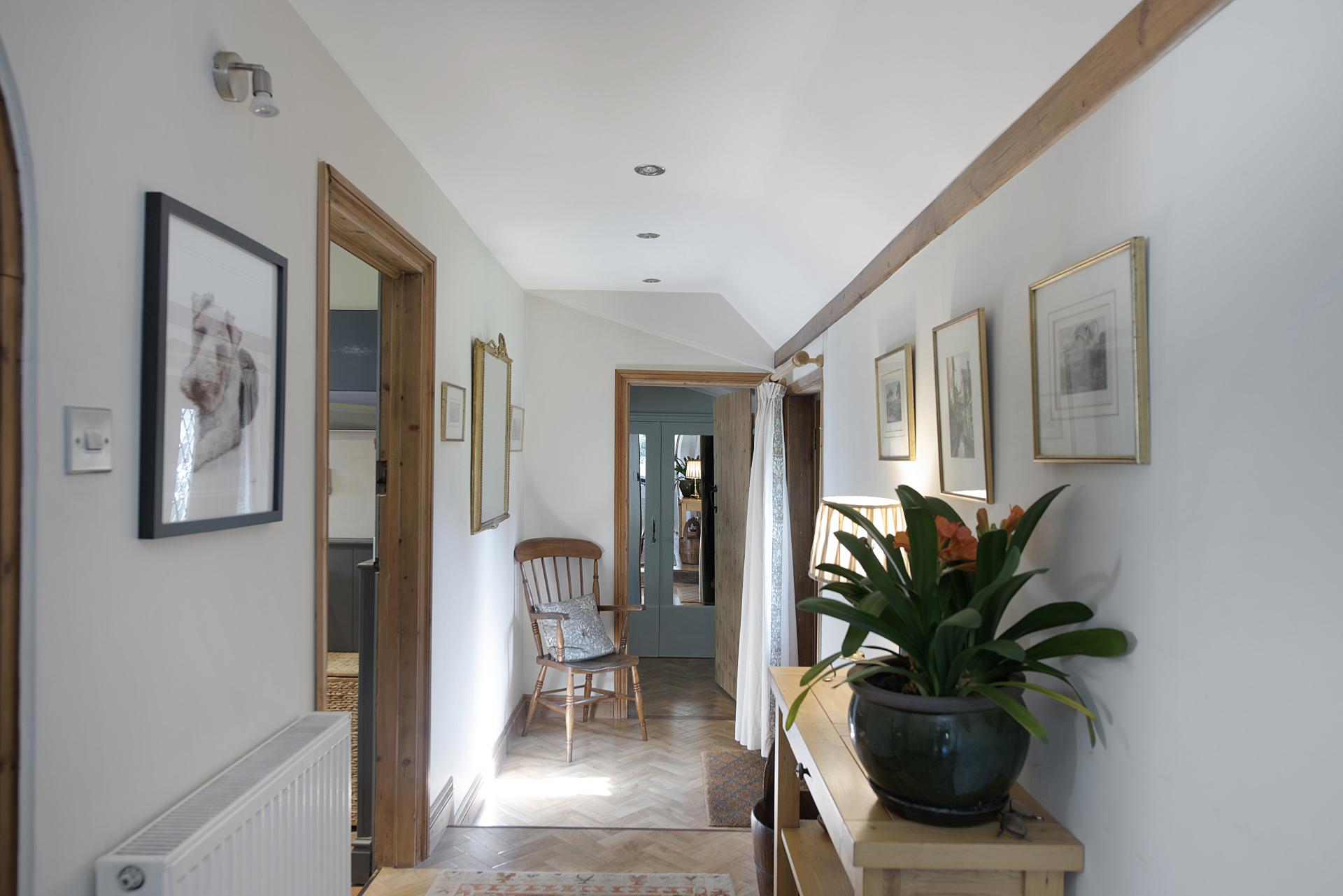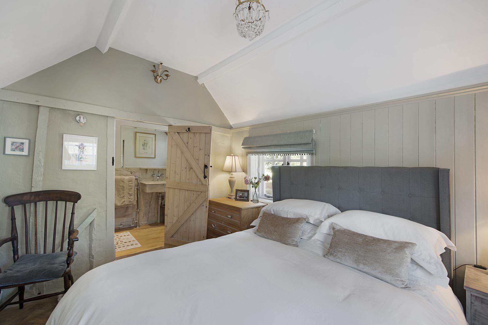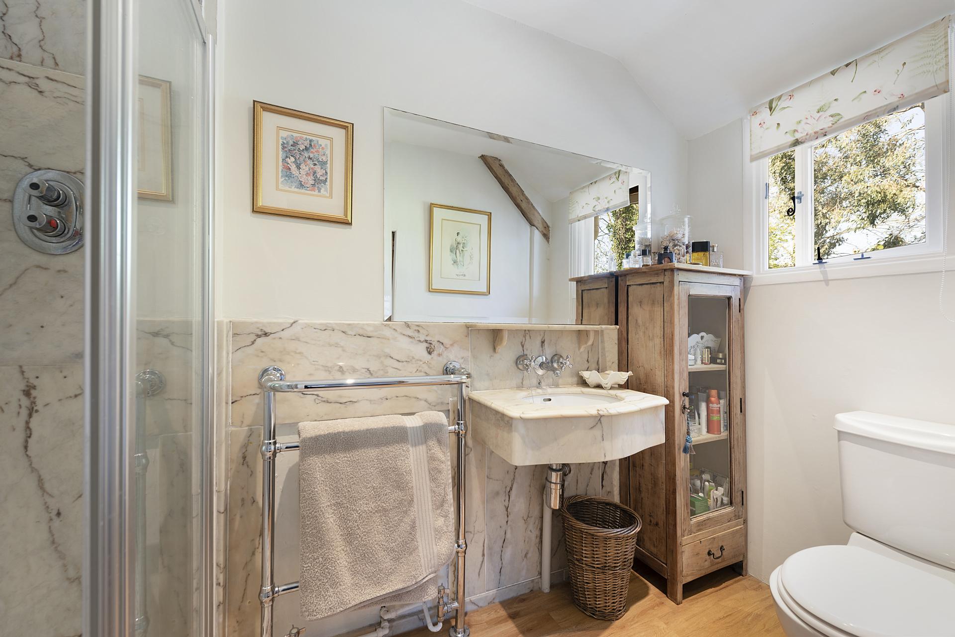 The ground-floor master bedroom is elegantly appointed, featuring panelled walls, exposed woodwork, a walk-in wardrobe, and an en suite shower room adorned with luxurious marble tiling. Additionally, the ground floor benefits from a stylish bathroom complete with a traditional roll-top bath, as well as a practical utility/boot room.