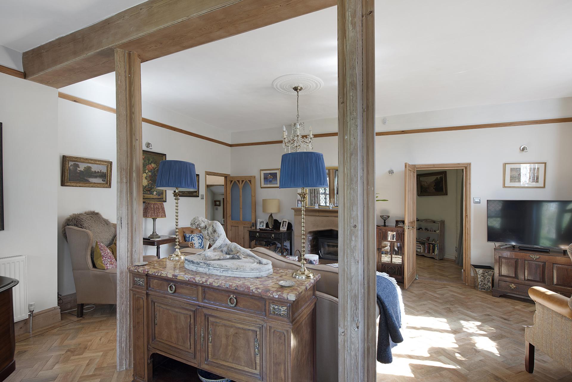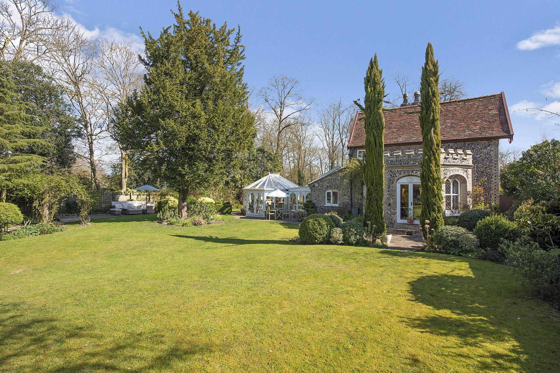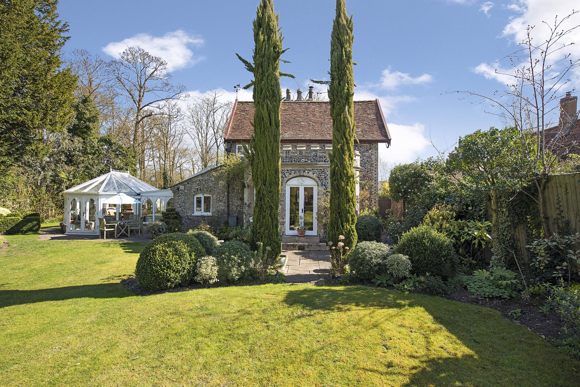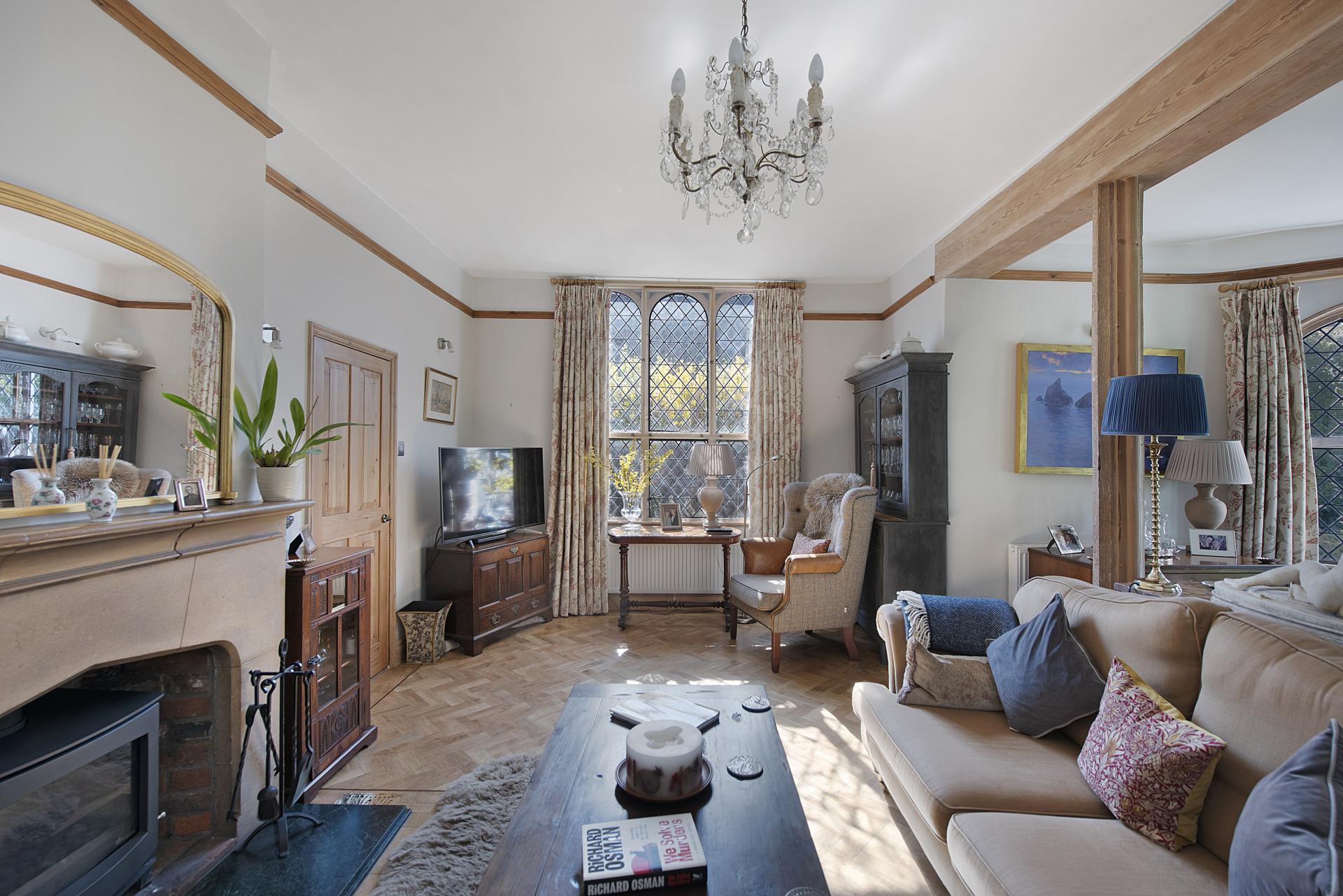 STEP INSIDE A significant portion of the accommodation is thoughtfully arranged on the ground floor, where both the entrance hall and living room feature a wealth of character and charm. These spaces showcase exquisite architectural details, making a feature of the original Georgian flint walls and feature windows. The superb living room also includes a striking stone fireplace with a marble hearth, a wood-burning stove, and polished wood flooring. French doors open onto the gardens, seamlessly blending indoor and outdoor living,