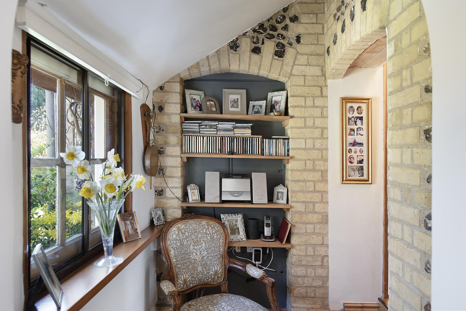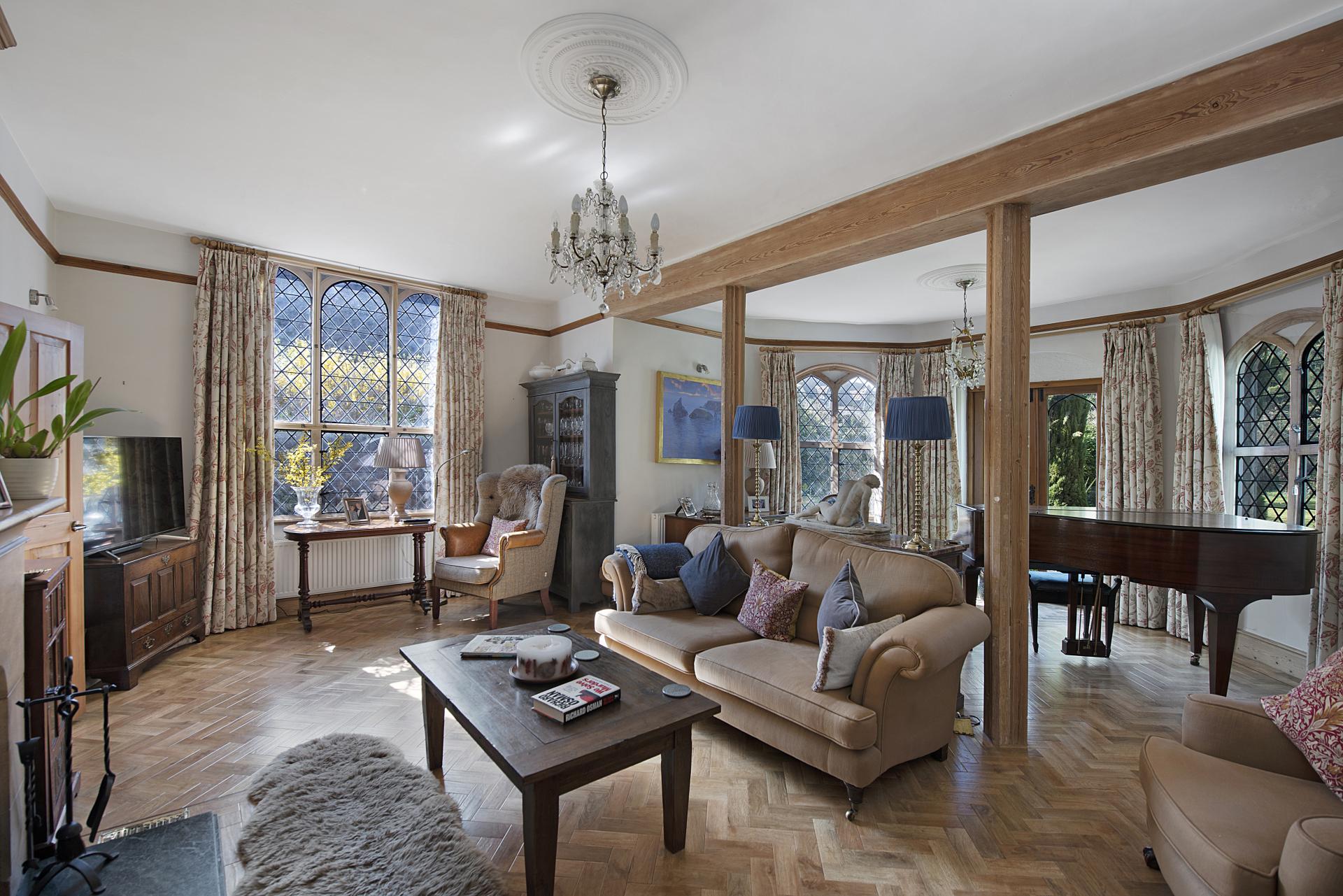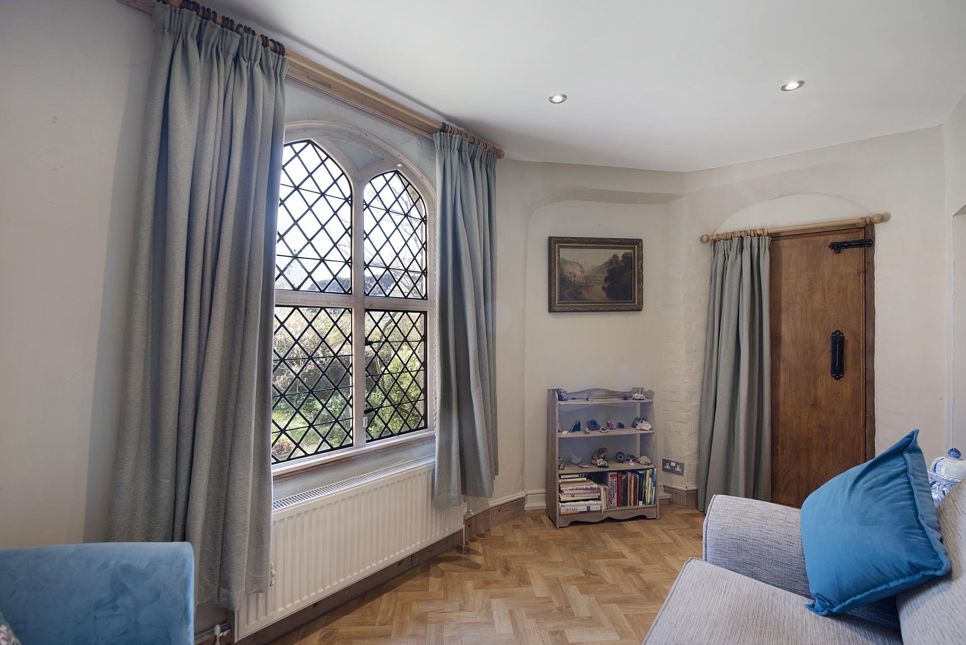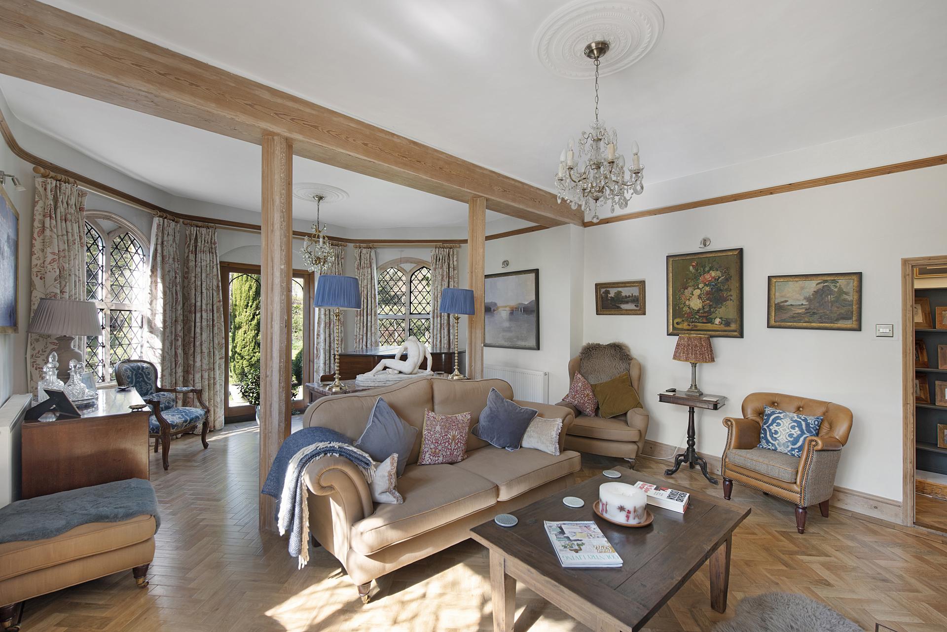 STEP INSIDE A significant portion of the accommodation is thoughtfully arranged on the ground floor, where both the entrance hall and living room feature a wealth of character and charm. These spaces showcase exquisite architectural details, making a feature of the original Georgian flint walls and feature windows. The superb living room also includes a striking stone fireplace with a marble hearth, a wood-burning stove, and polished wood flooring. French doors open onto the gardens, seamlessly blending indoor and outdoor living,