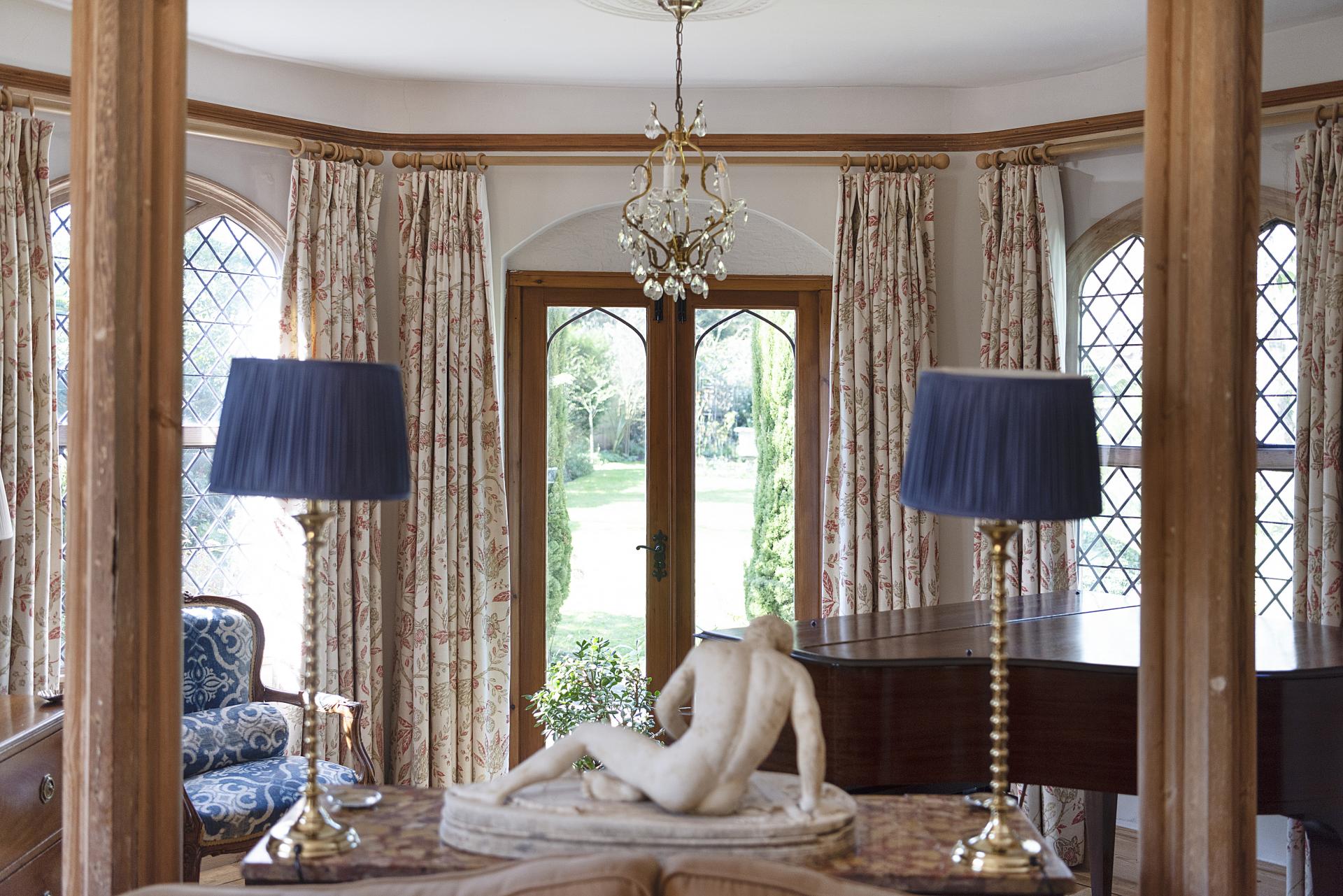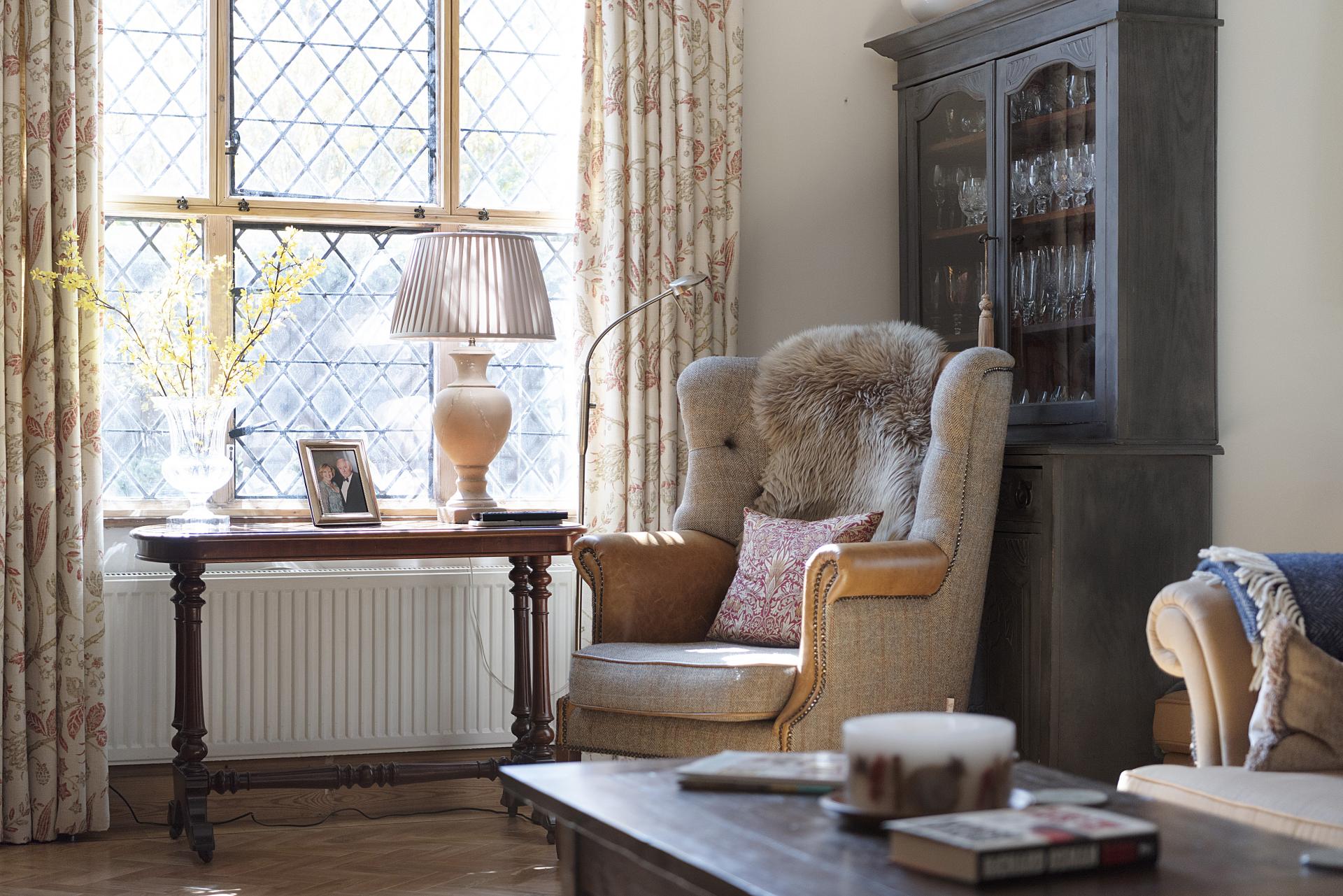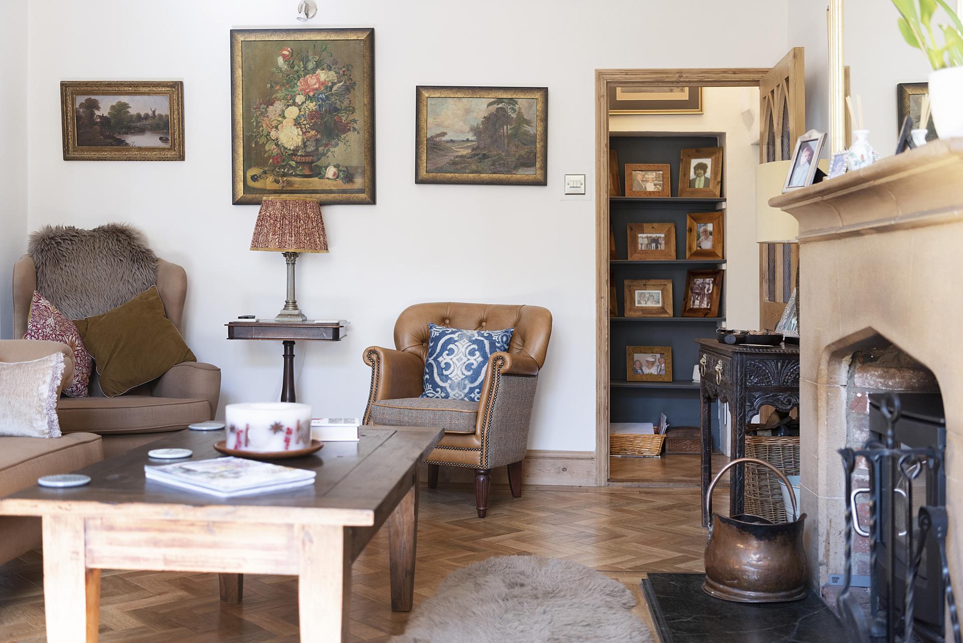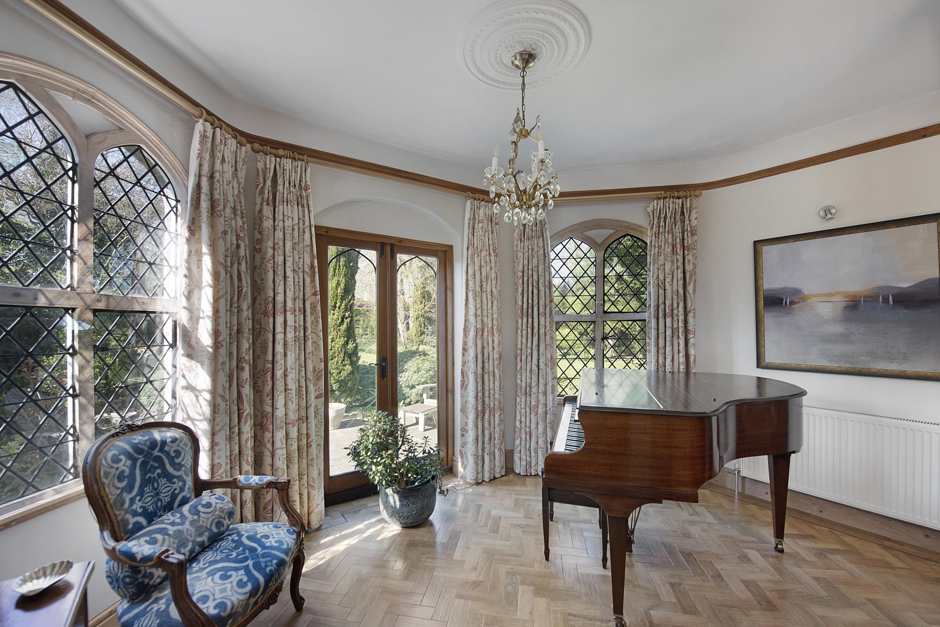 STEP INSIDE A significant portion of the accommodation is thoughtfully arranged on the ground floor, where both the entrance hall and living room feature a wealth of character and charm. These spaces showcase exquisite architectural details, making a feature of the original Georgian flint walls and feature windows. The superb living room also includes a striking stone fireplace with a marble hearth, a wood-burning stove, and polished wood flooring. French doors open onto the gardens, seamlessly blending indoor and outdoor living,