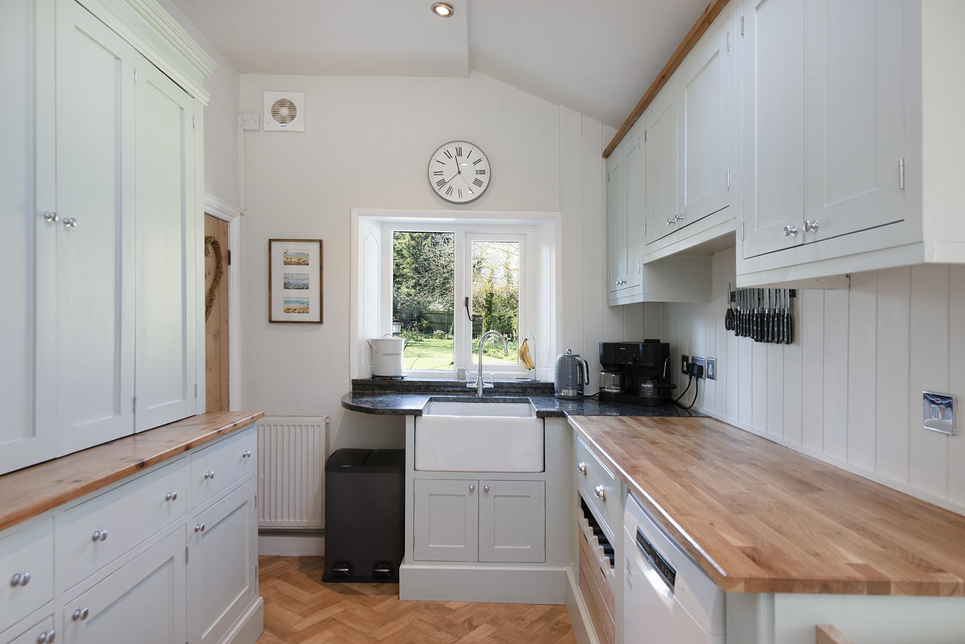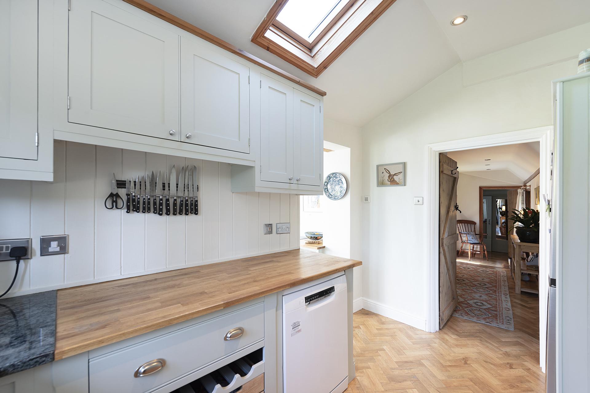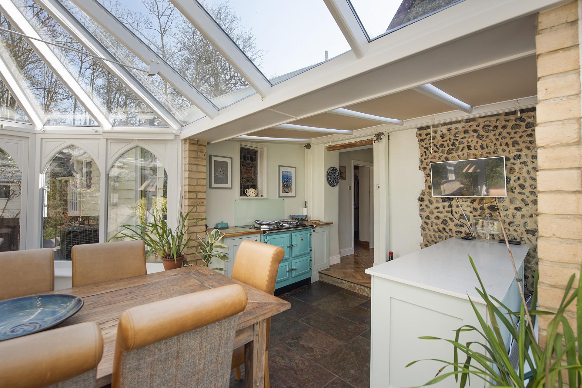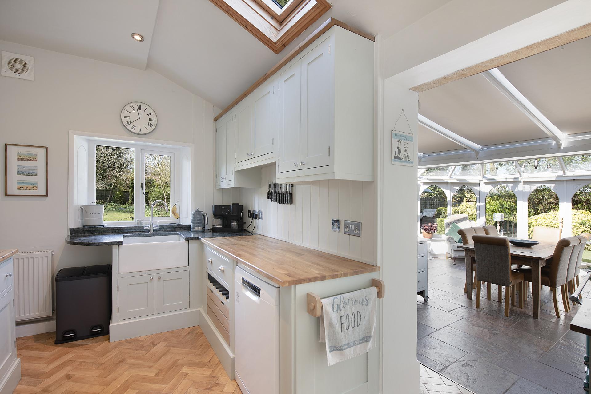 The bespoke, hand-crafted hardwood kitchen is both functional and beautifully designed, incorporating an Esse oven, integrated dishwasher, and a spacious pantry. It flows effortlessly into the impressive garden and dining room, a stunning, octagonal space with expansive glazing that floods the interior with natural light and offers panoramic views of the gardens.