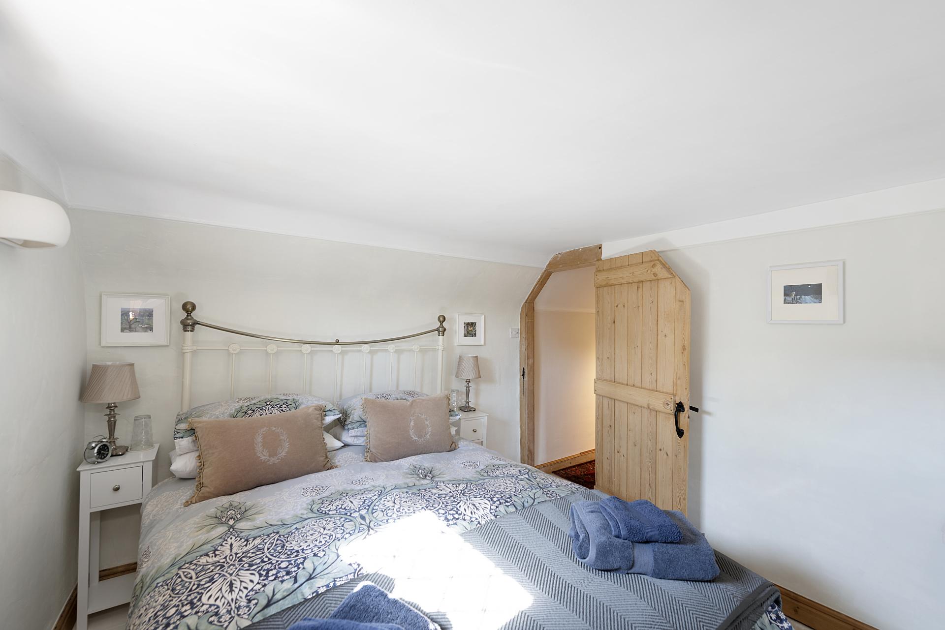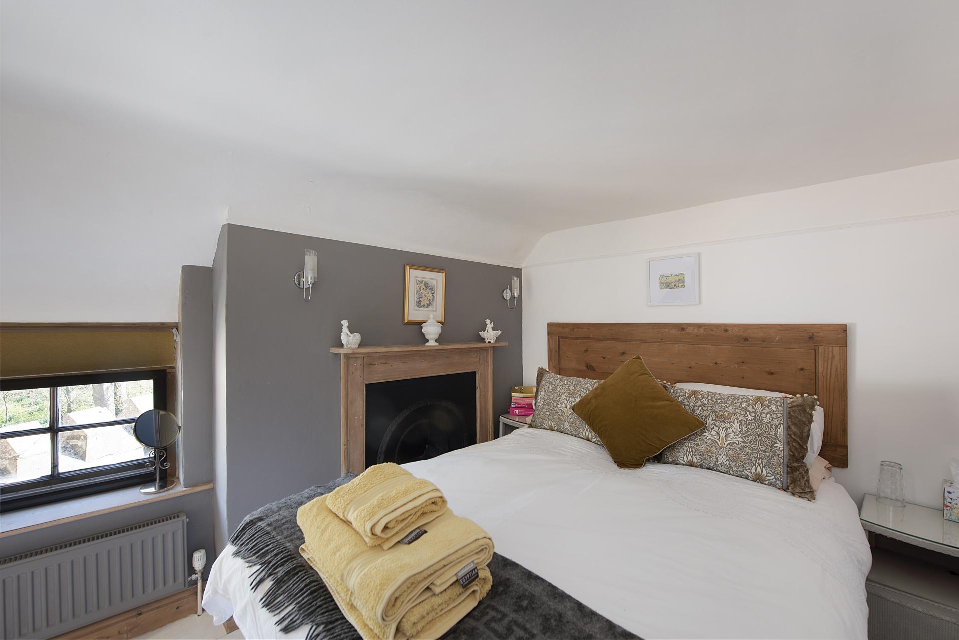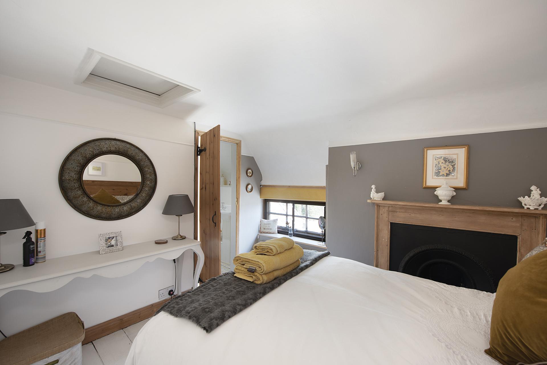 Upstairs, two further bedrooms enjoy picturesque views over the gardens and village. Each is full of character, with exposed floorboards, while one features a charming fireplace with an antique pine surround, adding to the home's period appeal.