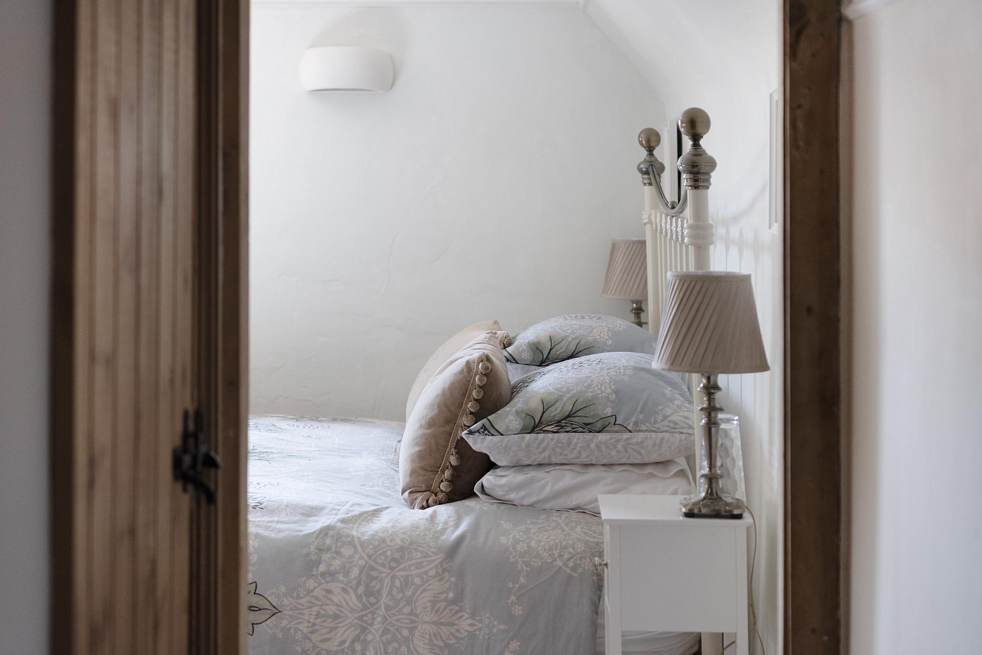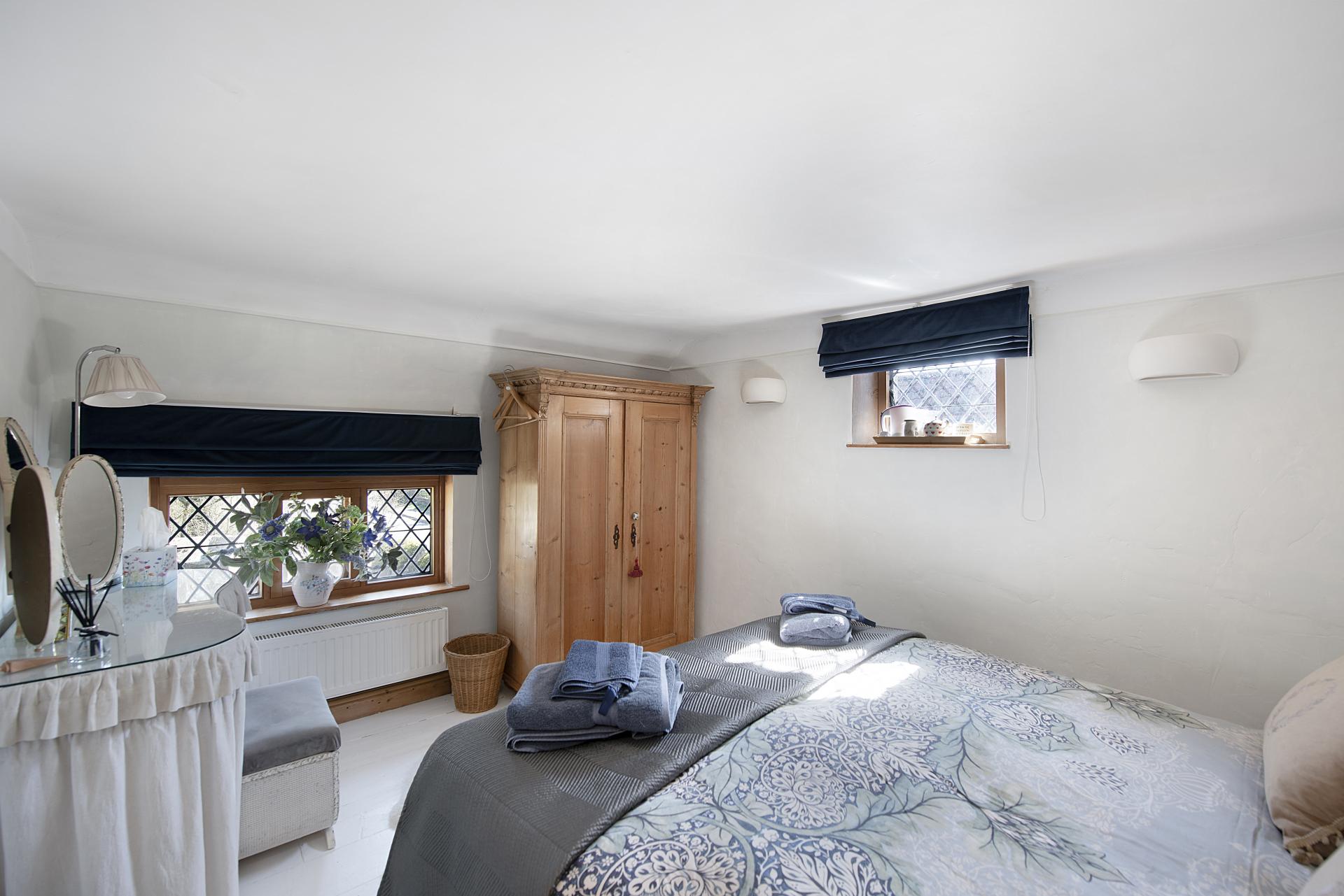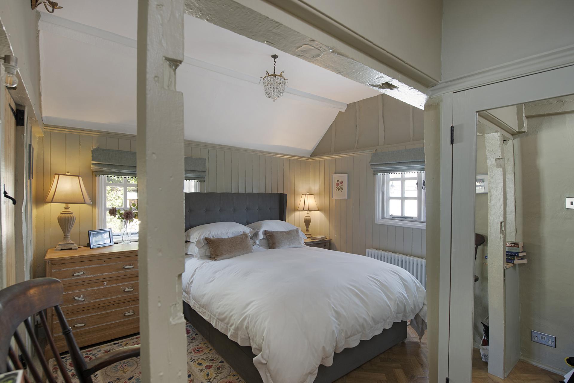 Upstairs, two further bedrooms enjoy picturesque views over the gardens and village. Each is full of character, with exposed floorboards, while one features a charming fireplace with an antique pine surround, adding to the home's period appeal.