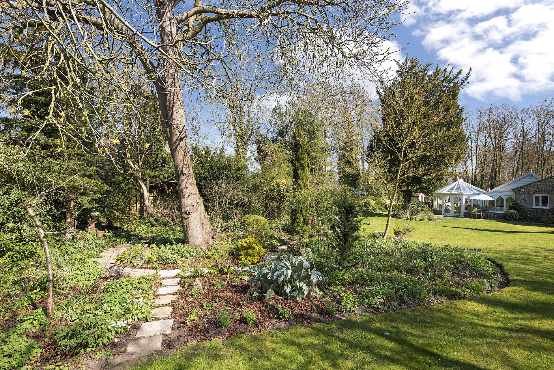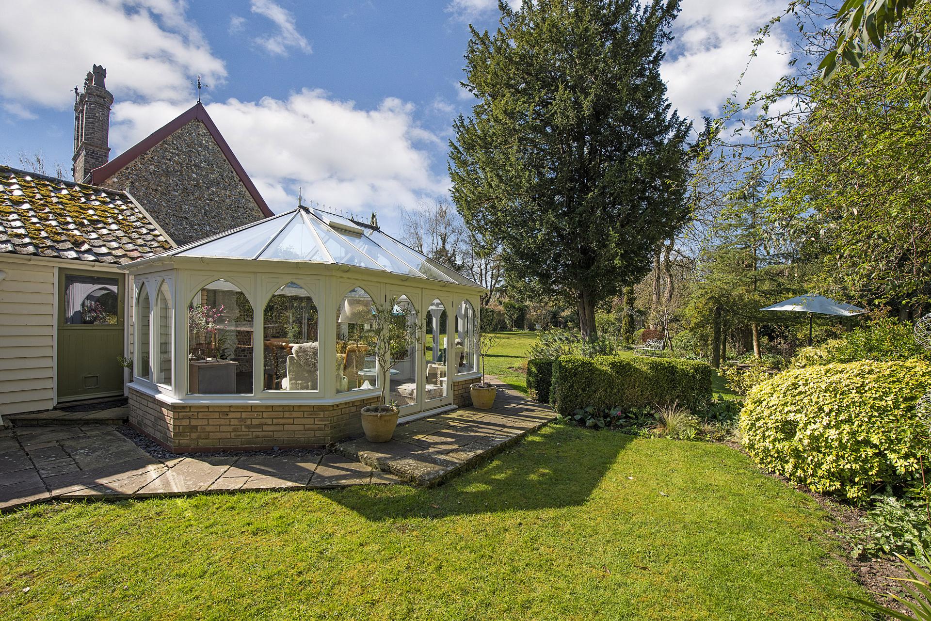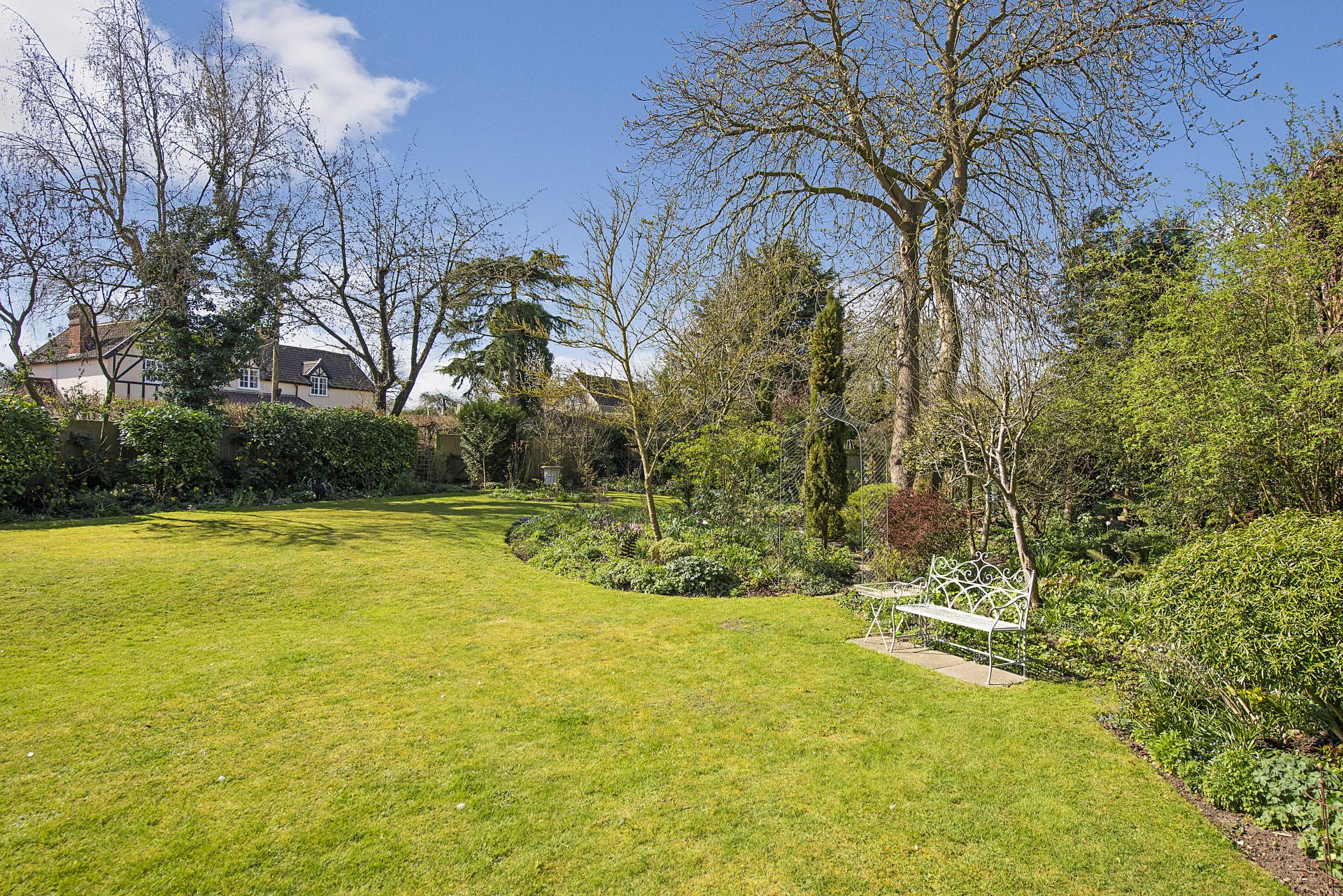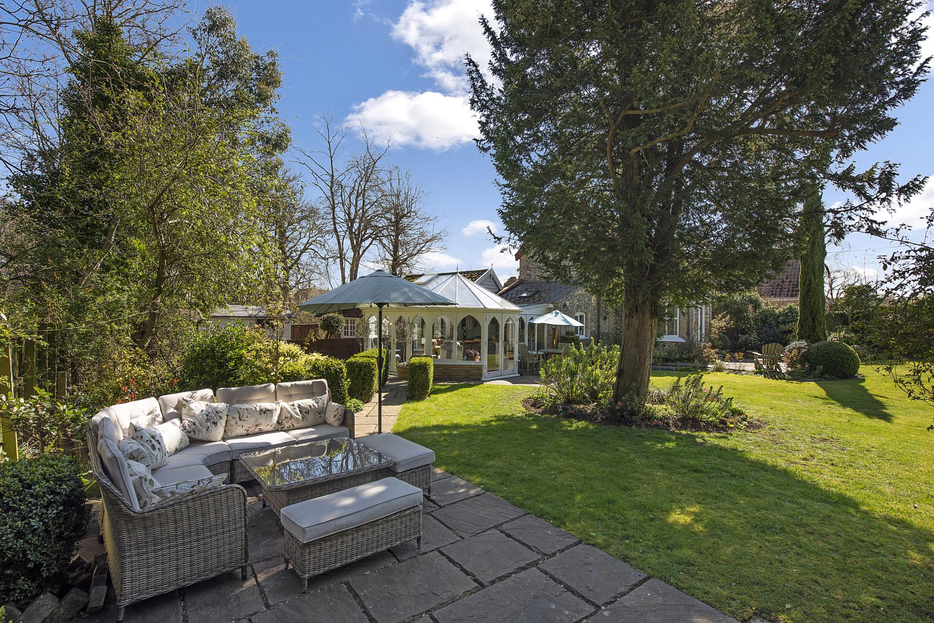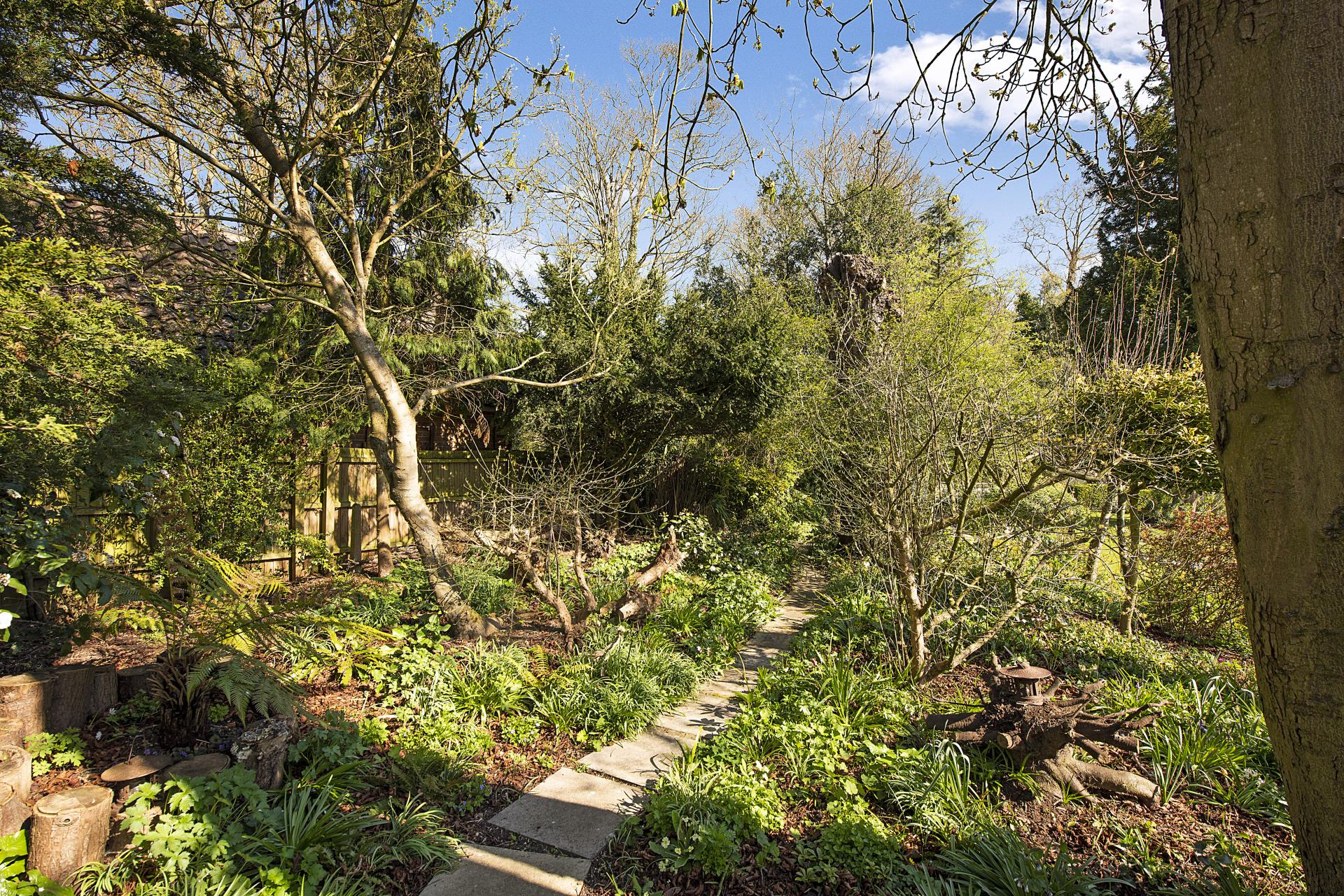 STEP OUTISDE The gardens are a true highlight of the property, offering exceptional privacy and seclusion throughout the seasons. A beautifully maintained formal lawn is framed by an exquisite array of specimen trees, vibrant flowerbeds, and carefully curated shrubs, creating a picturesque and tranquil setting. Adjacent to the side and rear of the cottage, a charming stone and brick terrace provides delightful seating areas, ideal for outdoor relaxation and entertaining. To the front, additional formal lawns and classic cottage gardens enhance the home's character, while a private driveway offers convenient off-road parking and leads to a well-appointed garage.