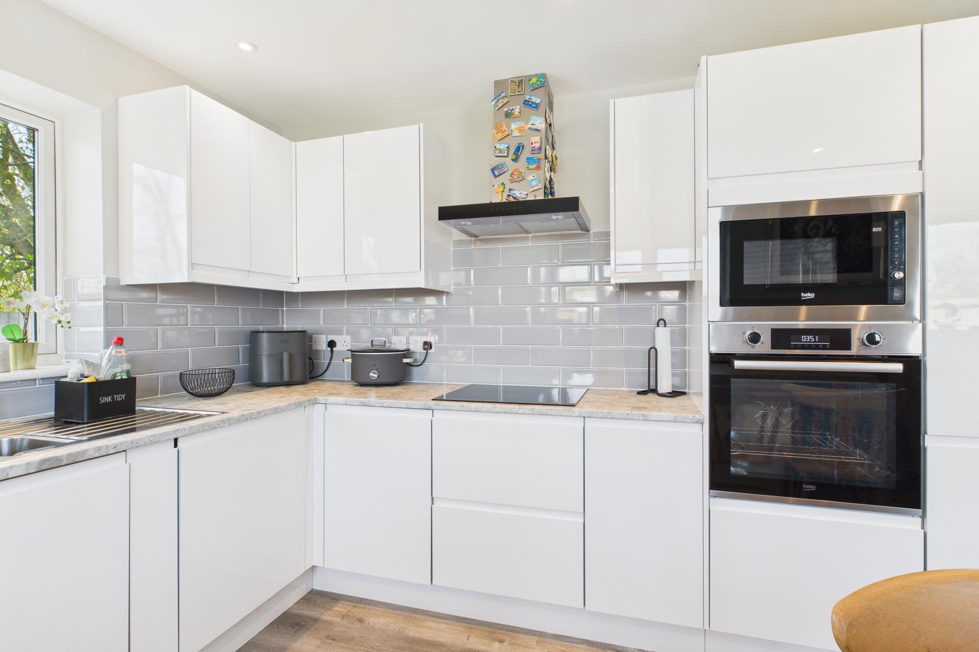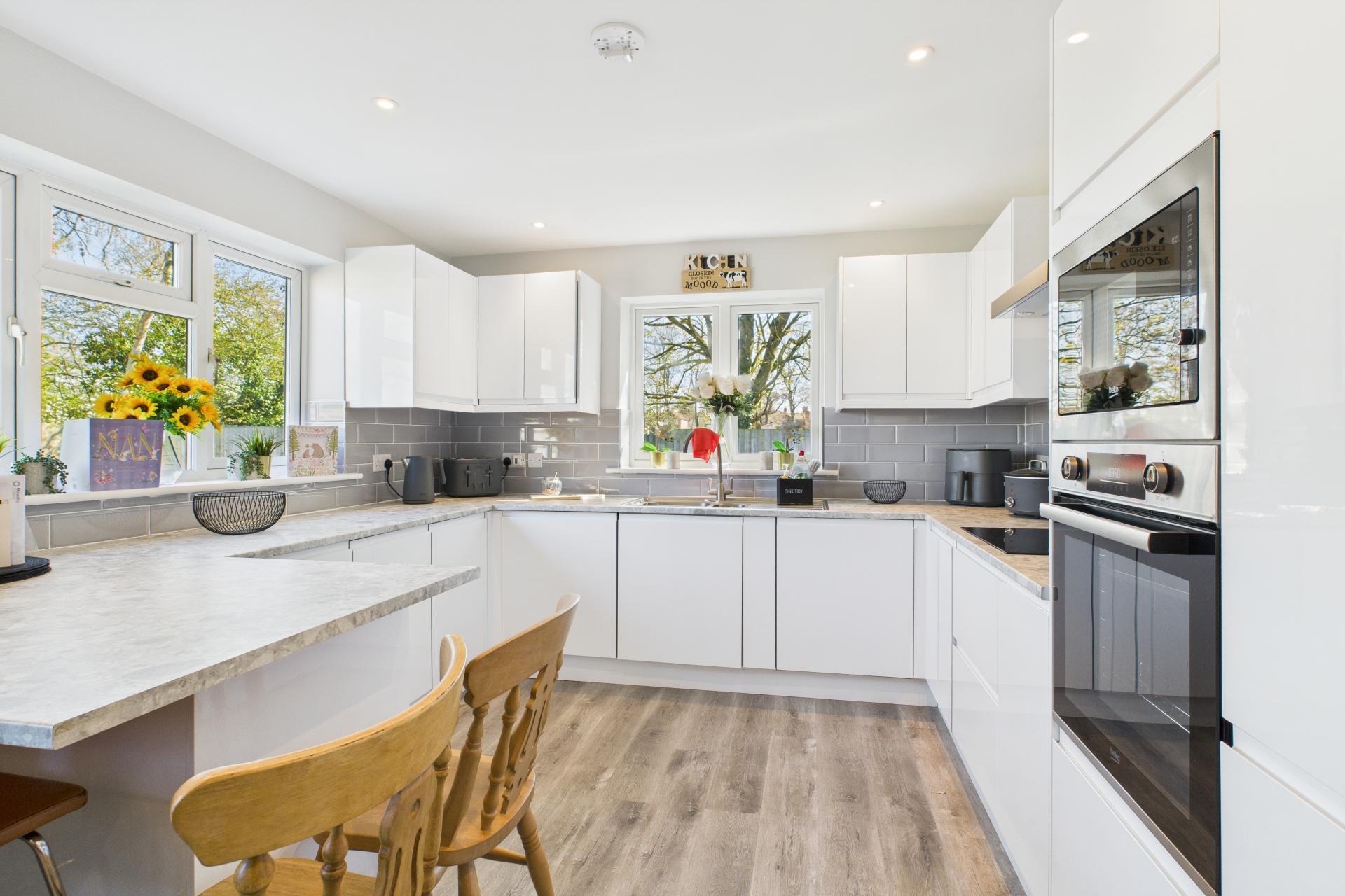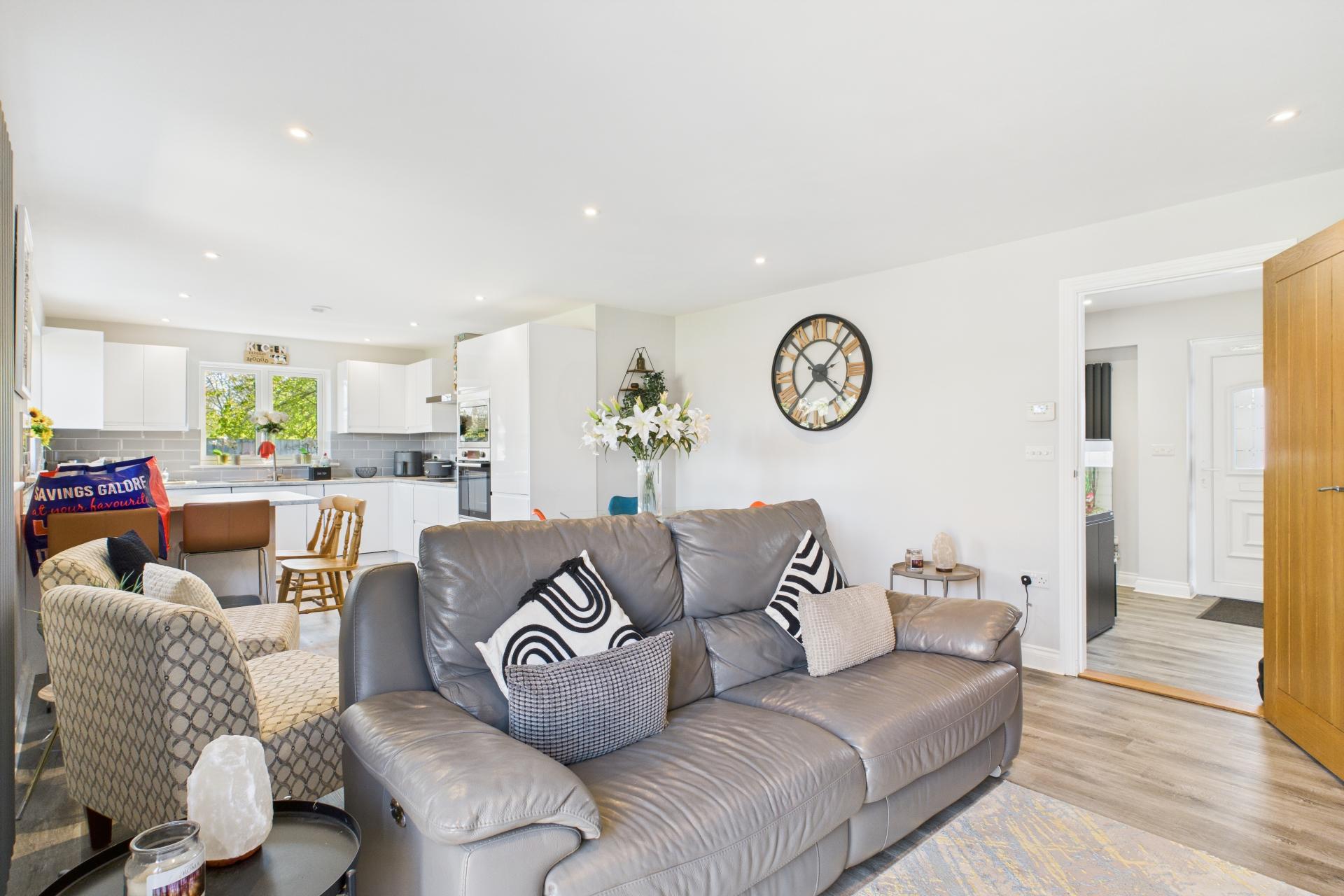 This versatile space is ideal for both entertaining and everyday living, with ample room for lounging, dining, and cooking. The kitchen is complete with a range of fitted wall and cupboard units, an integrated induction hob with extractor fan over, built-in oven and microwave, fridge/freezer, stainless steel sink, and a handy breakfast bar for casual dining or entertaining. The room also benefits from multiple windows and a door to the exterior, allowing for excellent natural light.