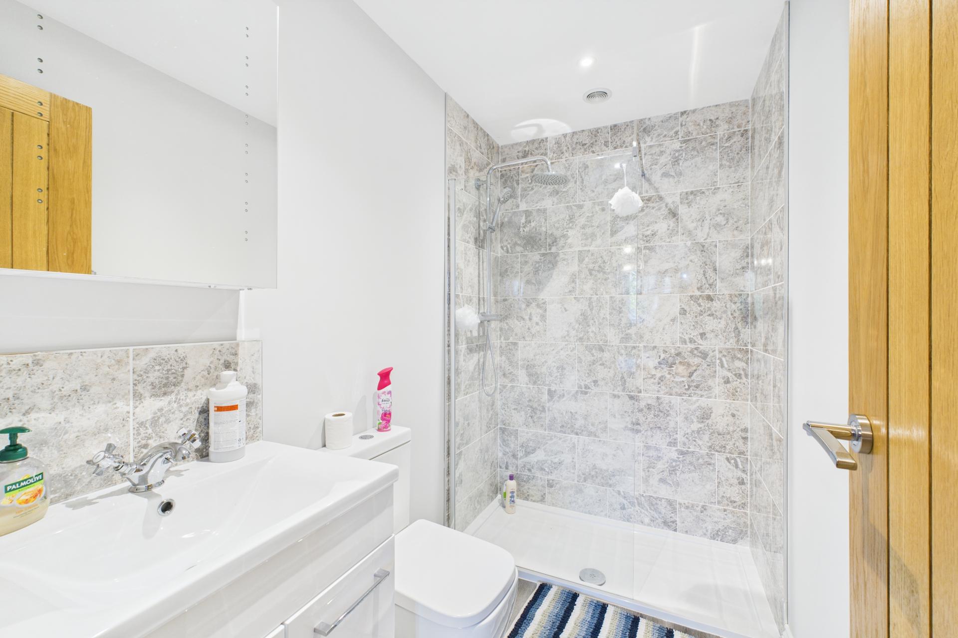 Complete with a walk-in shower cubicle, WC and vanity sink unit.
