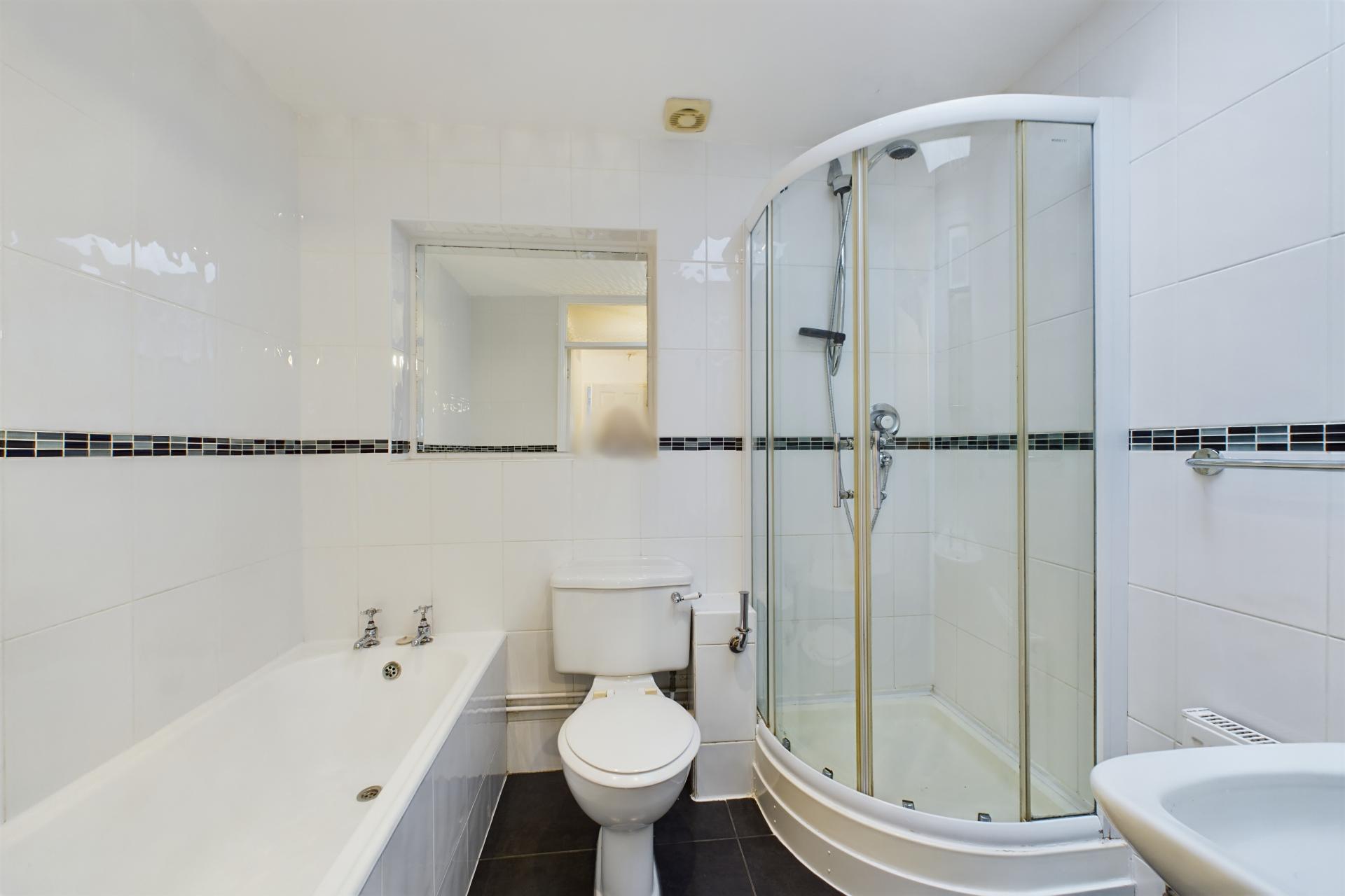 Down the hallway, you'll discover three bedrooms. The master bedroom is a generous double with fitted wardrobes, while the second bedroom is filled with natural light and overlooks the garden. The third bedroom is a cosy single, perfect for an office or study, and features a ladder leading up to the loft, providing access to two attic rooms that offer excellent storage options. Additionally, there is a family bathroom equipped with a corner shower cubicle, inset bath, hand wash basin, and WC.