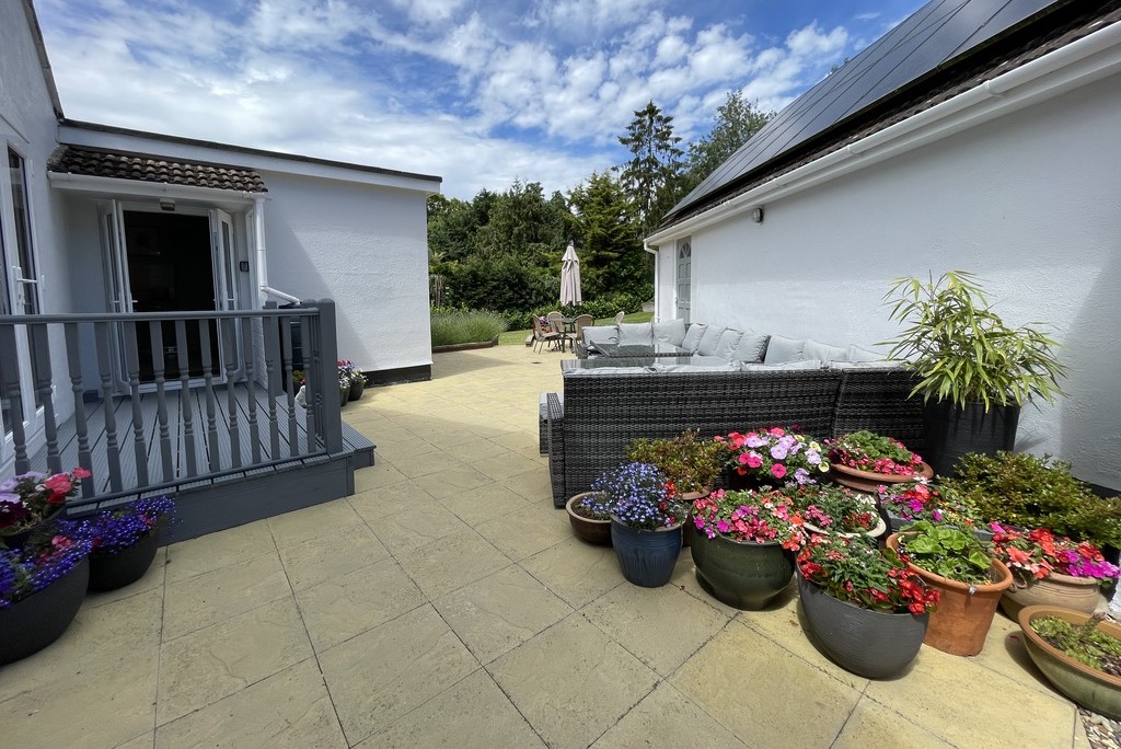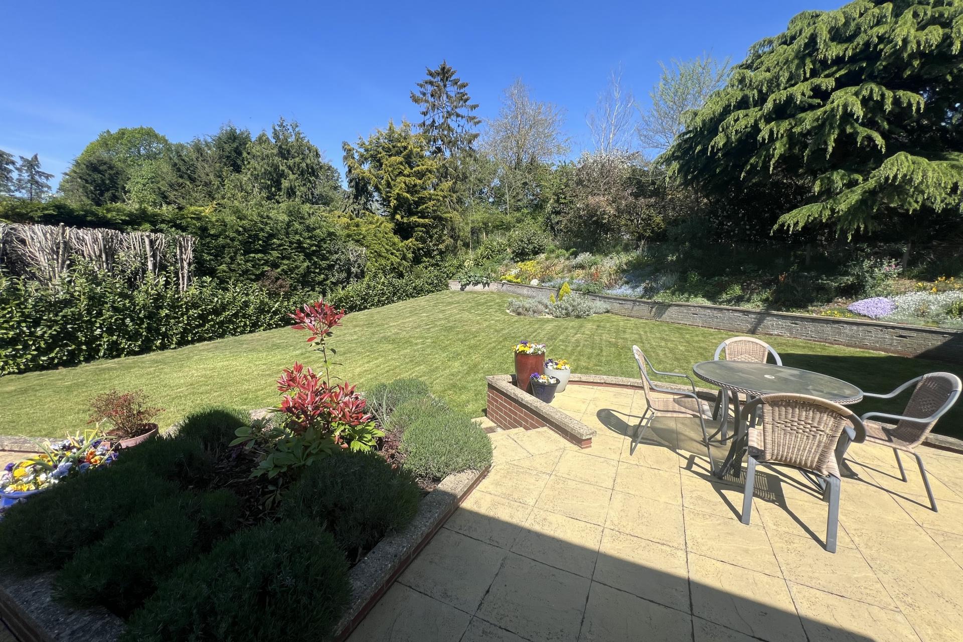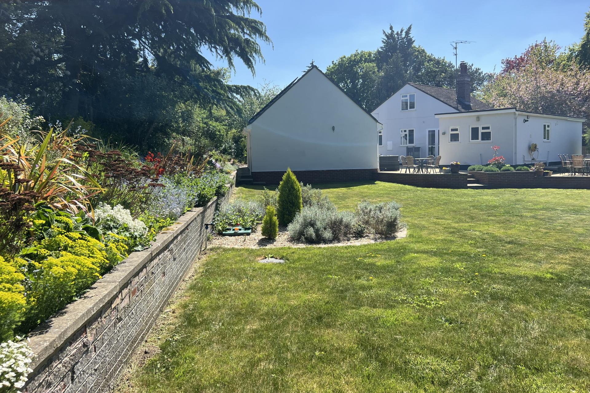 The wrap-around garden, primarily laid to lawn, is a gardener's paradise, featuring an abundance of flower beds, mature trees, and shrubs. This beautifully landscaped area creates a stunning and private outdoor space. Between the house and the garage, there is a spacious patio area, accessible via wooden decking from both the kitchen and the downstairs bedroom. This patio serves as an excellent suntrap, ideal for outdoor entertaining and showcasing the garden's natural beauty.