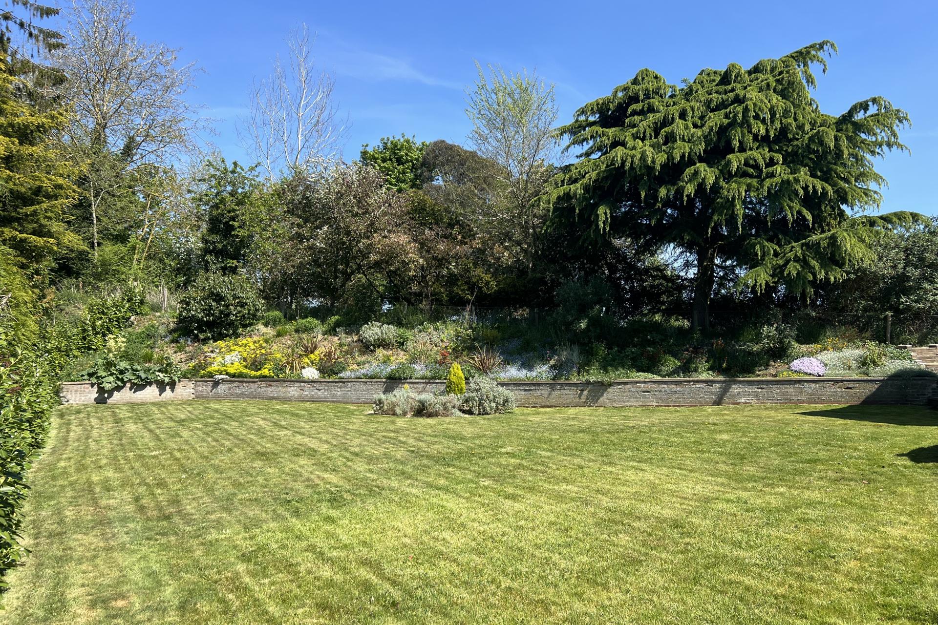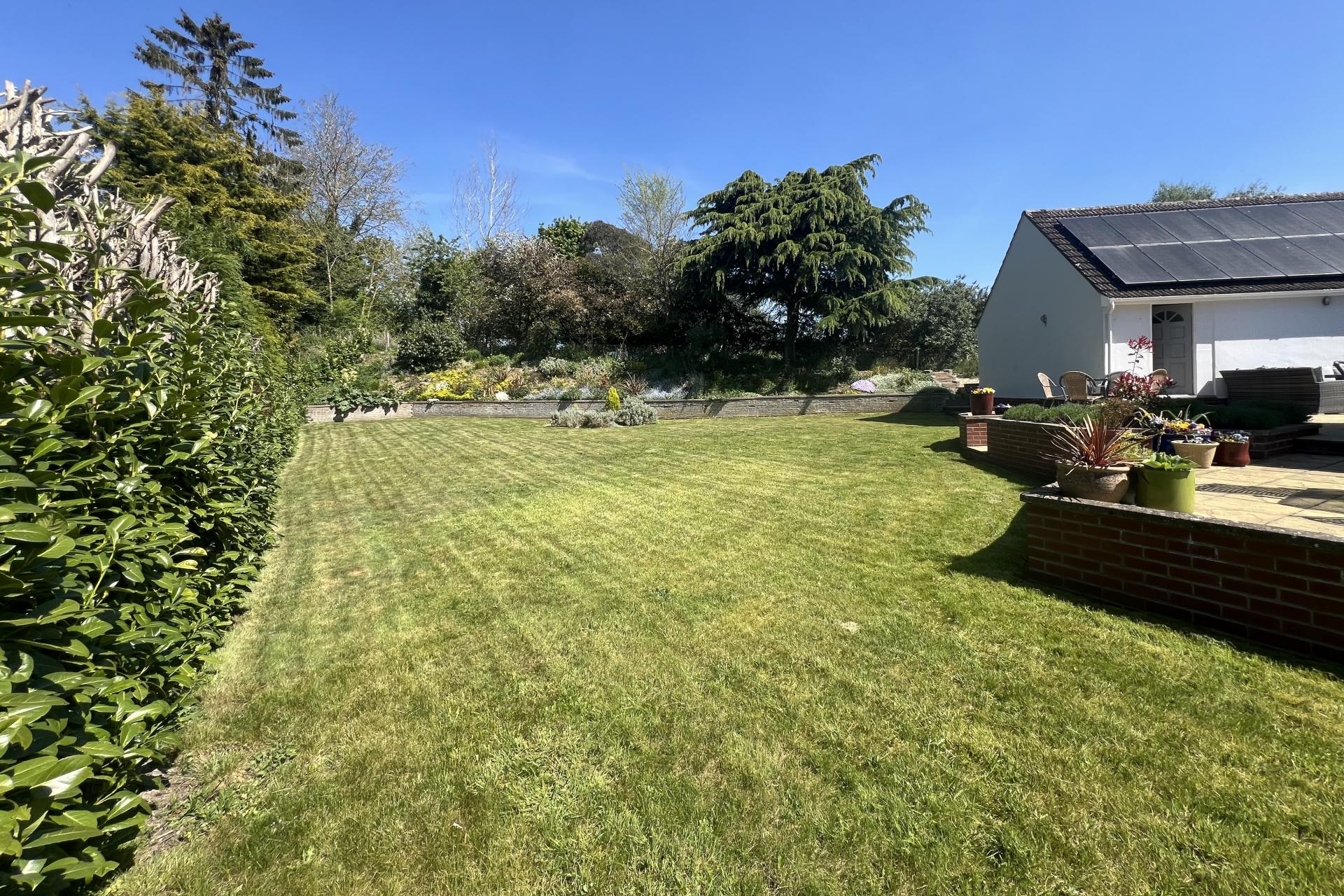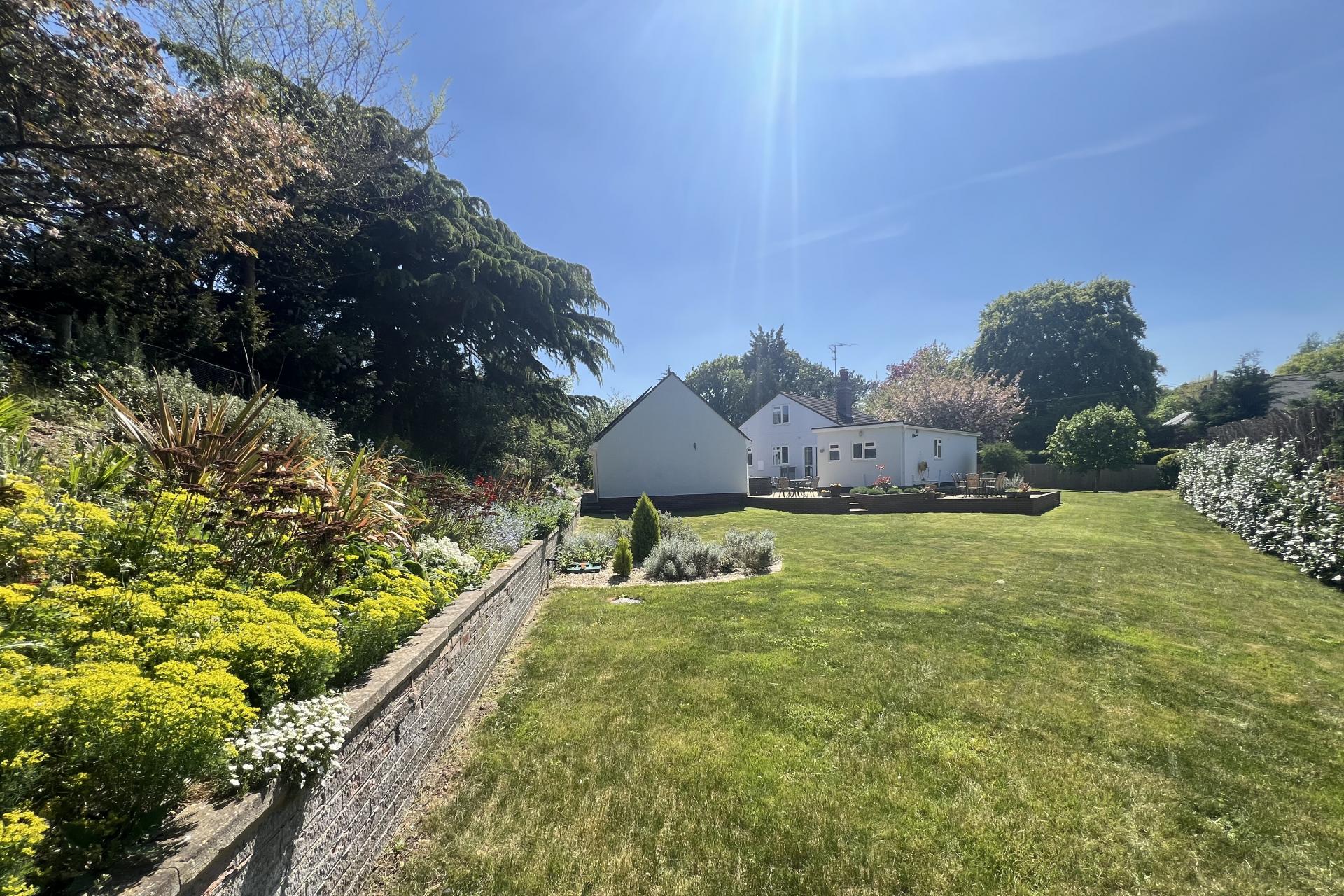 The wrap-around garden, primarily laid to lawn, is a gardener's paradise, featuring an abundance of flower beds, mature trees, and shrubs. This beautifully landscaped area creates a stunning and private outdoor space. Between the house and the garage, there is a spacious patio area, accessible via wooden decking from both the kitchen and the downstairs bedroom. This patio serves as an excellent suntrap, ideal for outdoor entertaining and showcasing the garden's natural beauty.