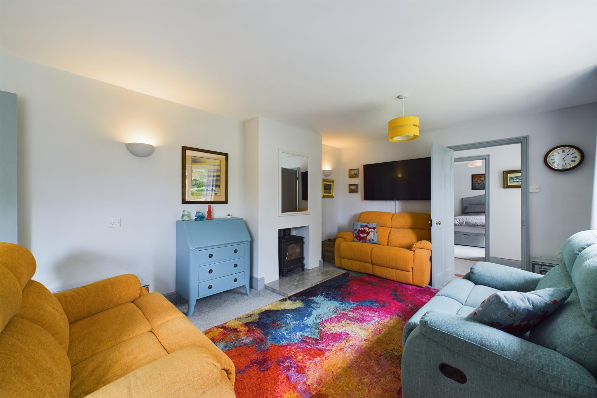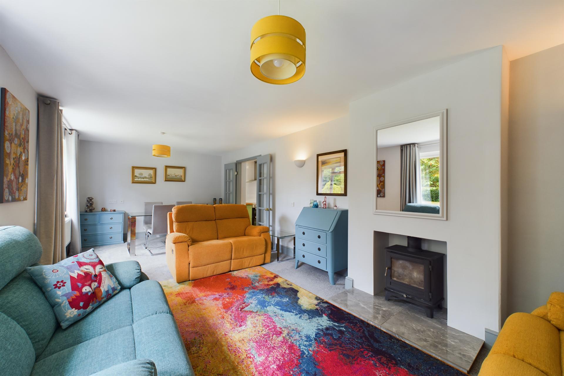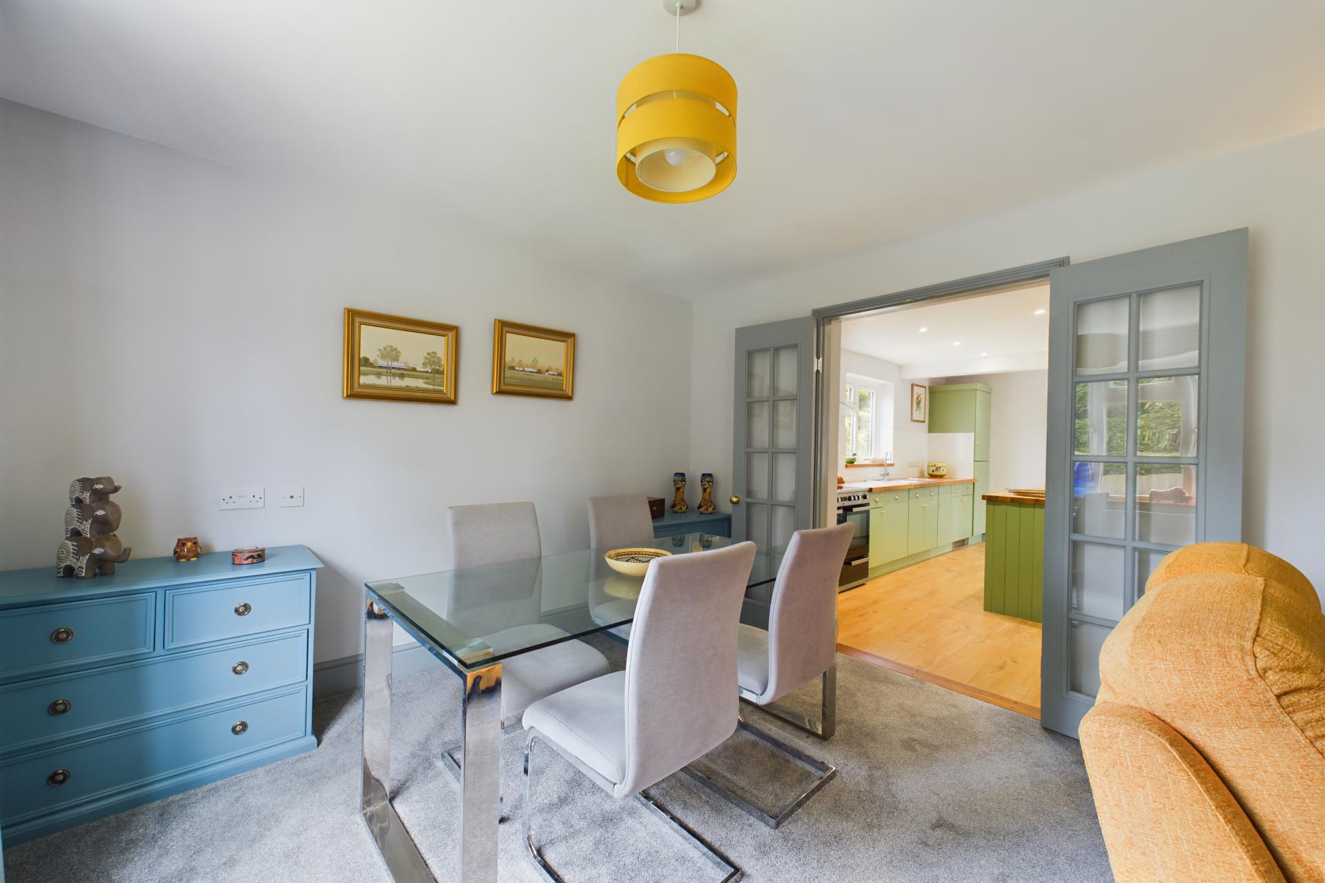 STEP INSIDE Upon entering Willowdene, you are greeted by a welcoming hallway that provides access to the ground floor accommodation. The property is fitted with radiators and plush carpets throughout, ensuring a warm and comfortable environment. The principal bedroom is located on the ground floor and features a large front-aspect window that allows natural light to flood the room. This bedroom is equipped with fitted mirrored wardrobes and an ensuite shower room, complete with a vanity sink unit and WC. On the opposite side of the hallway, you will find the spacious living and dining room, which boasts a charming log burner, perfect for cozy evenings. French doors from this area lead into the light and airy kitchen, which is well-appointed with fitted wall and floor units, hardwood countertops, and a central island with a breakfast bar. The kitchen is also equipped with an integrated dishwasher, boiling water tap, water softener, electric oven, and extractor fan. Adjacent to the kitchen is a utility room with space and plumbing for washing machine and tumbledryer as well as access to the convenient WC. There is also a coat cupboard next to the French doors, which open onto the decking and provide access to the patio. At the rear of the property, there is an additional double bedroom, featuring another set of French doors that open onto the decking. This bedroom is also equipped with a built-in wardrobe, making the room both practical and welcoming. The family bathroom on this floor includes a bath with a shower attachment, a WC, and a vanity sink unit.