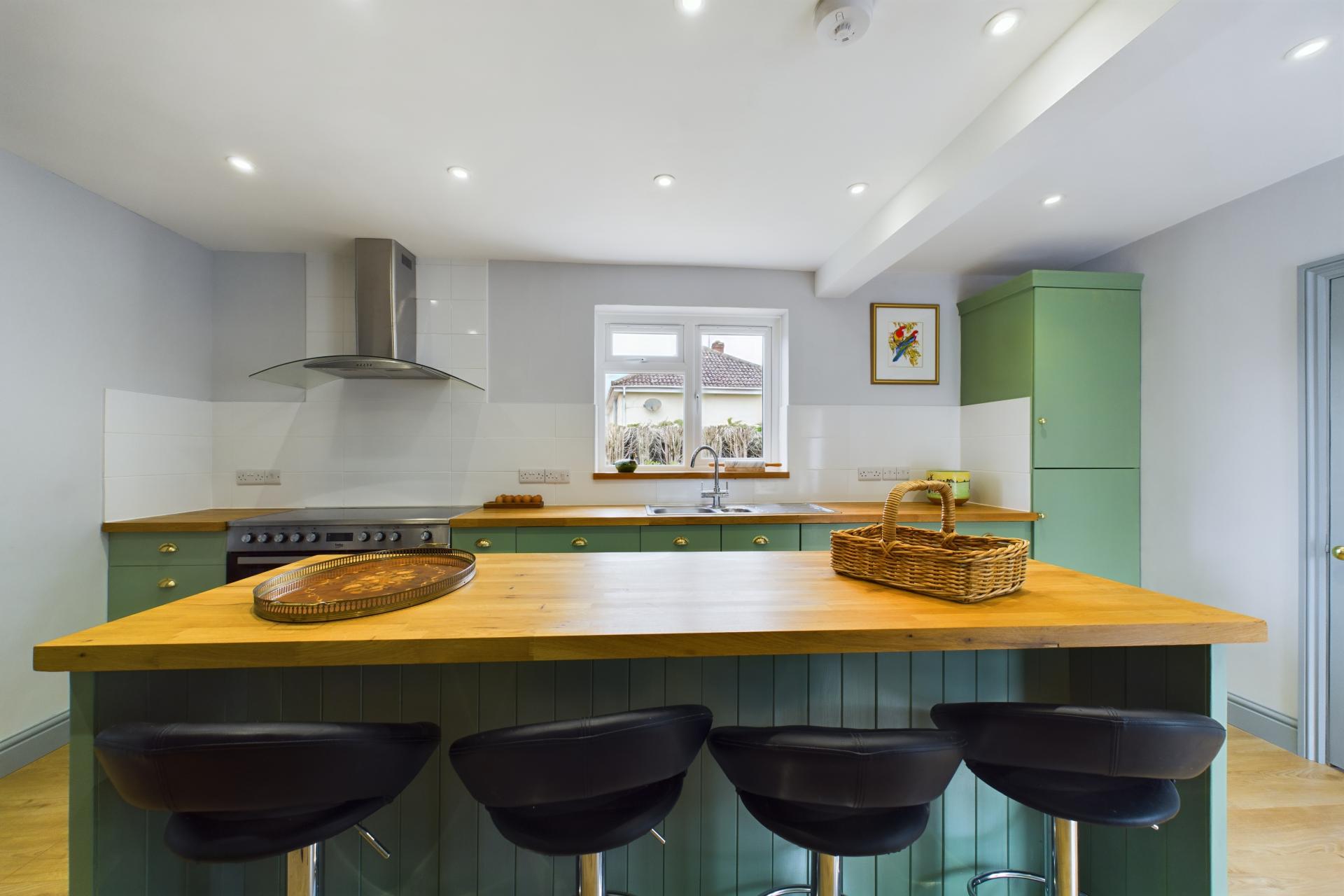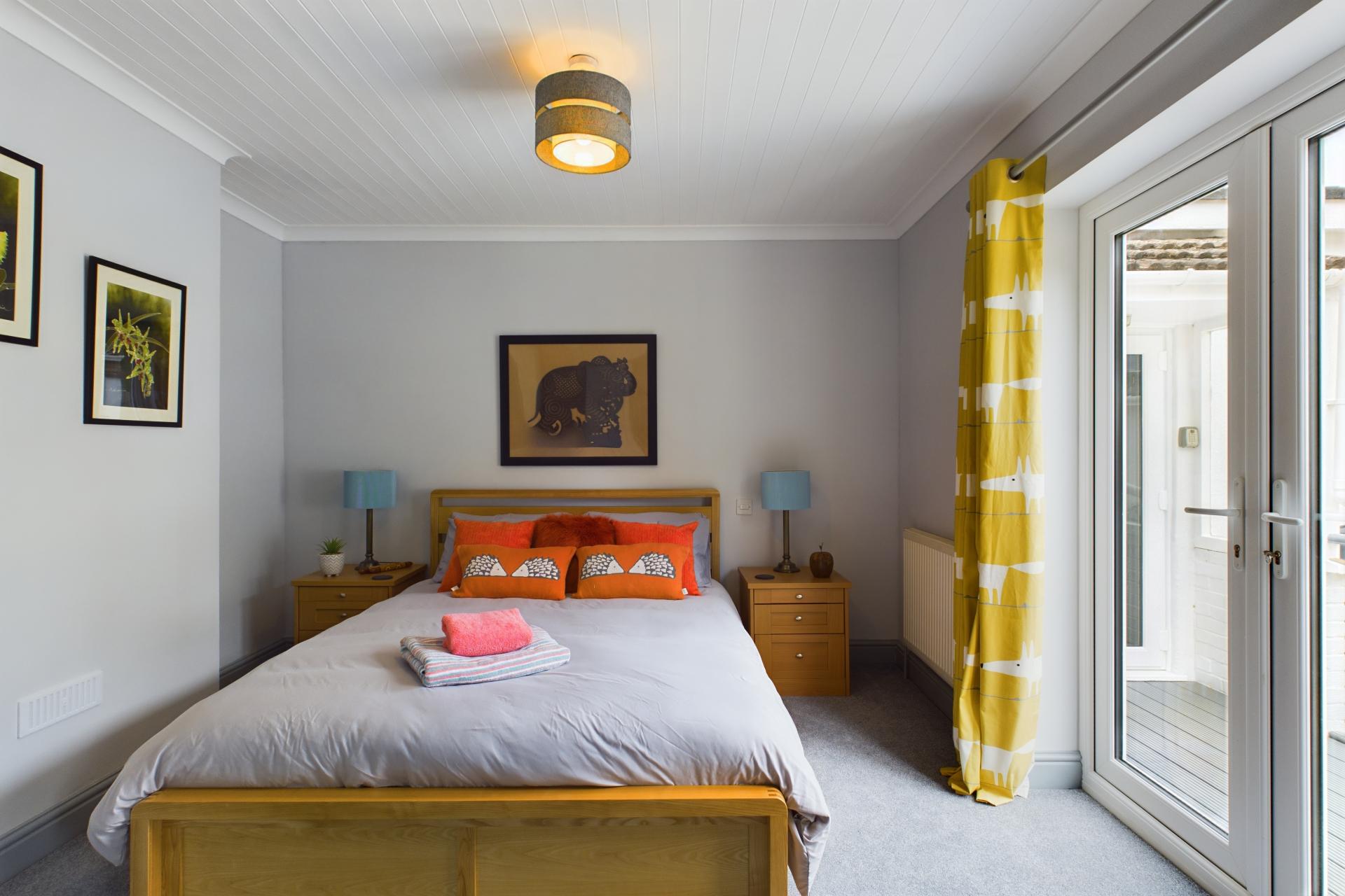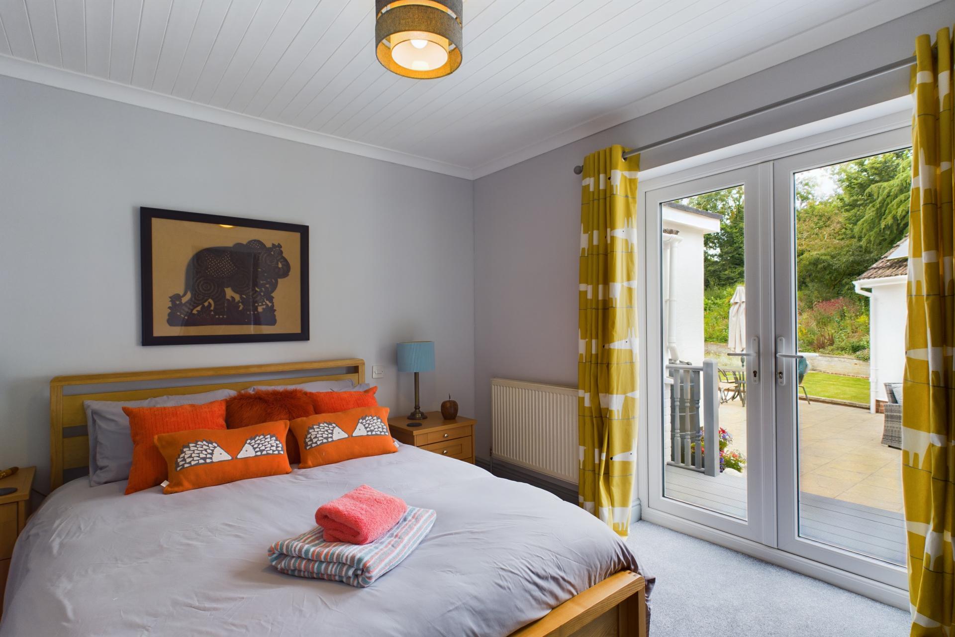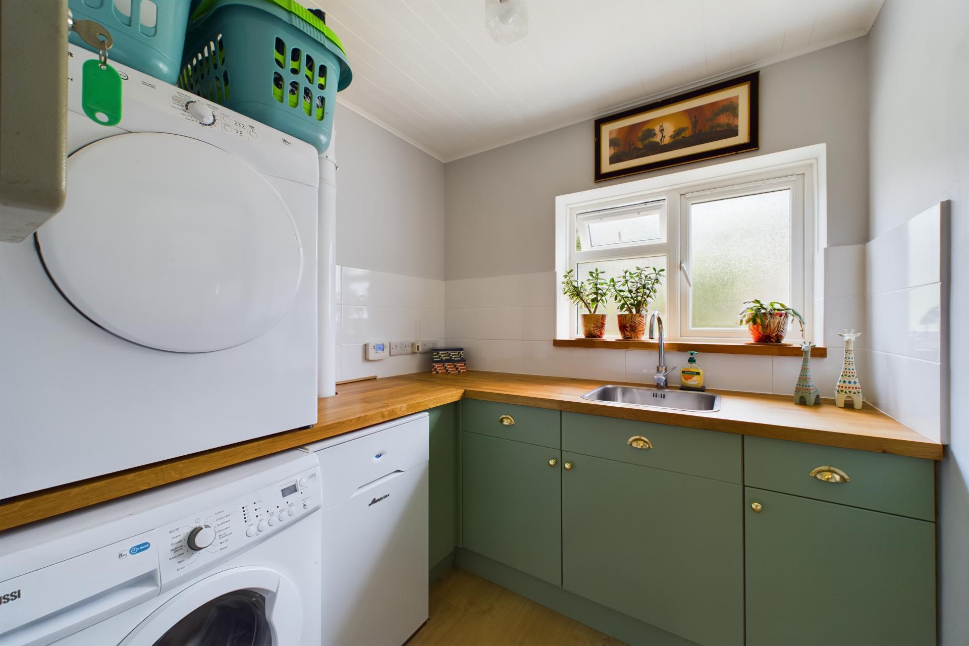 STEP INSIDE Upon entering Willowdene, you are greeted by a welcoming hallway that provides access to the ground floor accommodation. The property is fitted with radiators and plush carpets throughout, ensuring a warm and comfortable environment. The principal bedroom is located on the ground floor and features a large front-aspect window that allows natural light to flood the room. This bedroom is equipped with fitted mirrored wardrobes and an ensuite shower room, complete with a vanity sink unit and WC. On the opposite side of the hallway, you will find the spacious living and dining room, which boasts a charming log burner, perfect for cozy evenings. French doors from this area lead into the light and airy kitchen, which is well-appointed with fitted wall and floor units, hardwood countertops, and a central island with a breakfast bar. The kitchen is also equipped with an integrated dishwasher, boiling water tap, water softener, electric oven, and extractor fan. Adjacent to the kitchen is a utility room with space and plumbing for washing machine and tumbledryer as well as access to the convenient WC. There is also a coat cupboard next to the French doors, which open onto the decking and provide access to the patio. At the rear of the property, there is an additional double bedroom, featuring another set of French doors that open onto the decking. This bedroom is also equipped with a built-in wardrobe, making the room both practical and welcoming. The family bathroom on this floor includes a bath with a shower attachment, a WC, and a vanity sink unit.
