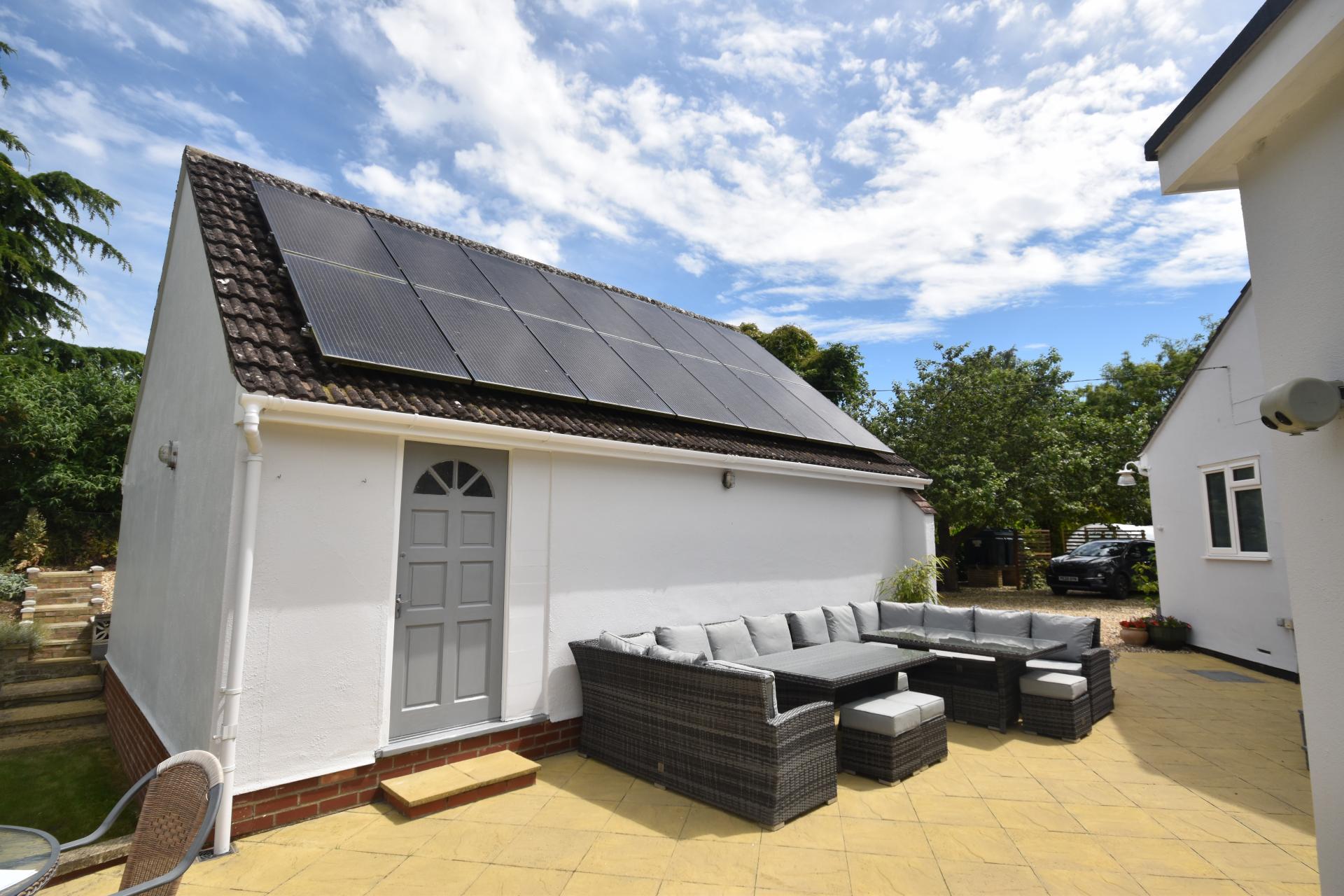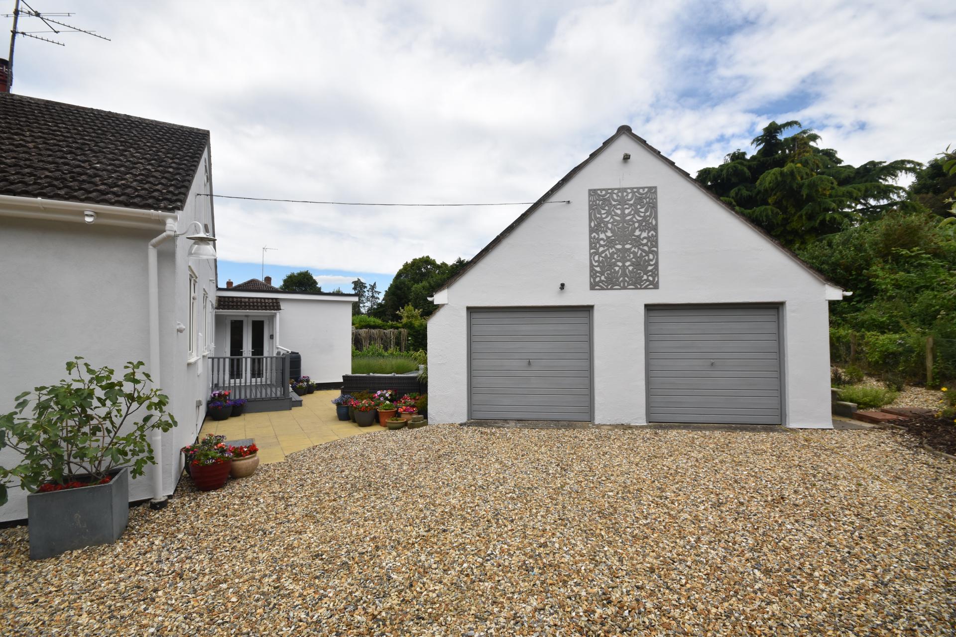 Across the patio lies the detached double garage, which features dividing walls at the back, previously used as a music recording studio, offering a straightforward conversion into an annex. Additionally, the property has approved planning permission to build an extension that would seamlessly join the main house to the garage, while maintaining the cohesive design of both structures.