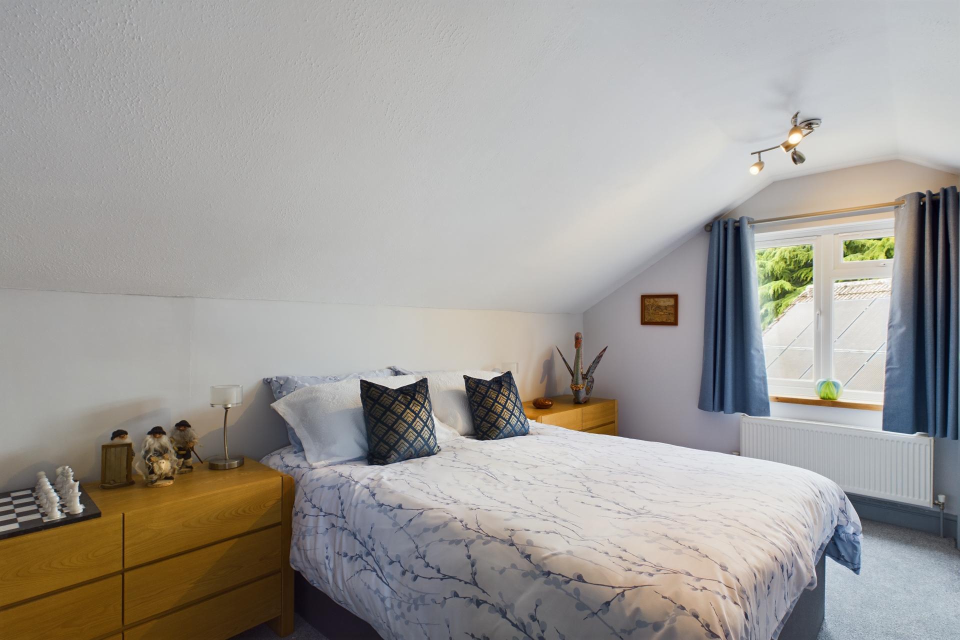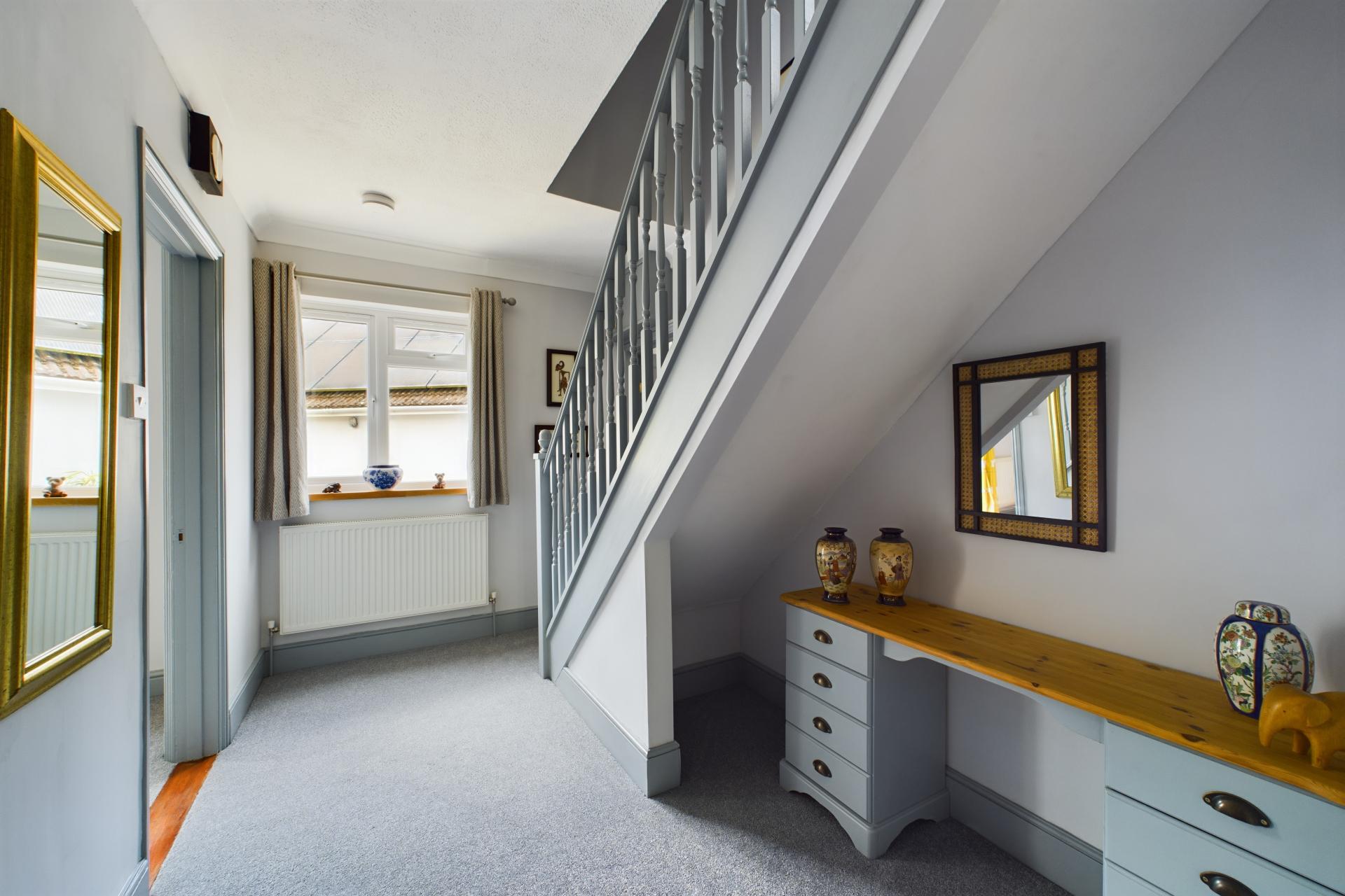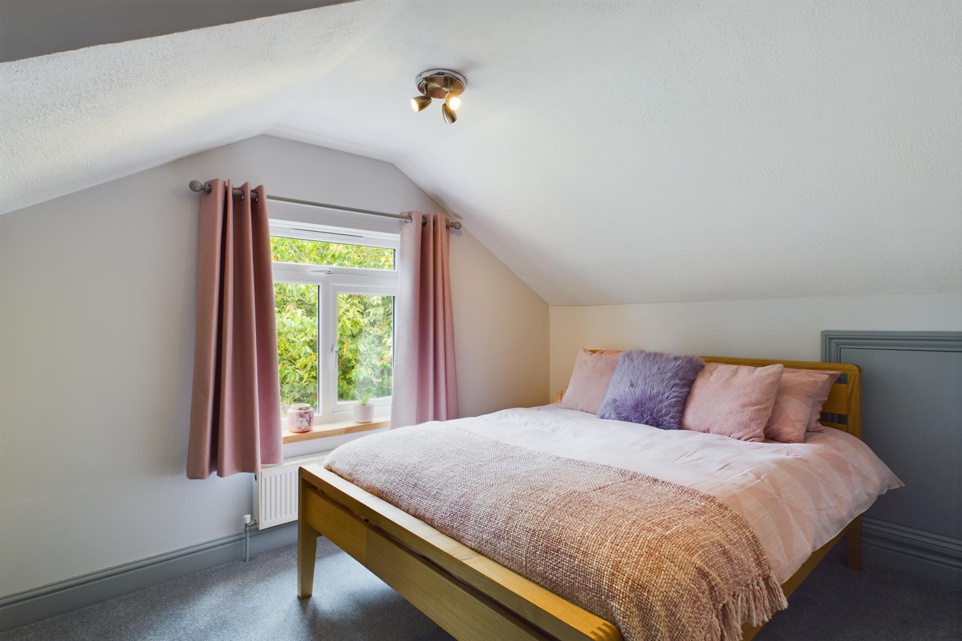 Upstairs, there are two further double bedrooms, each with under-eaves storage, built in wardrobes and windows that overlook the stunning gardens, providing picturesque views. This floor also contains a shower room with WC and vanity sink unit.