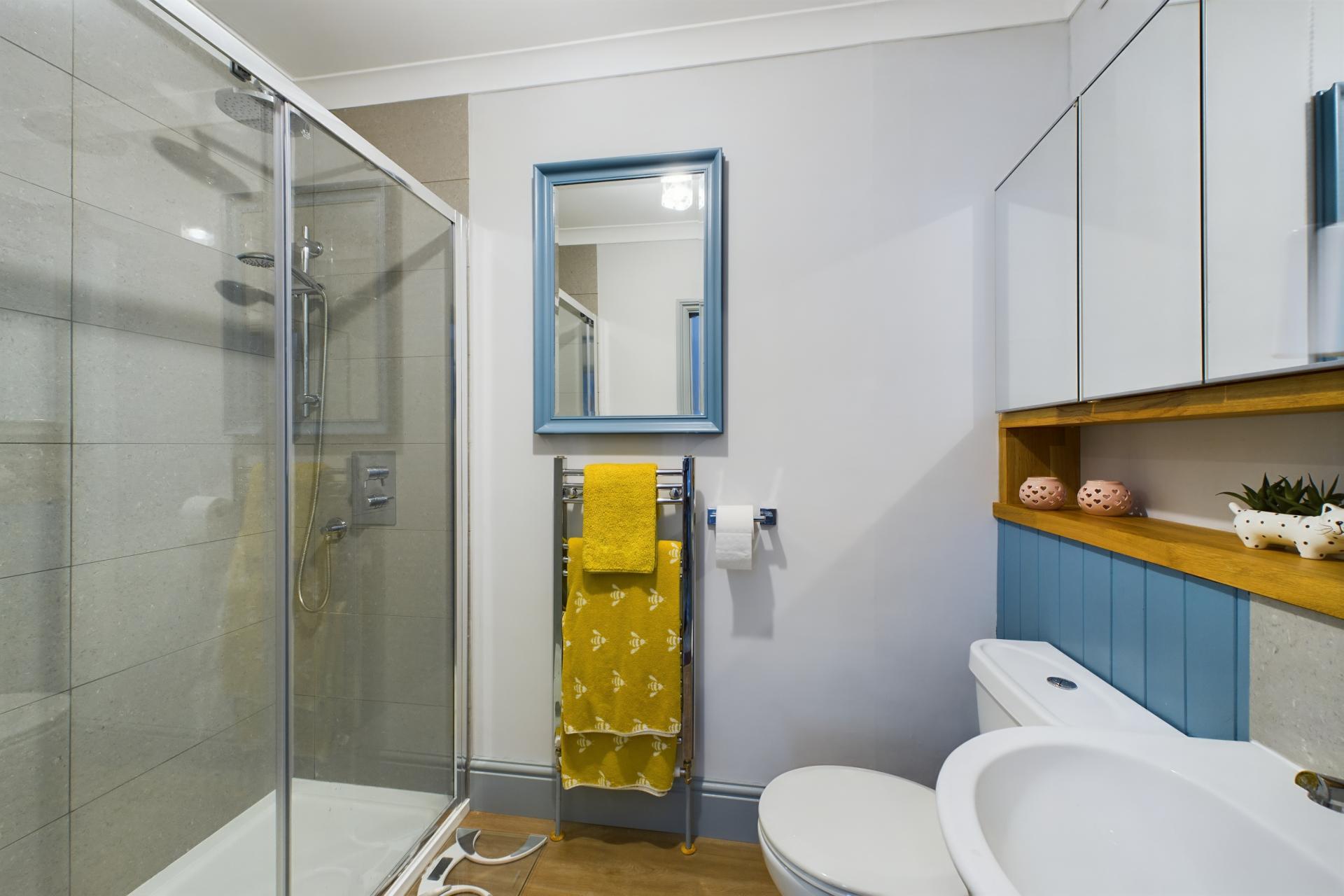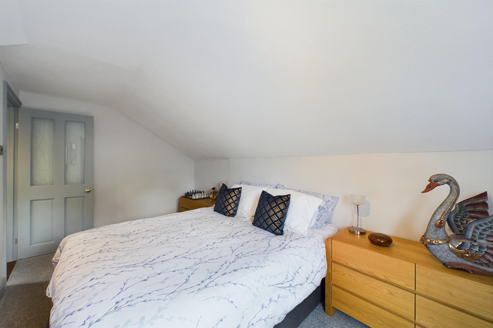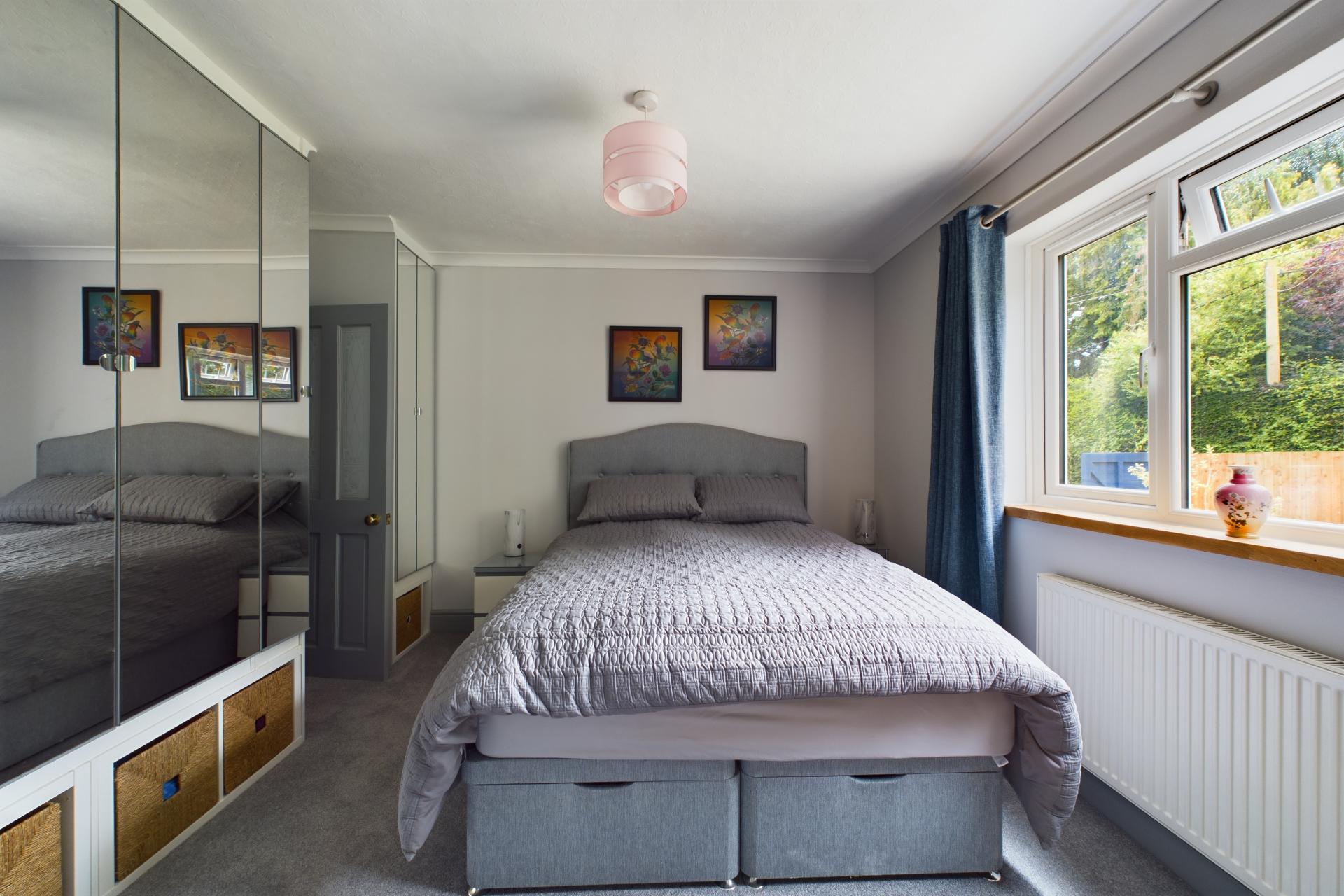 Upstairs, there are two further double bedrooms, each with under-eaves storage, built in wardrobes and windows that overlook the stunning gardens, providing picturesque views. This floor also contains a shower room with WC and vanity sink unit.