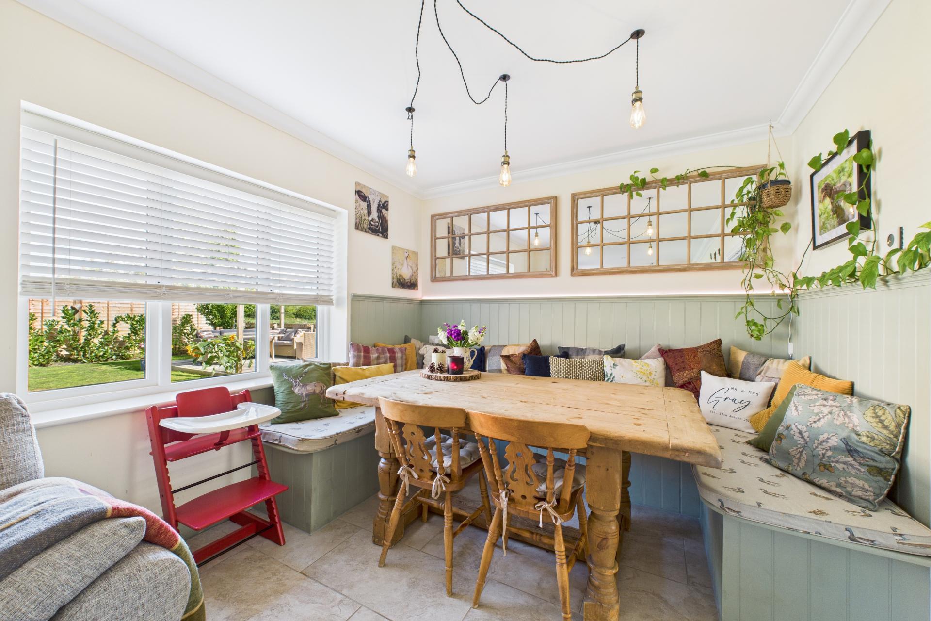 Kitchen/Dining Room – 33’ 7" x 15’ 8" (10.24m x 3.02m) A superb open-plan kitchen and dining area with two rear windows and patio doors leading directly into the garden. The dining area features bespoke built-in seating, while the kitchen is fitted with a range of wall and base units, work surfaces with inset sink and drainer, freestanding island, and Rangemaster cooker with extractor hood. Integrated appliances include dishwasher, fridge, and freezer. Finished with part-tiled walls, tiled flooring, and underfloor heating.