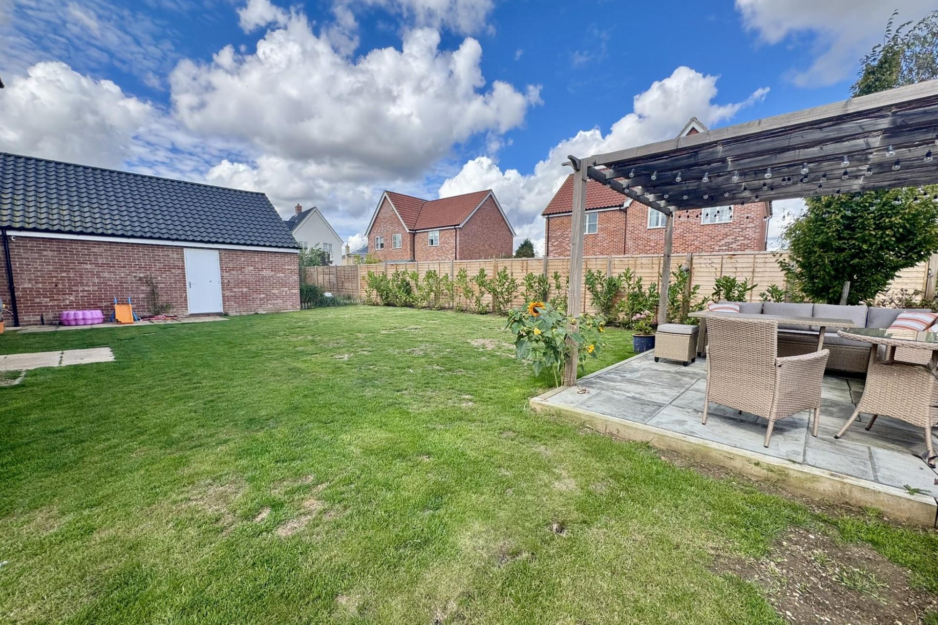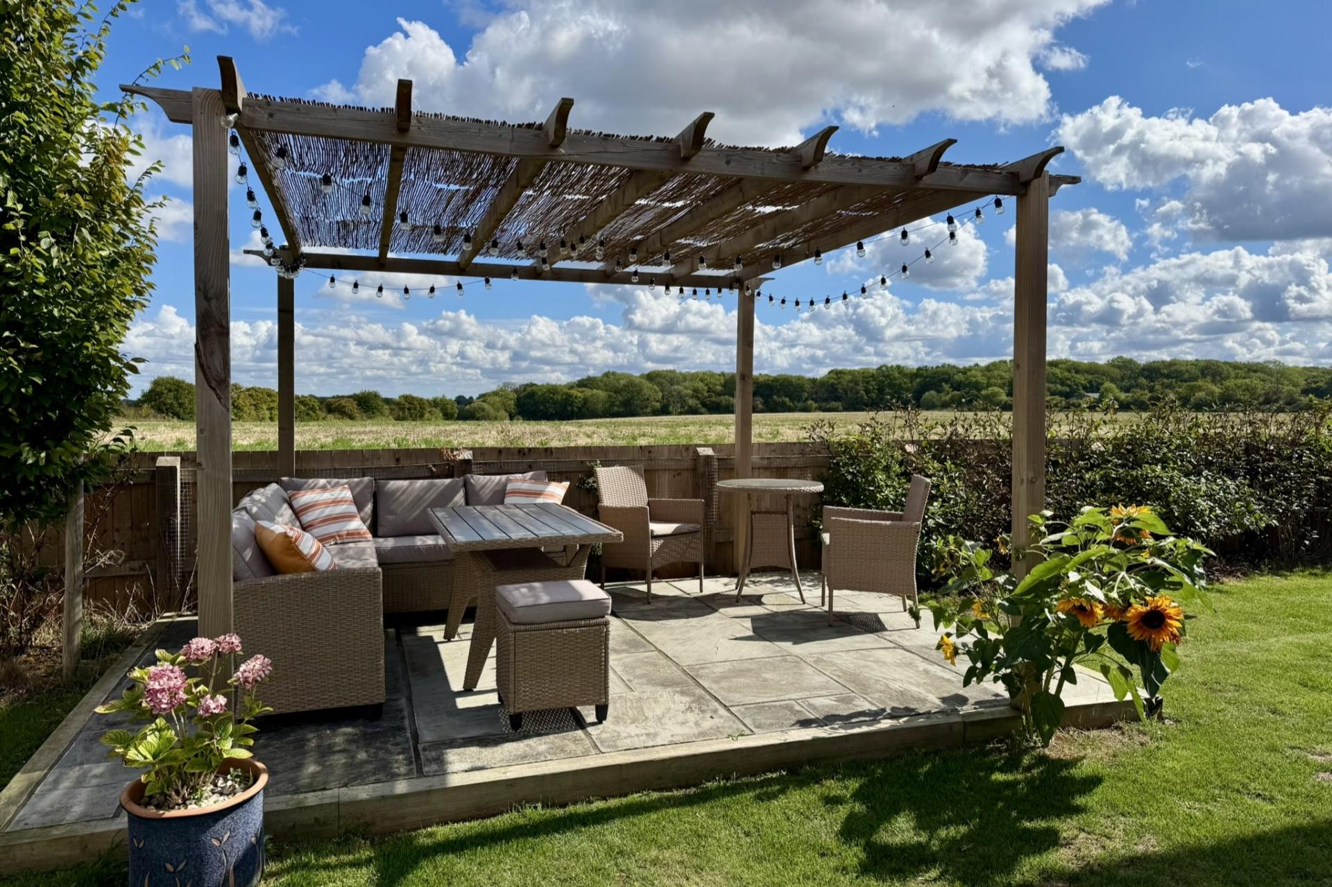 OUTSIDE The gardens are predominantly laid to lawn with neatly planted shrub borders, creating a pleasant and low-maintenance setting. A raised patio with pergola provides a superb outdoor seating and entertaining area, perfectly positioned to enjoy the far-reaching views across open fields. The rear garden also gives access to the double garage via a side door, with the garage itself benefiting from power, lighting and up-and-over doors.