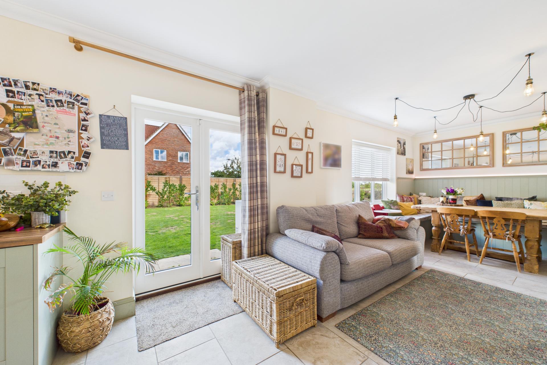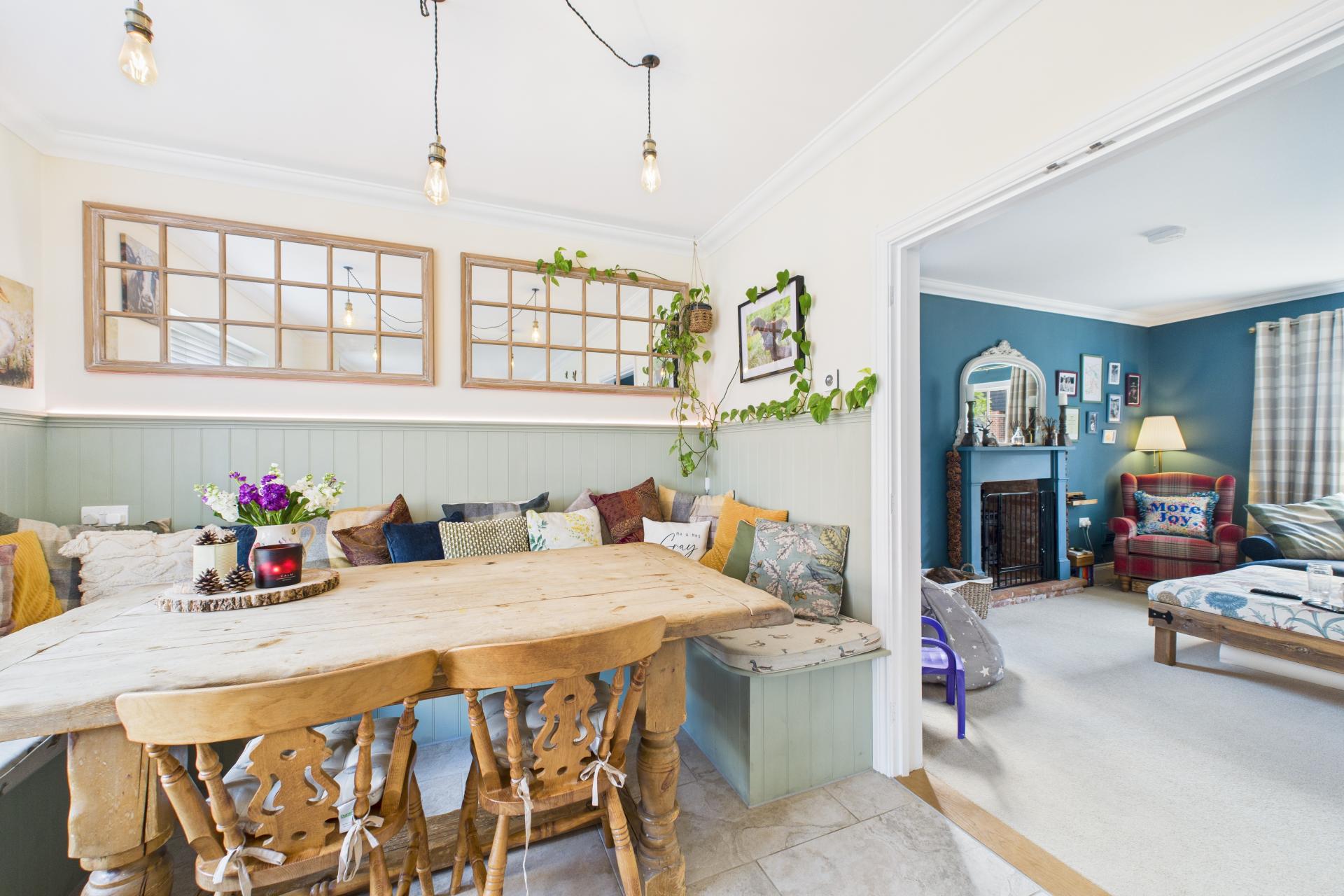 Living Room - 15' 6" x 16' 0" (4.89m x 4.73m) A bright and inviting space with a sash window to the front and an additional side window, allowing plenty of natural light. A brick fireplace with inset wood-burning stove creates a cosy focal point, complemented by underfloor heating. Double doors open through to the dining area, making it ideal for family living or entertaining.