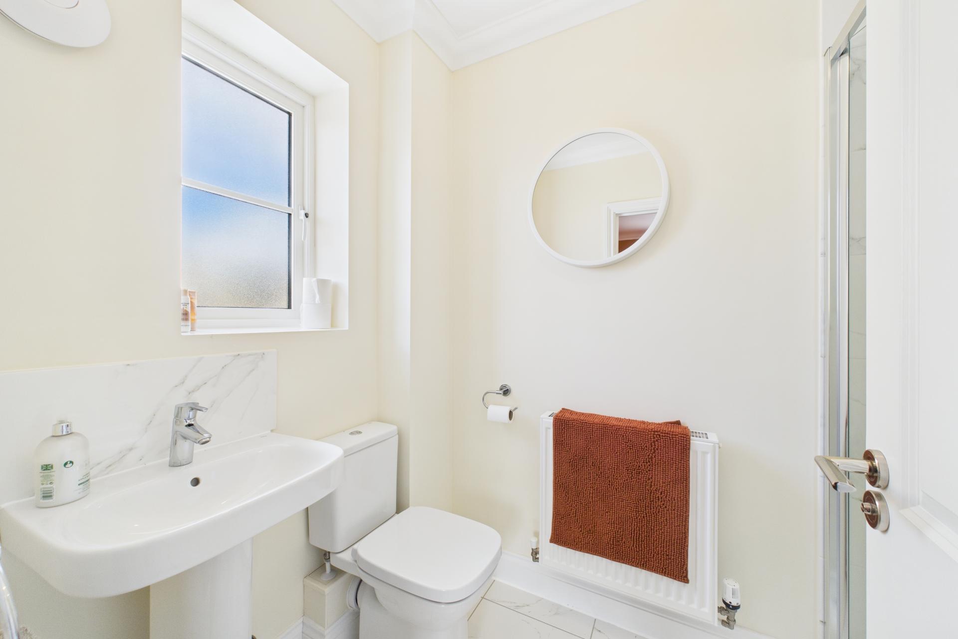 Ensuite - 5’ 0" x 4’ 10" (1.53m x 1.49m) Modern ensuite with side window, shower cubicle, WC, wash hand basin, part-tiled walls with contemporary white tiling, tiled flooring, and radiator.