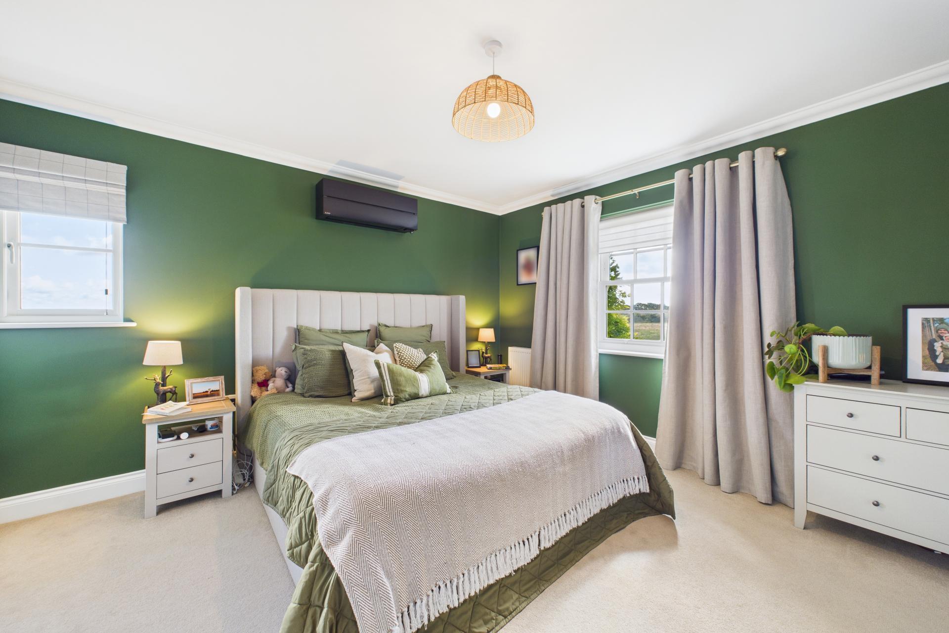 Master Bedroom - 14' 0" x 13' 8" (4.29m x 4.18m) A generous principal bedroom with air conditioning unit, sash window to the front and additional side window, fitted wardrobes, and radiator. Door leads to the ensuite.