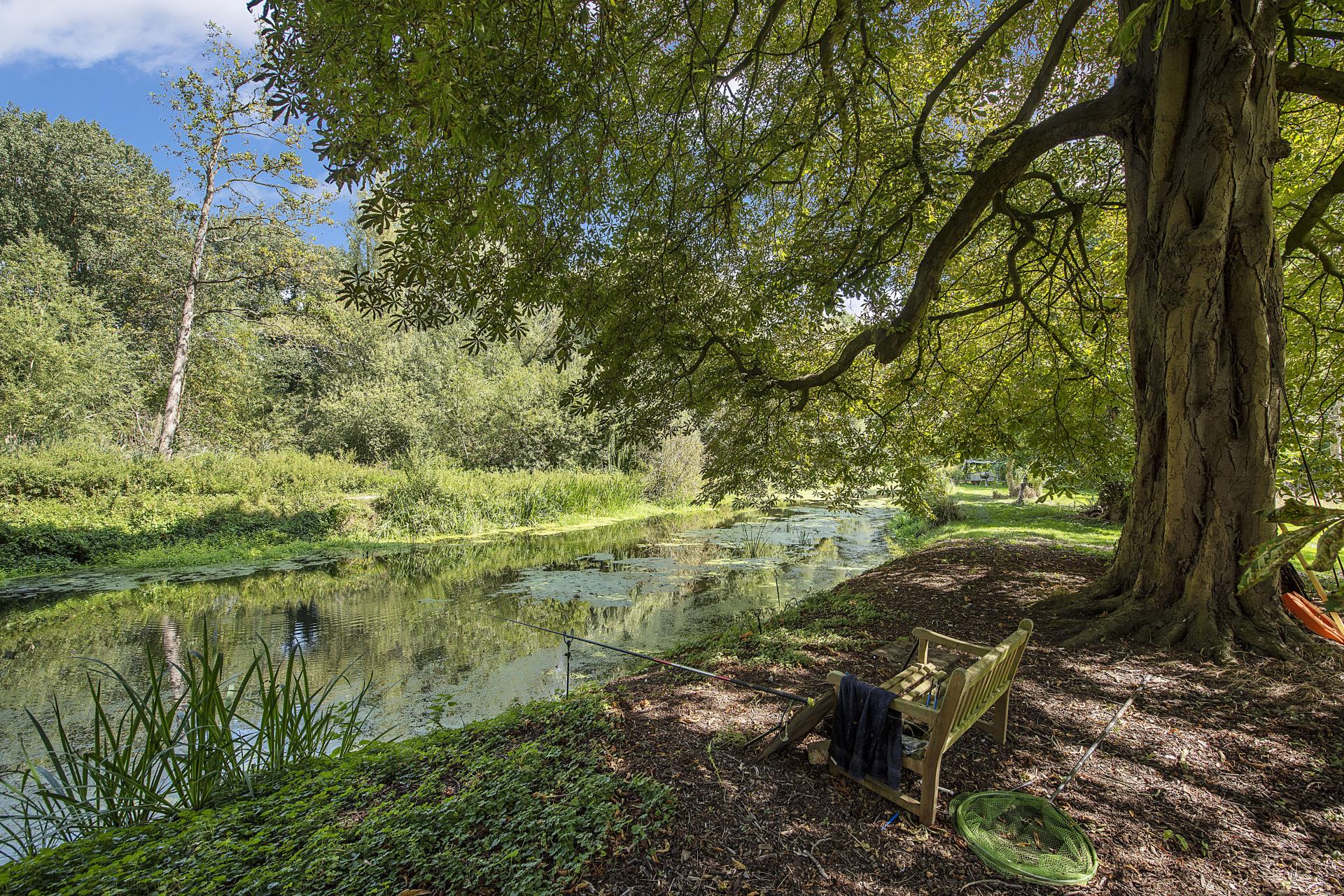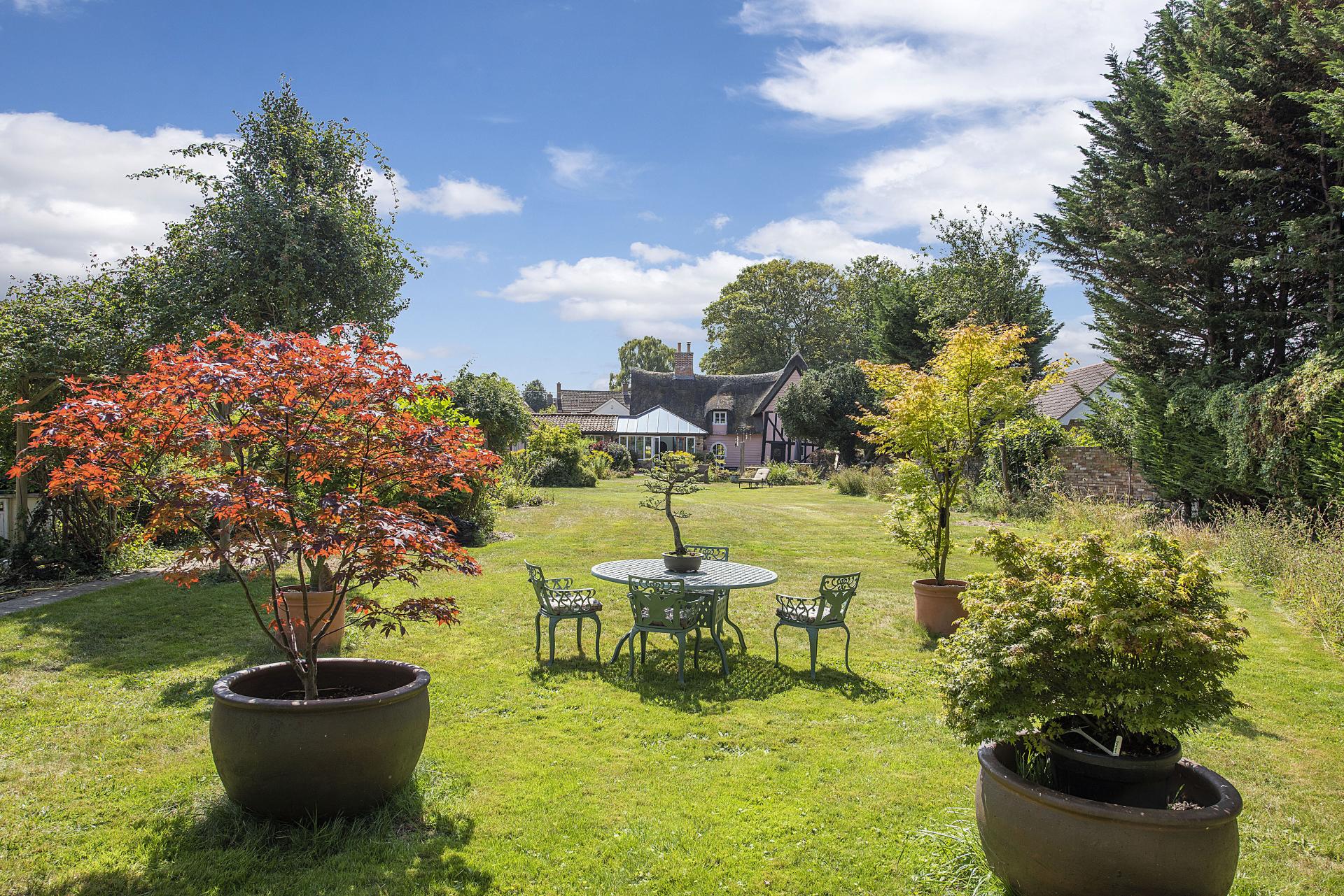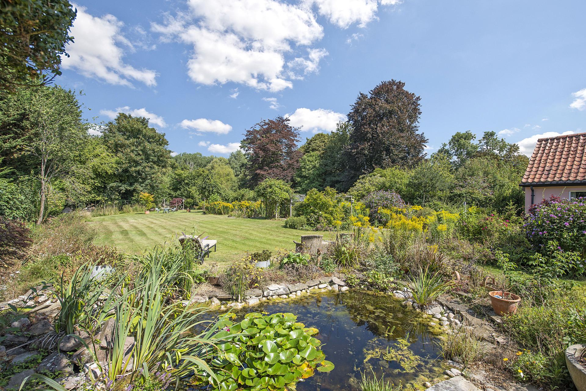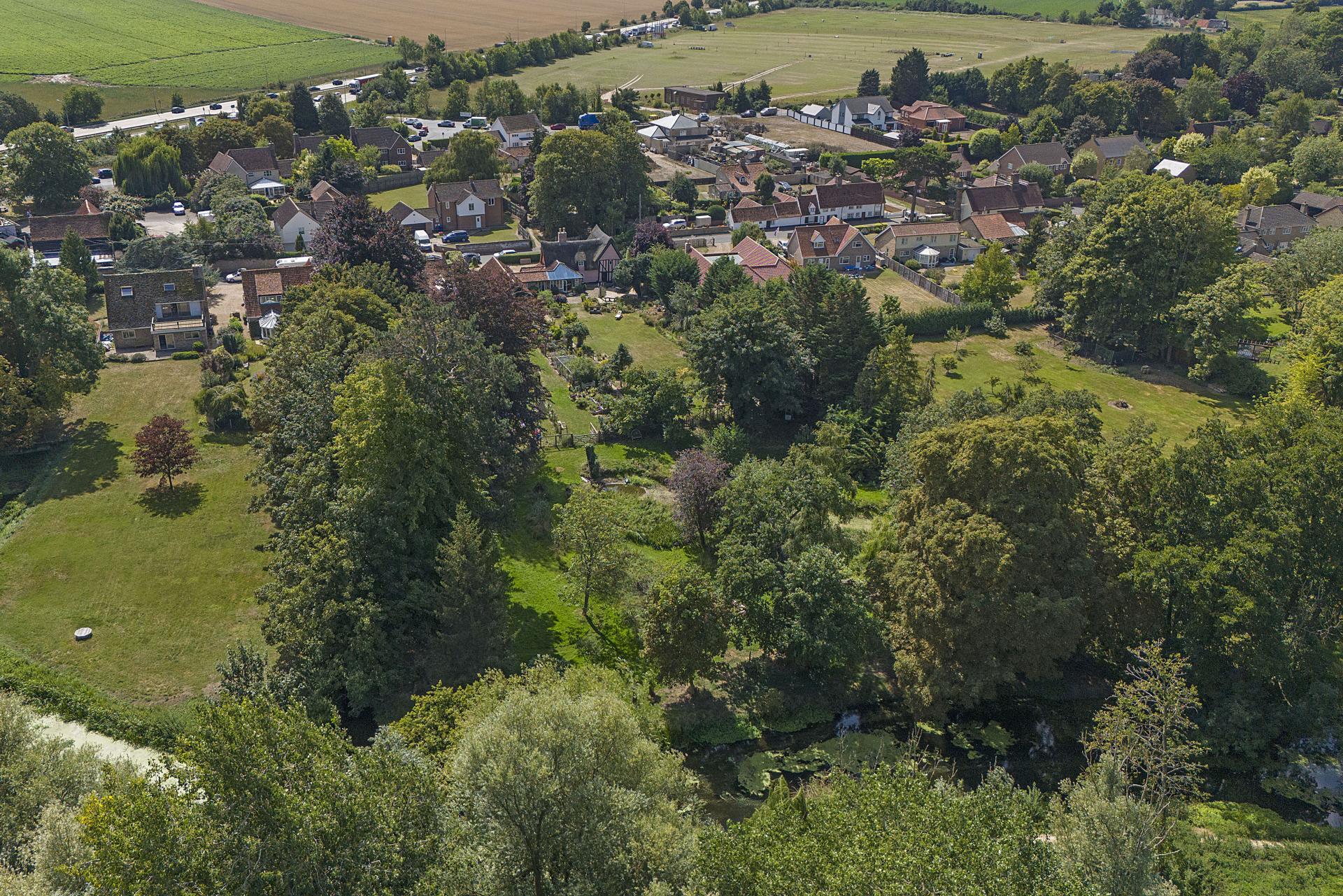 STEP OUTSIDE Approached through a thatched lych gate and cottage garden, the property benefits from a generous driveway and garage. To the rear, landscaped gardens unfold with lawns, a paved terrace, and ornamental ponds, extending to the River Lark with mooring and fishing rights. The riverbank, rich in wildlife, is frequently visited by otters and deer, while in the summer months the clear waters reveal fish such as chub, pike, and roach. A secluded "Secret Garden" with rose beds and seating offers a peaceful retreat, complemented by the adjacent cedar greenhouse, productive vegetable beds, and an array of fruit trees. Mature and newly planted trees further enhance the grounds, providing both privacy and seasonal interest.