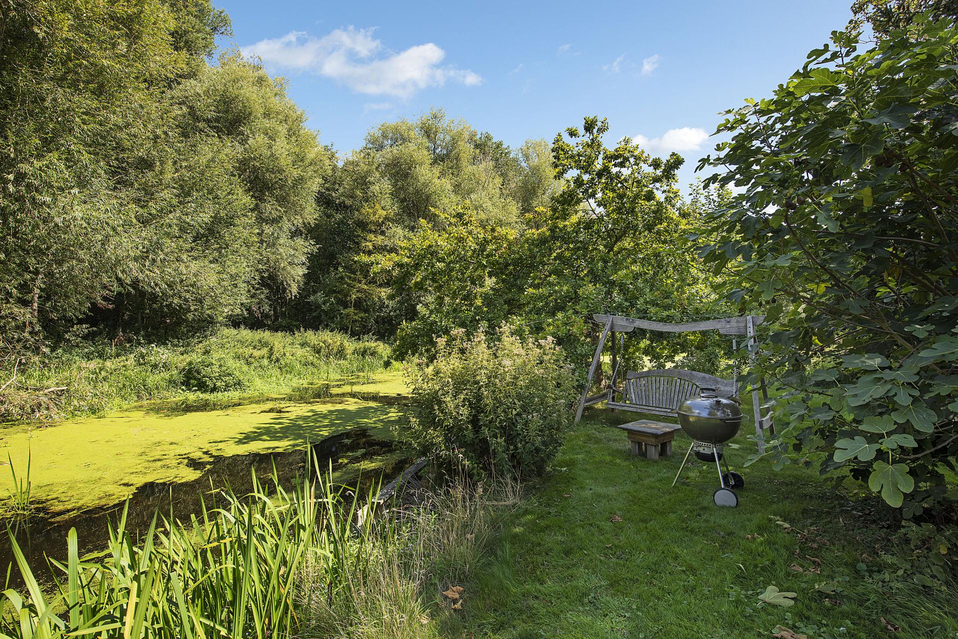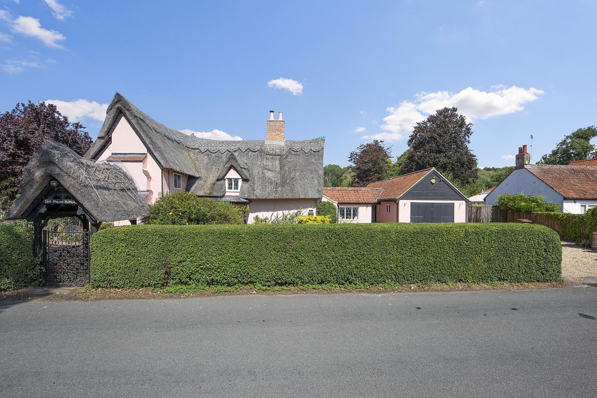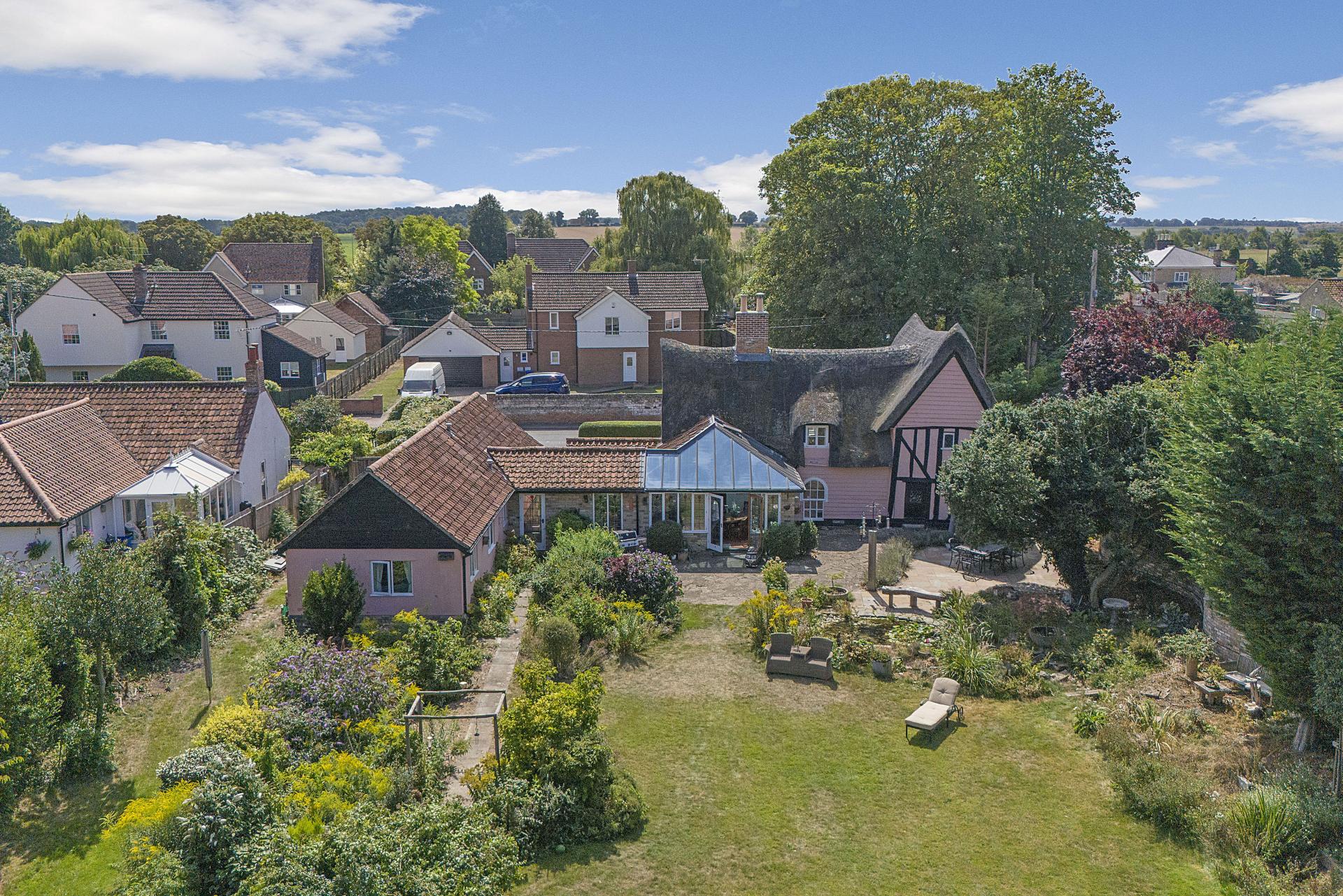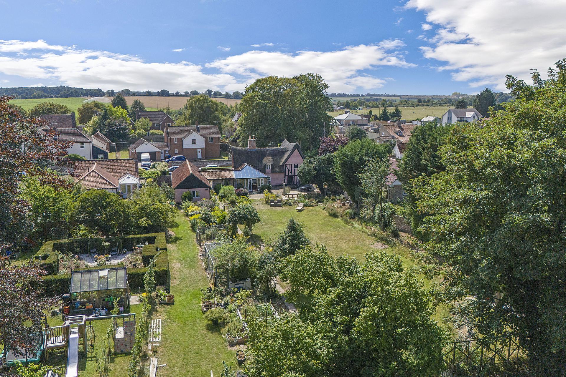STEP OUTSIDE Approached through a thatched lych gate and cottage garden, the property benefits from a generous driveway and garage. To the rear, landscaped gardens unfold with lawns, a paved terrace, and ornamental ponds, extending to the River Lark with mooring and fishing rights. The riverbank, rich in wildlife, is frequently visited by otters and deer, while in the summer months the clear waters reveal fish such as chub, pike, and roach. A secluded "Secret Garden" with rose beds and seating offers a peaceful retreat, complemented by the adjacent cedar greenhouse, productive vegetable beds, and an array of fruit trees. Mature and newly planted trees further enhance the grounds, providing both privacy and seasonal interest.